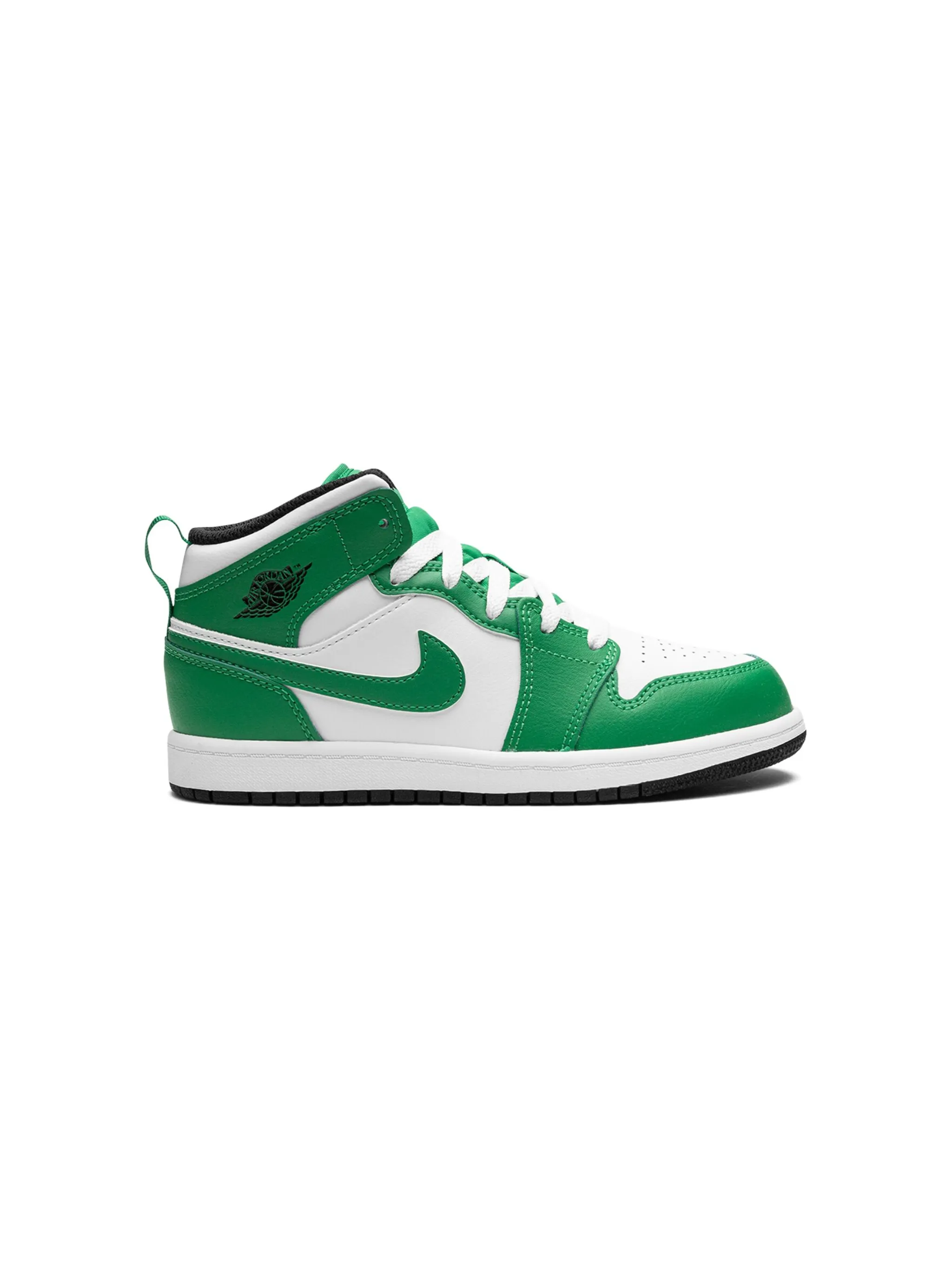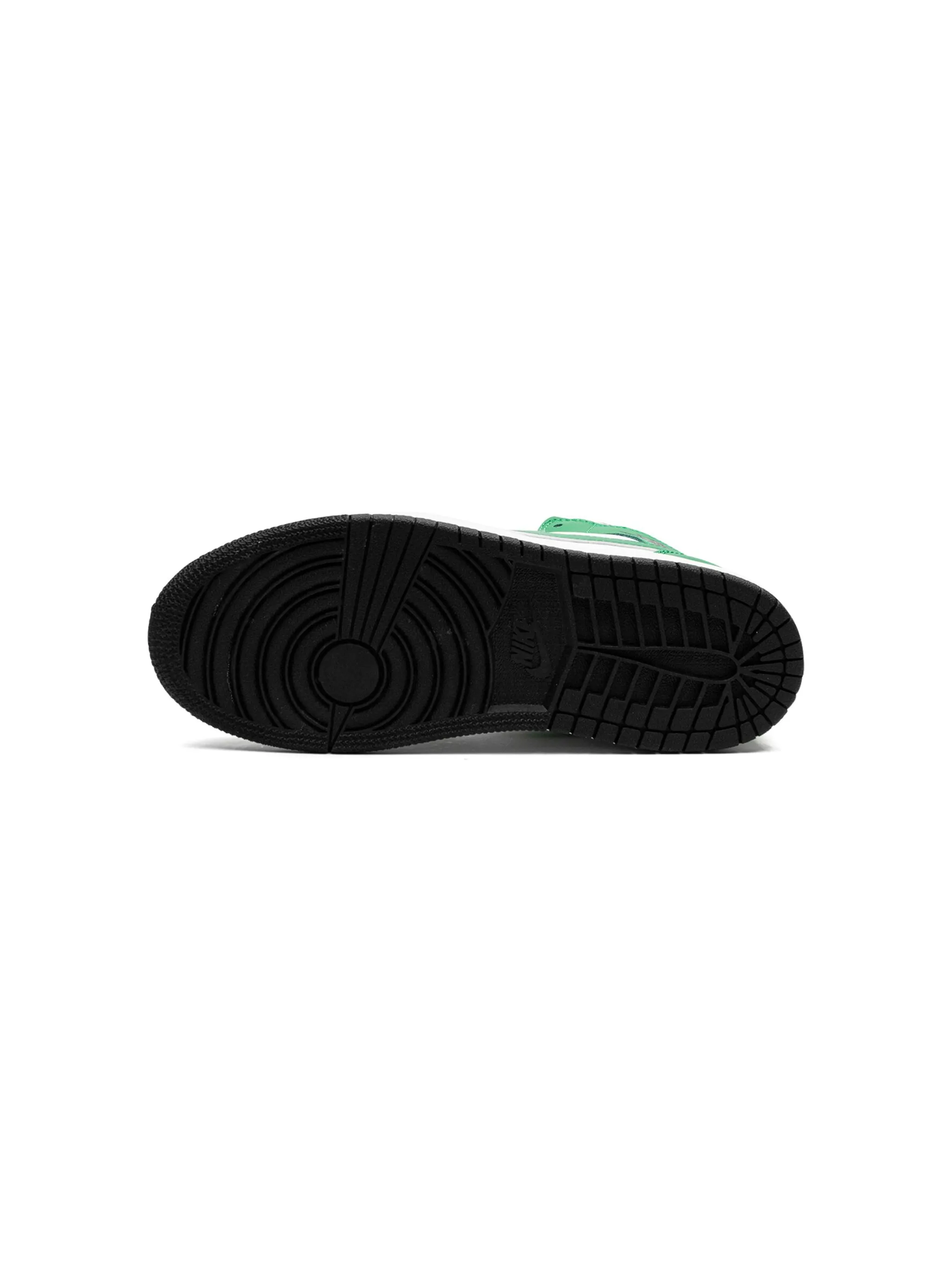 Белый, зеленый, логотип Nike Swoosh, логотип Jumpman, логотип Air Jordan Wings, закругленный носок, шнуровка спереди, нашивка с логотипом на язычке, петля для подтягивания сзади и плоская резиновая подошва.