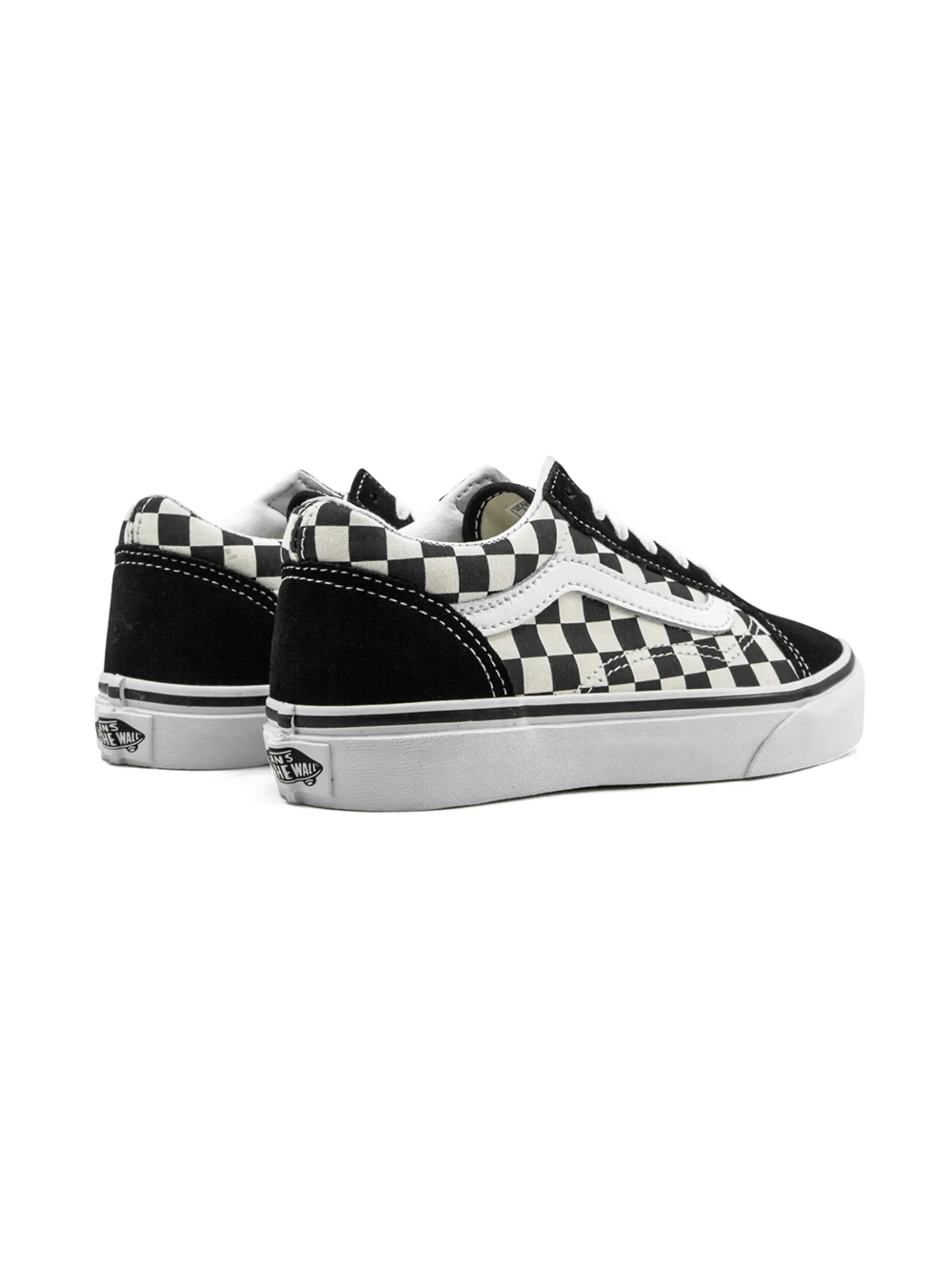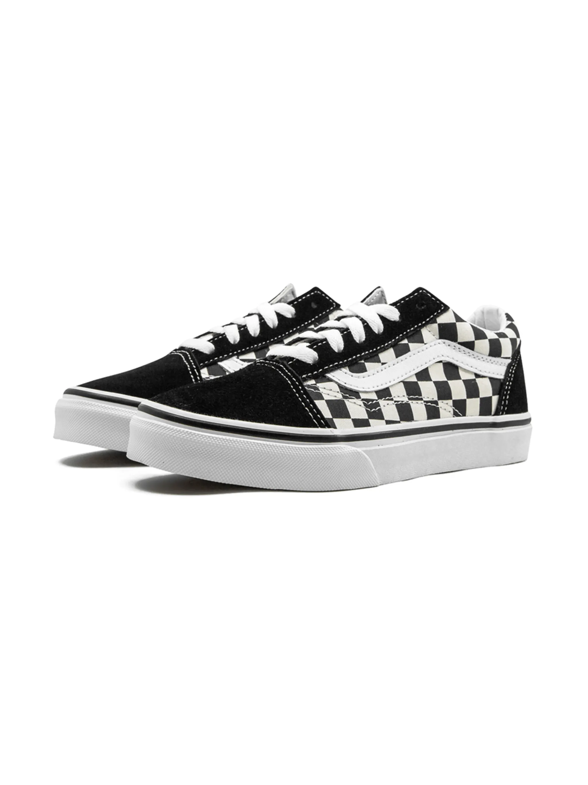 Кроссовки Old Skool от Vans Kids. Закругленный носок, шнуровка спереди, клетчатый узор, полоски сбоку, контрастная стойка на каблуке и белая резиновая подошва.