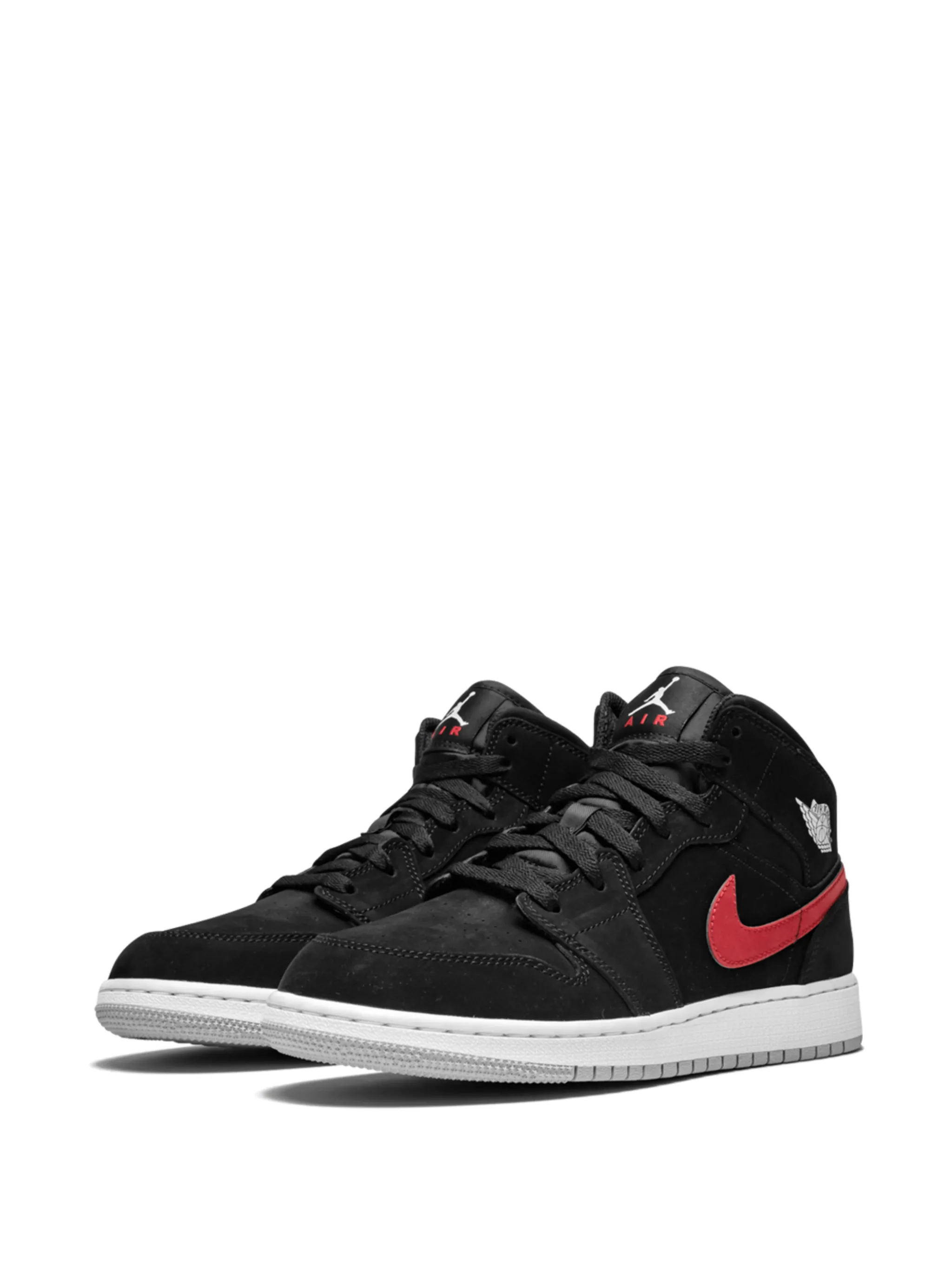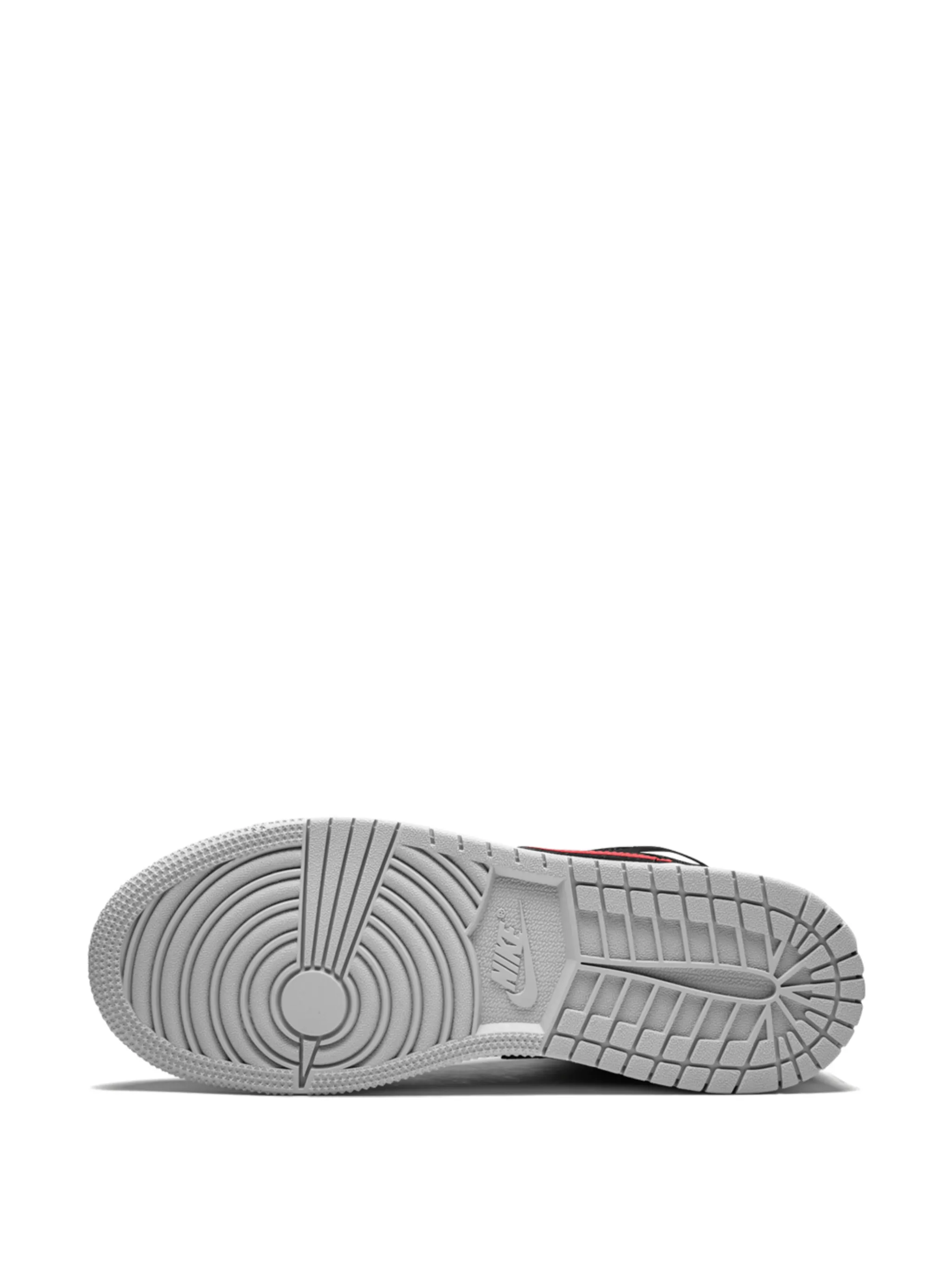 Кроссовки Air Jordan 1 Mid от Jordan. Закругленный носок, шнуровка спереди, заплатка с логотипом на язычке, фирменная галочка Nike и белая резиновая подошва.