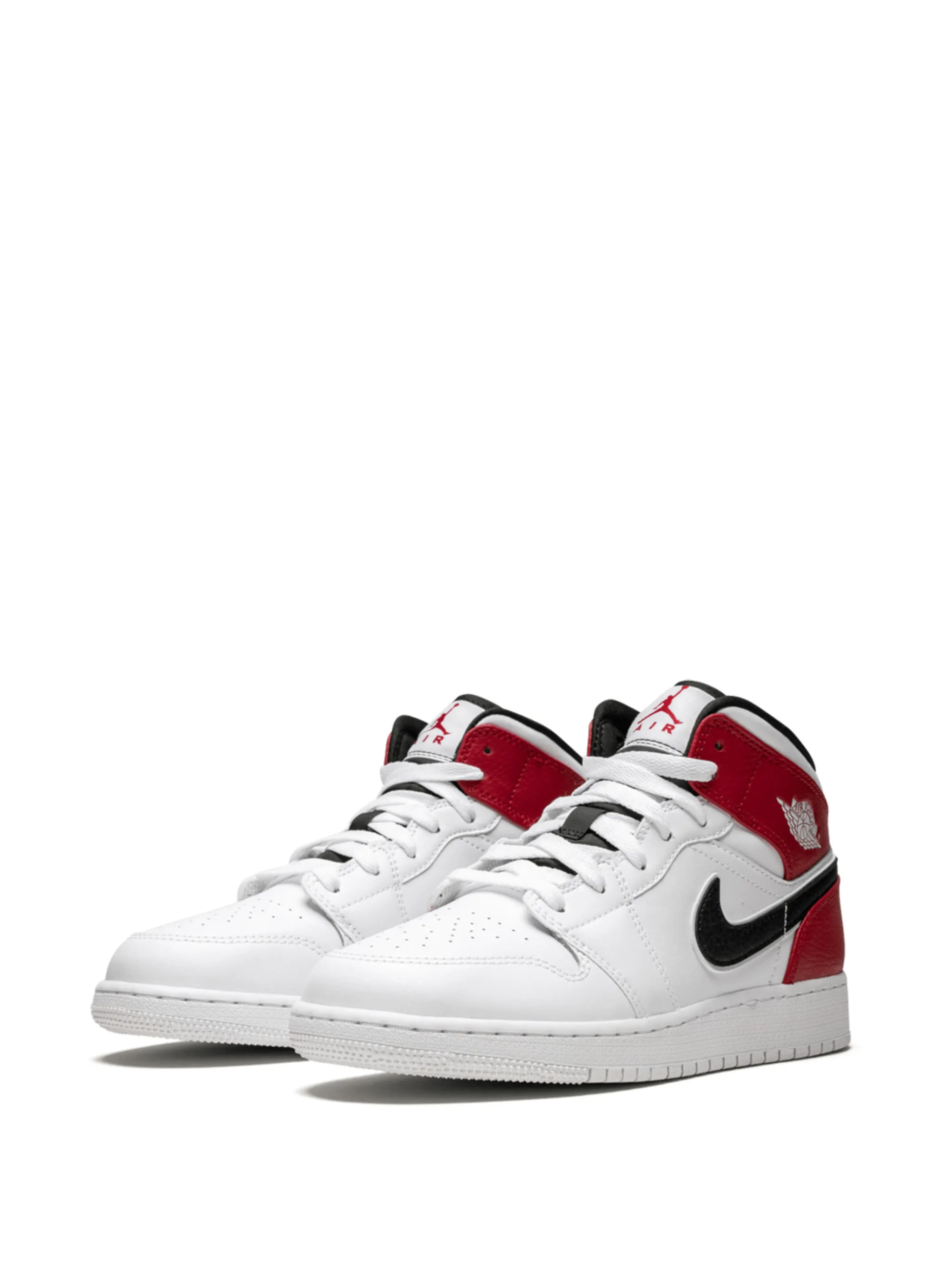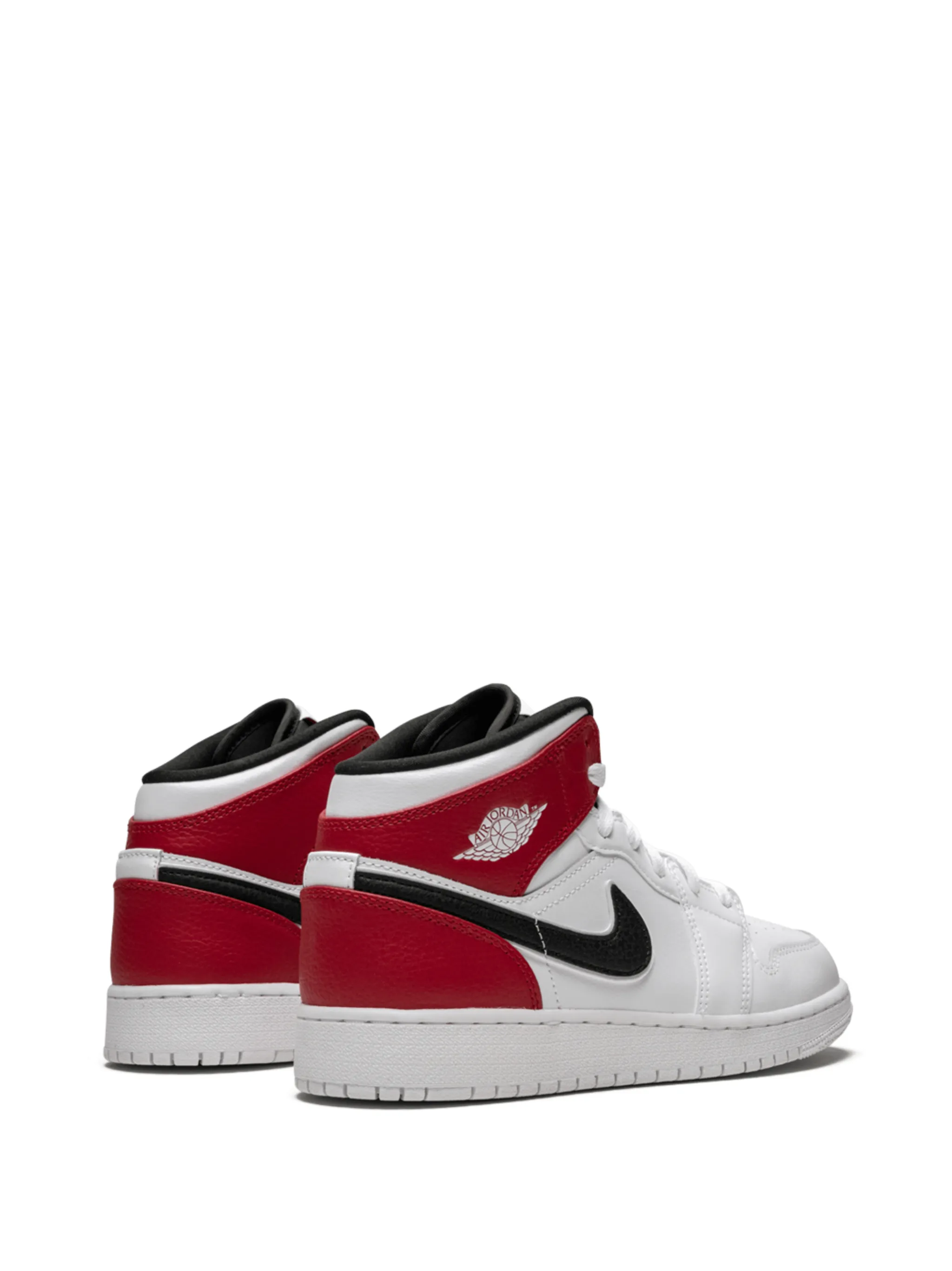 Кожаные кроссовки Air Jordan 1 Mid белого, черного и красного цвета от Jordan. Длина по щиколотку, шнуровка спереди, закругленный носок и логотип Nike Swoosh.