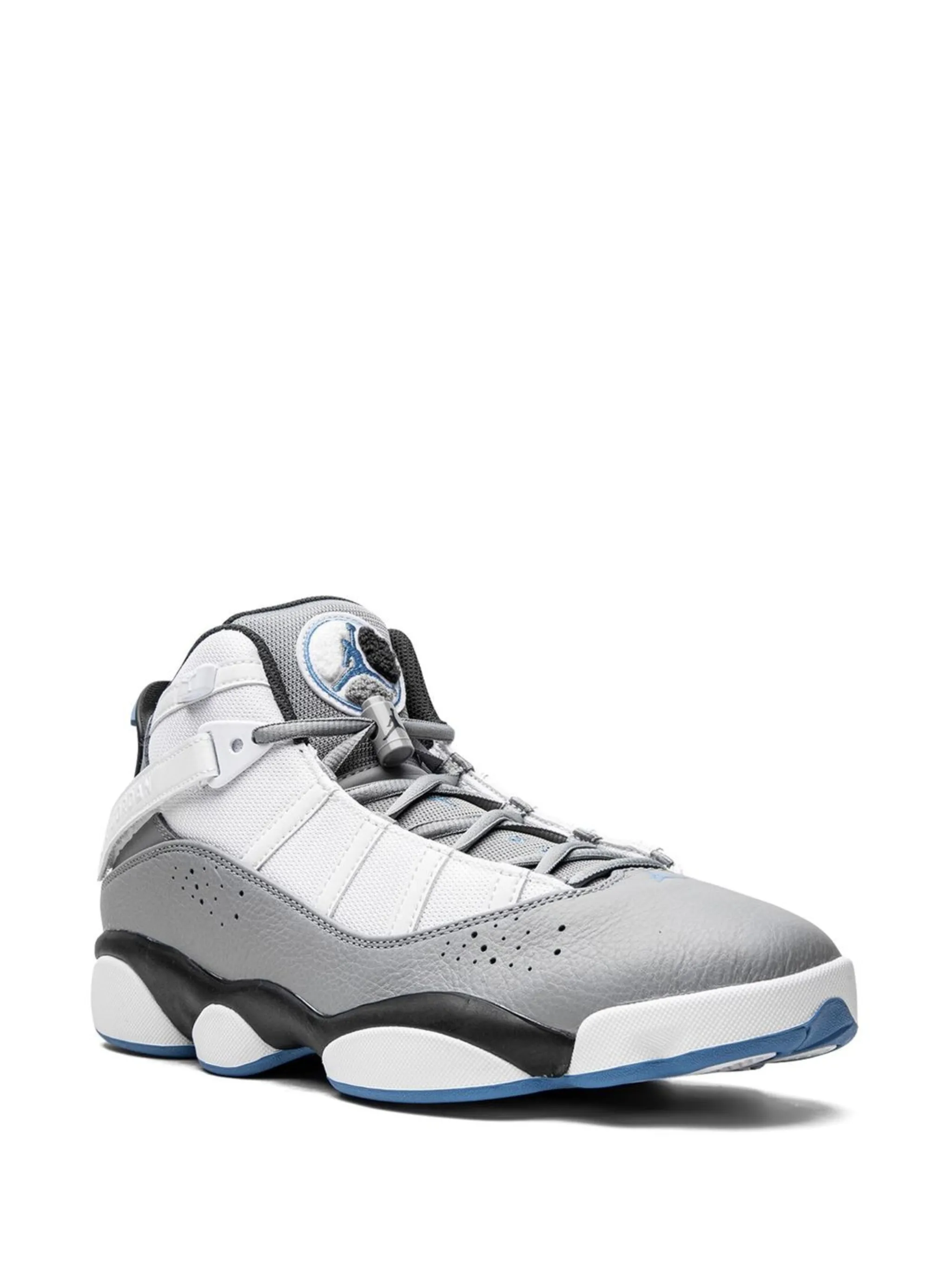 Белый, серый, синий, кожа, логотип Jumpman, закругленный носок, шнуровка спереди, нашивка с логотипом на язычке, петля для подтягивания сзади, стелька с логотипом и резиновая подошва.