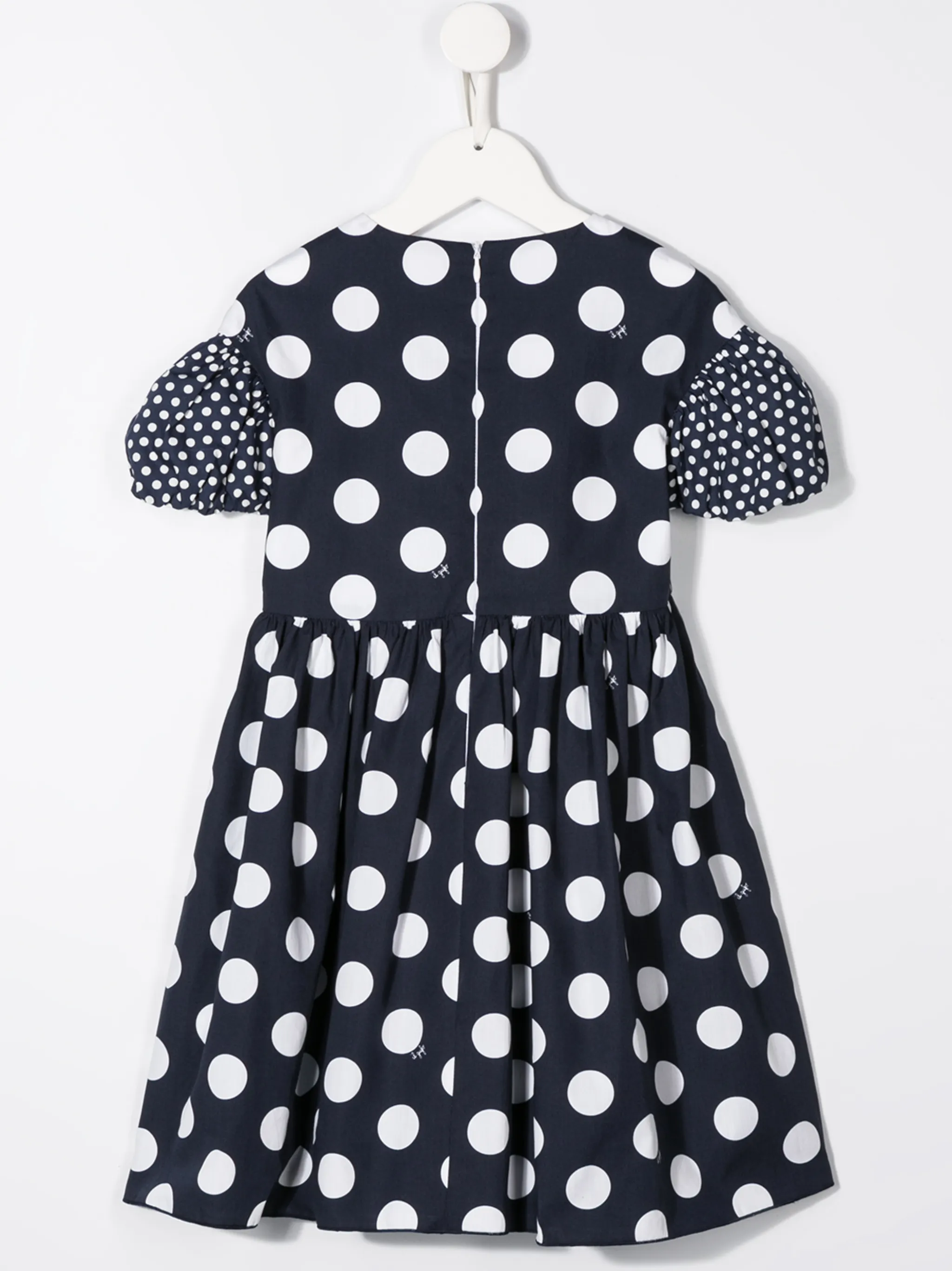 Платье миди в горох от Il Gufo. Круглый вырез, короткие рукава, узор в горох, контрастные панели и застежка на молнии сзади.