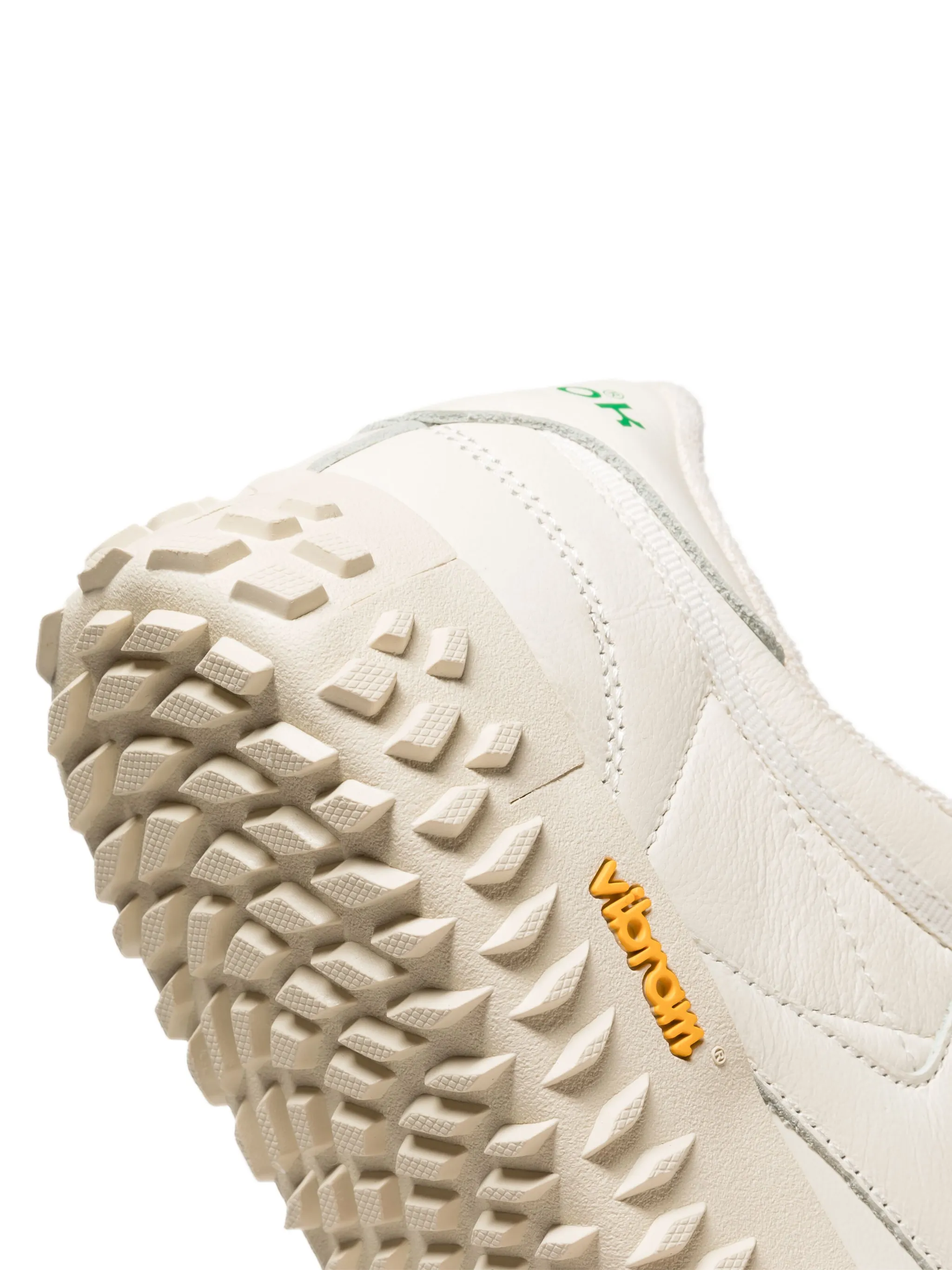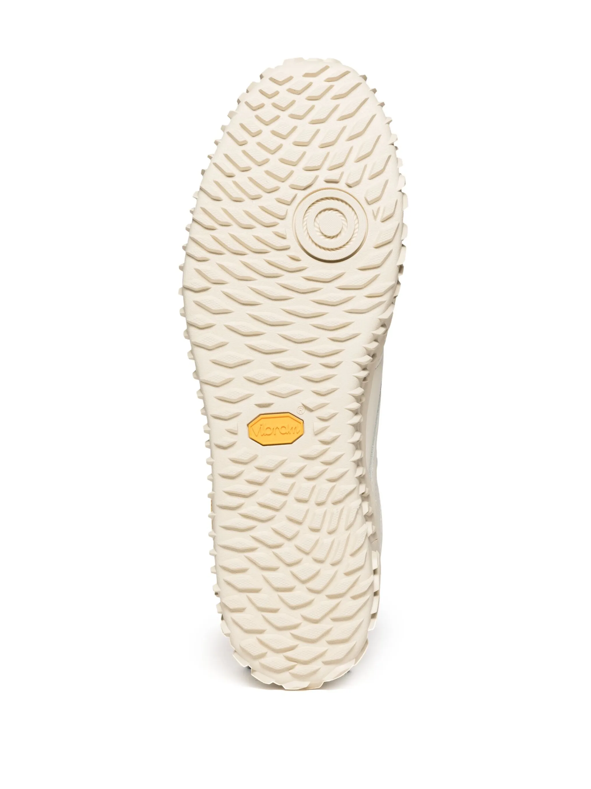 Серовато-белый, кожа, вставки, нашивка с логотипом сбоку, задник с логотипом, нашивка с логотипом на язычке, шнуровка спереди, перфорированный носок, закругленный носок и подошва Vibram.