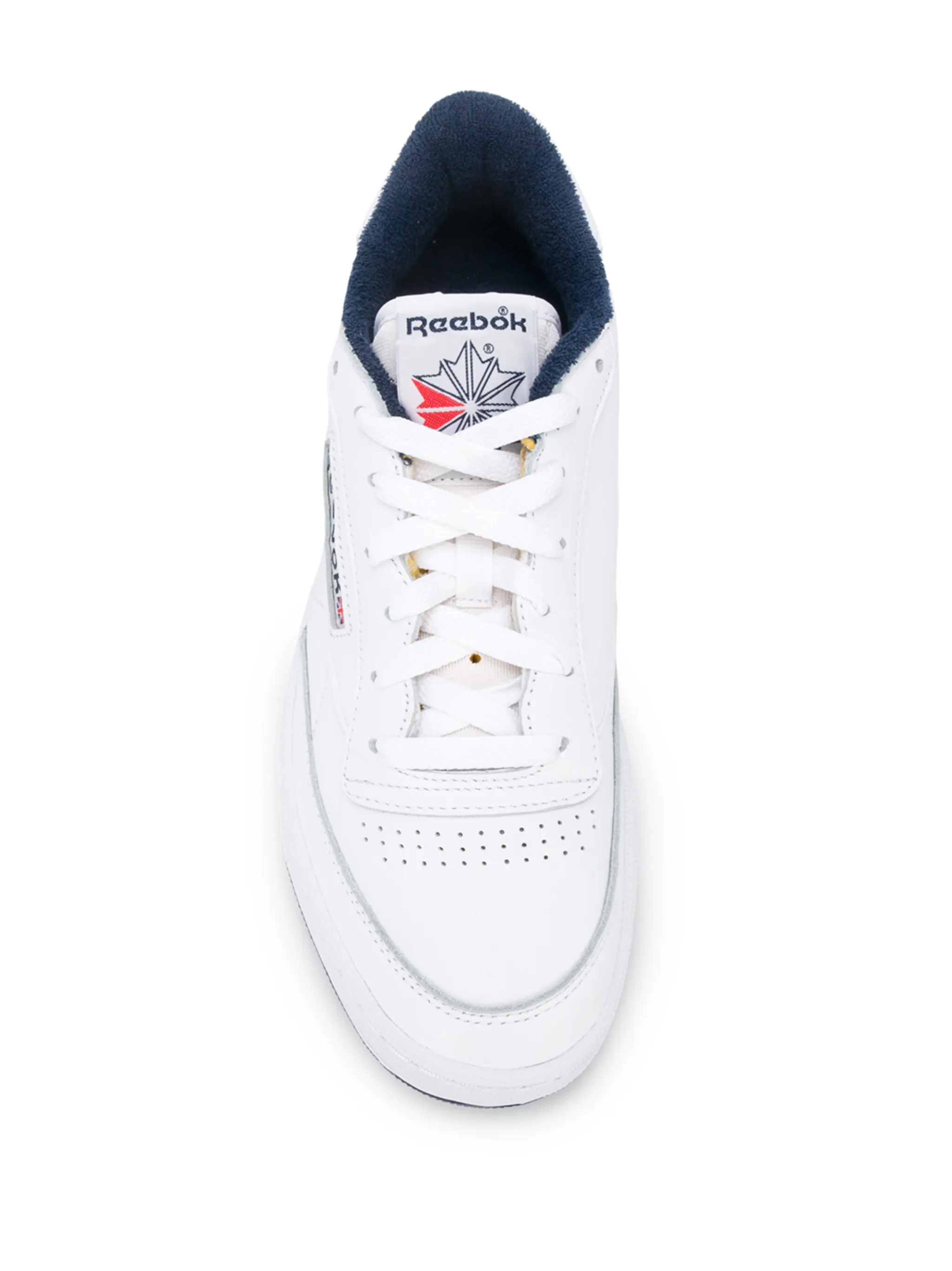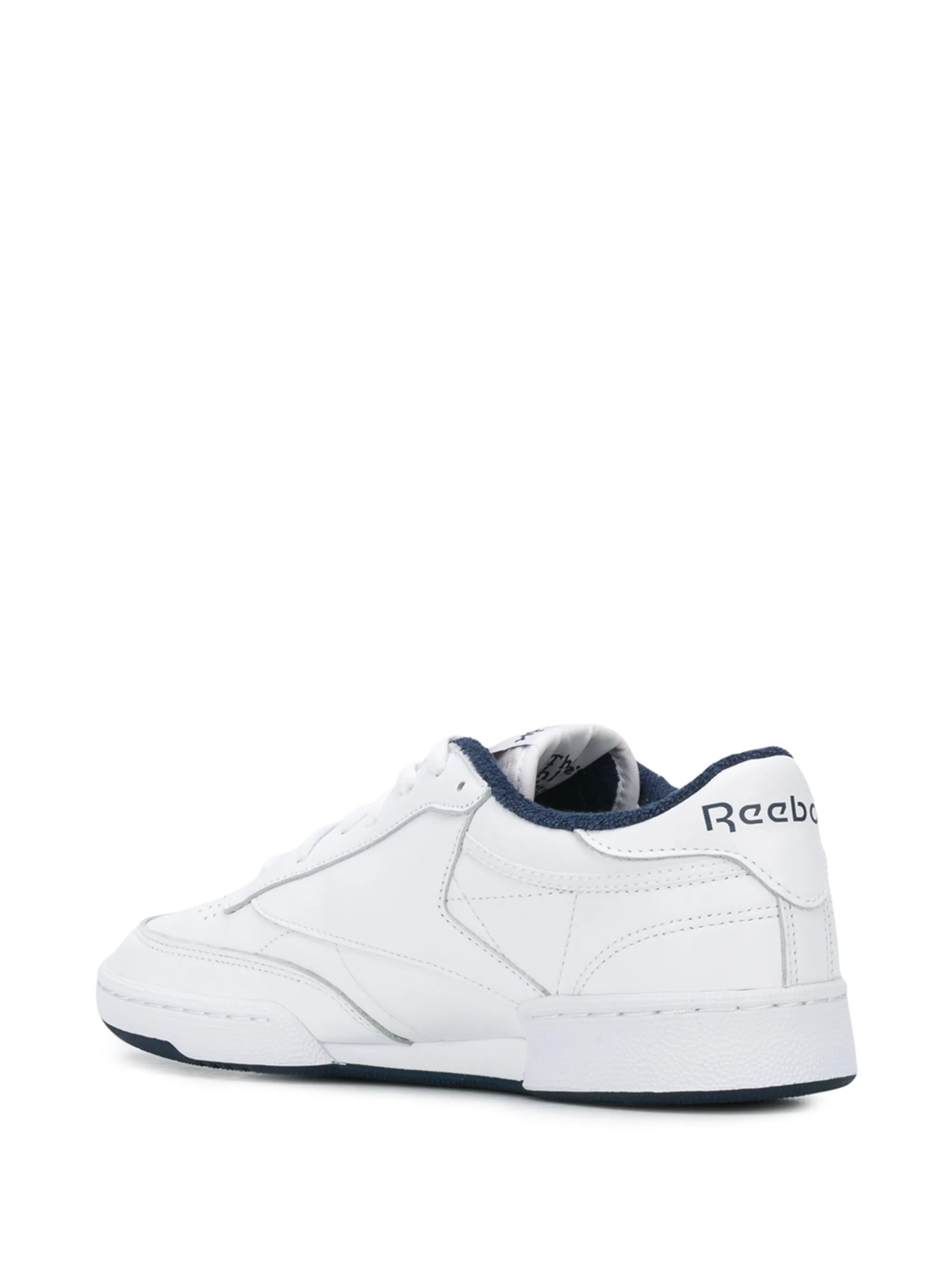 Кеды Club C 85 от Reebok. Декоративная перфорация, заплатка с логотипом на язычке, закругленный носок, передняя шнуровка, плоская резиновая подошва и плоский каблук.