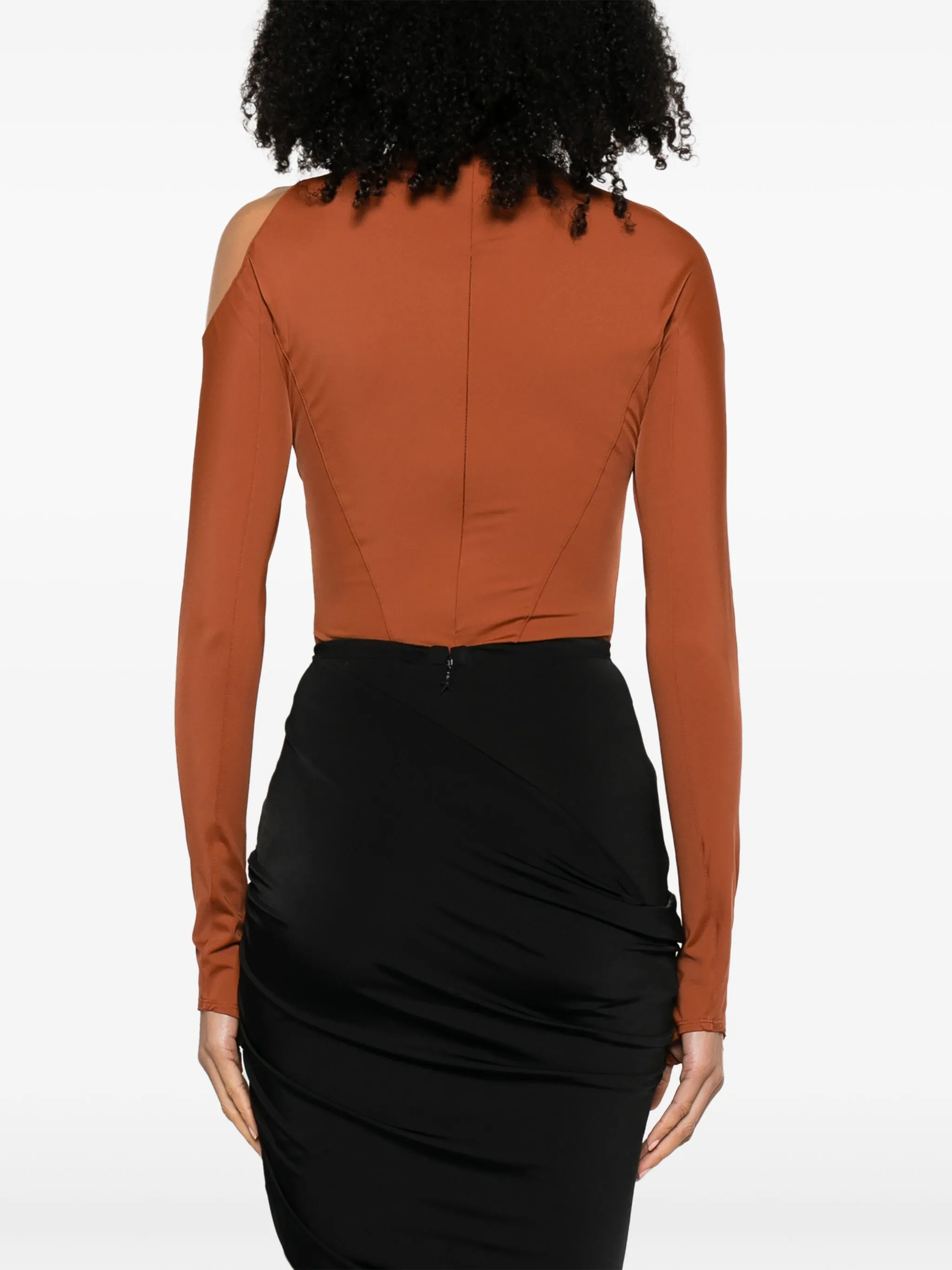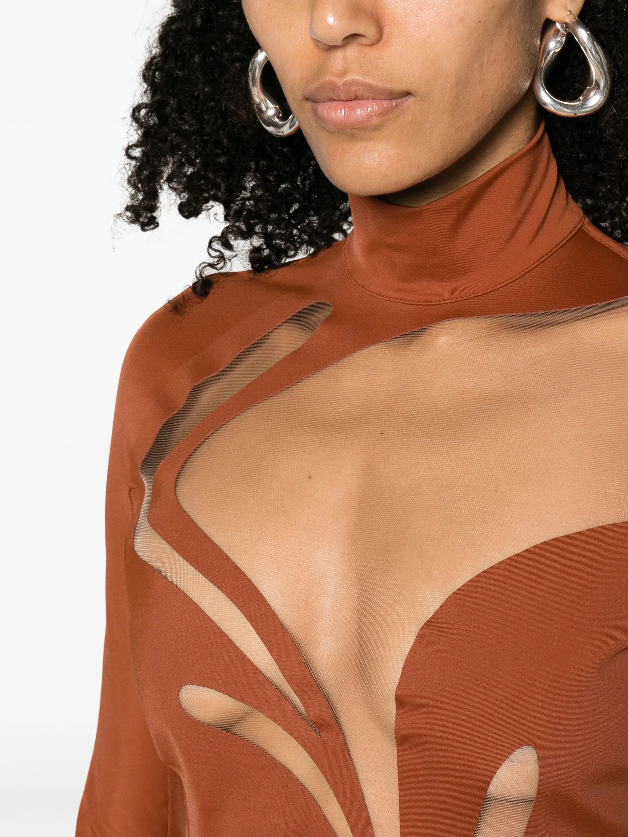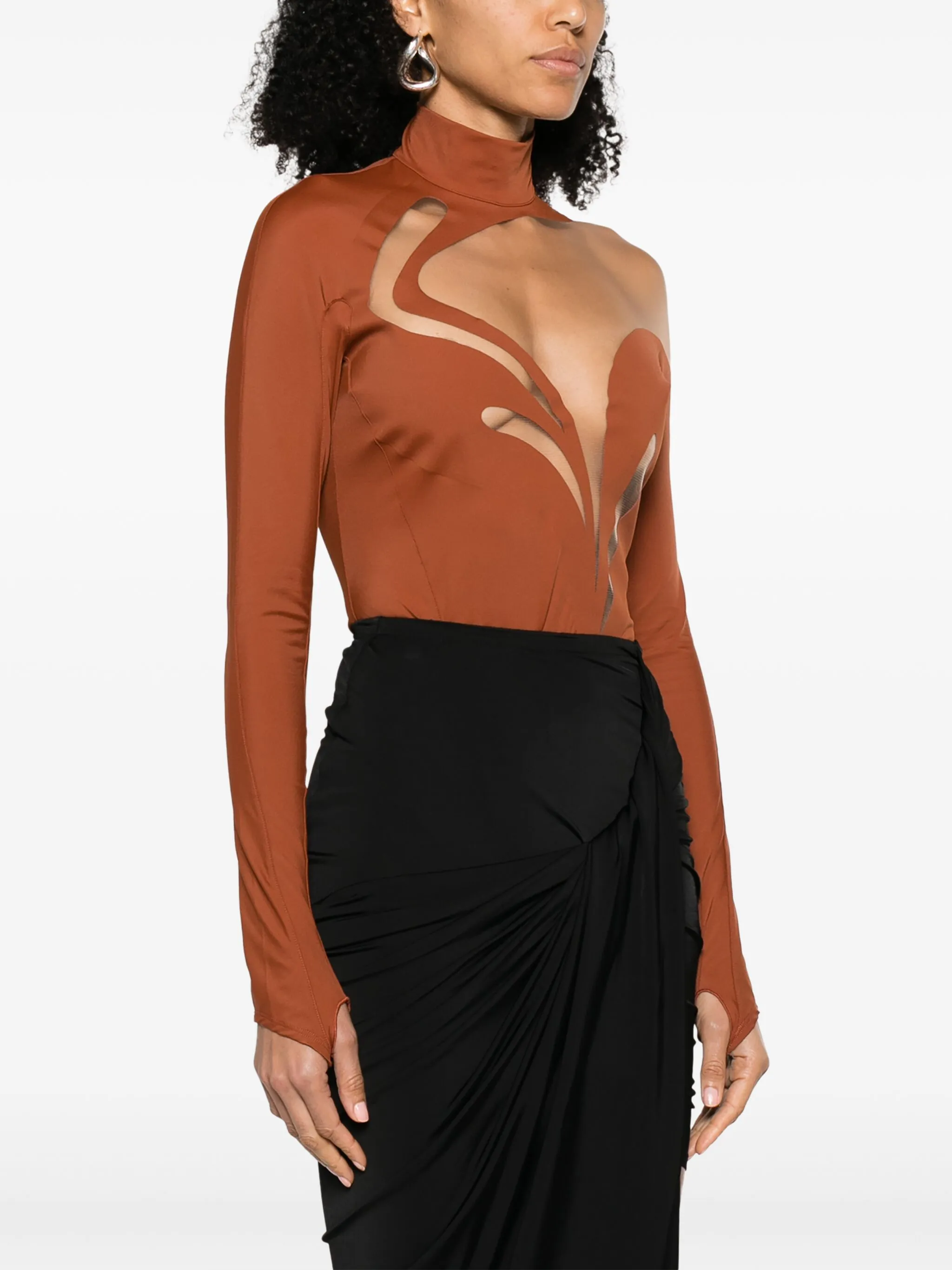 Каштановый, эластичный хлопок, сетчатые вставки, принт с абстрактным узором, облегающий крой, потайная застежка на молнии сзади, застежка на кнопках, высокий воротник, длинные рукава, вырезы для больших пальцев и высокий вырез.