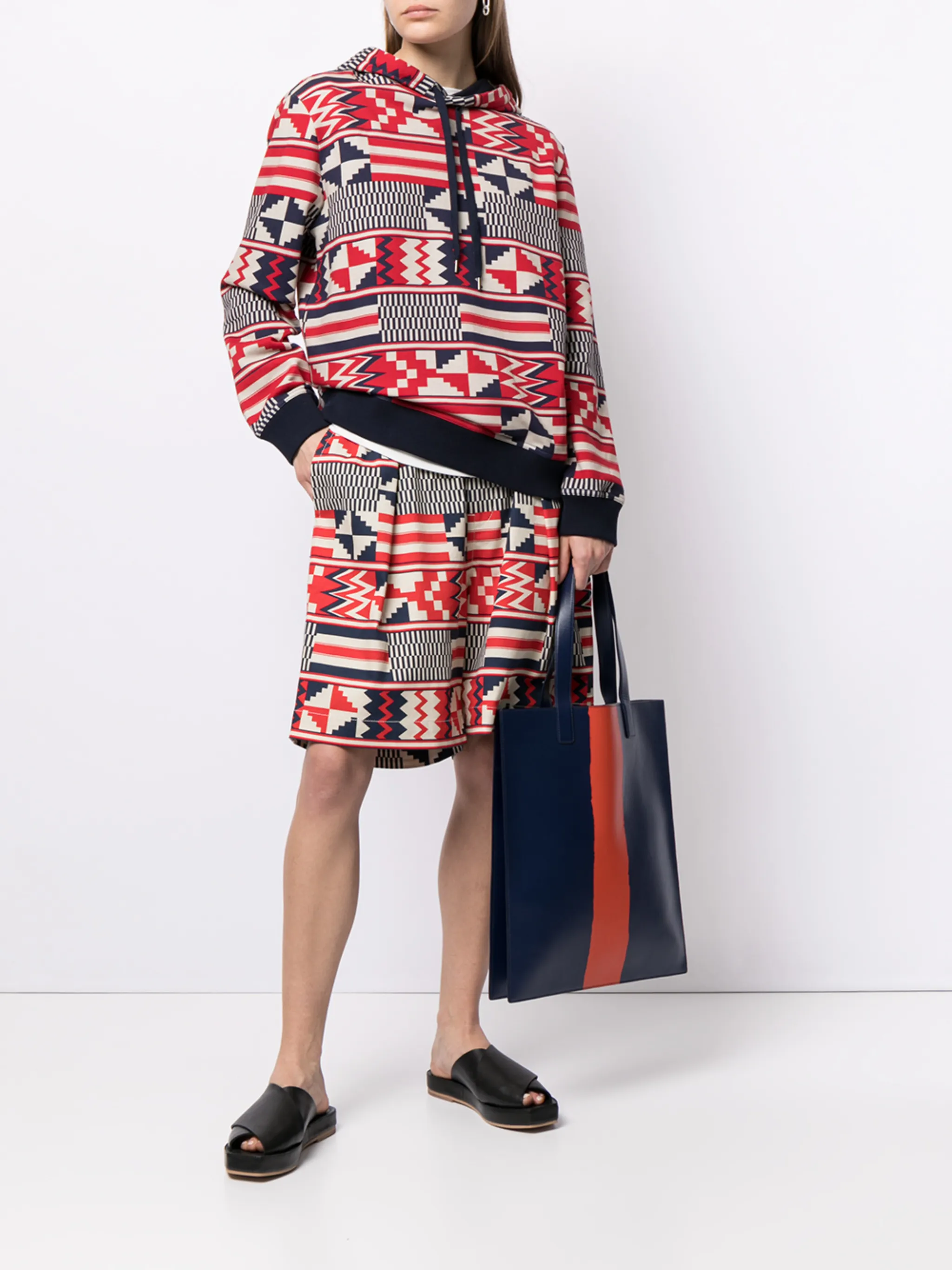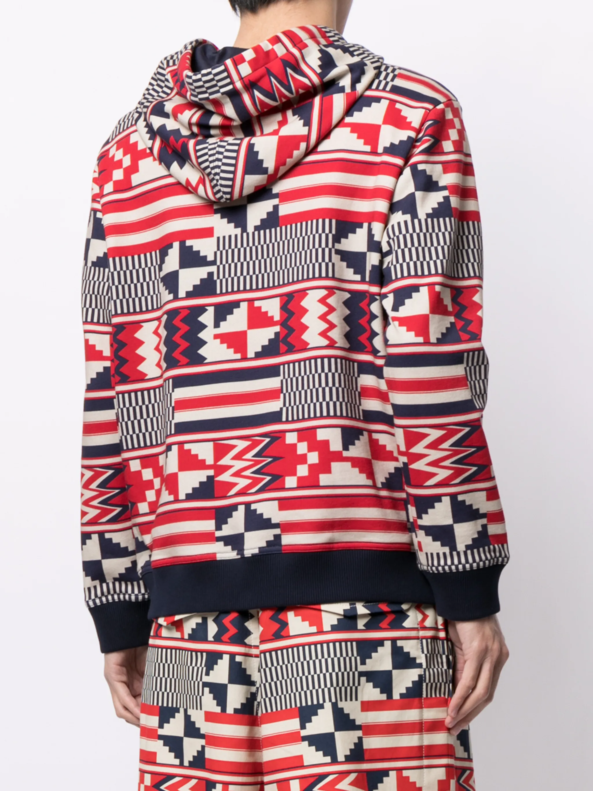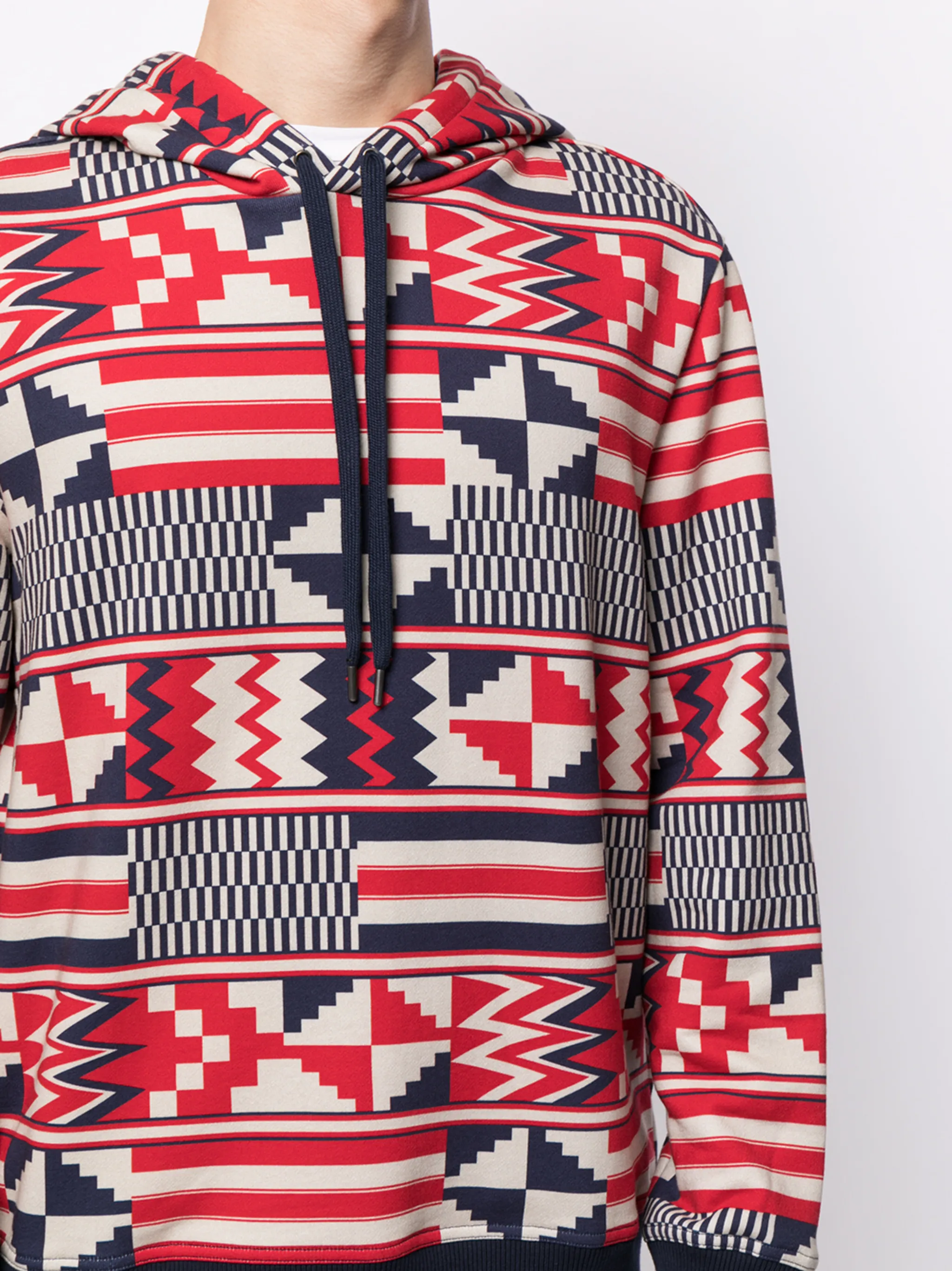 Затягивающийся на шнурок капюшон, геометричный узор, длинные рукава, прямой подол и контрастные манжеты. Цвет: разноцветный.