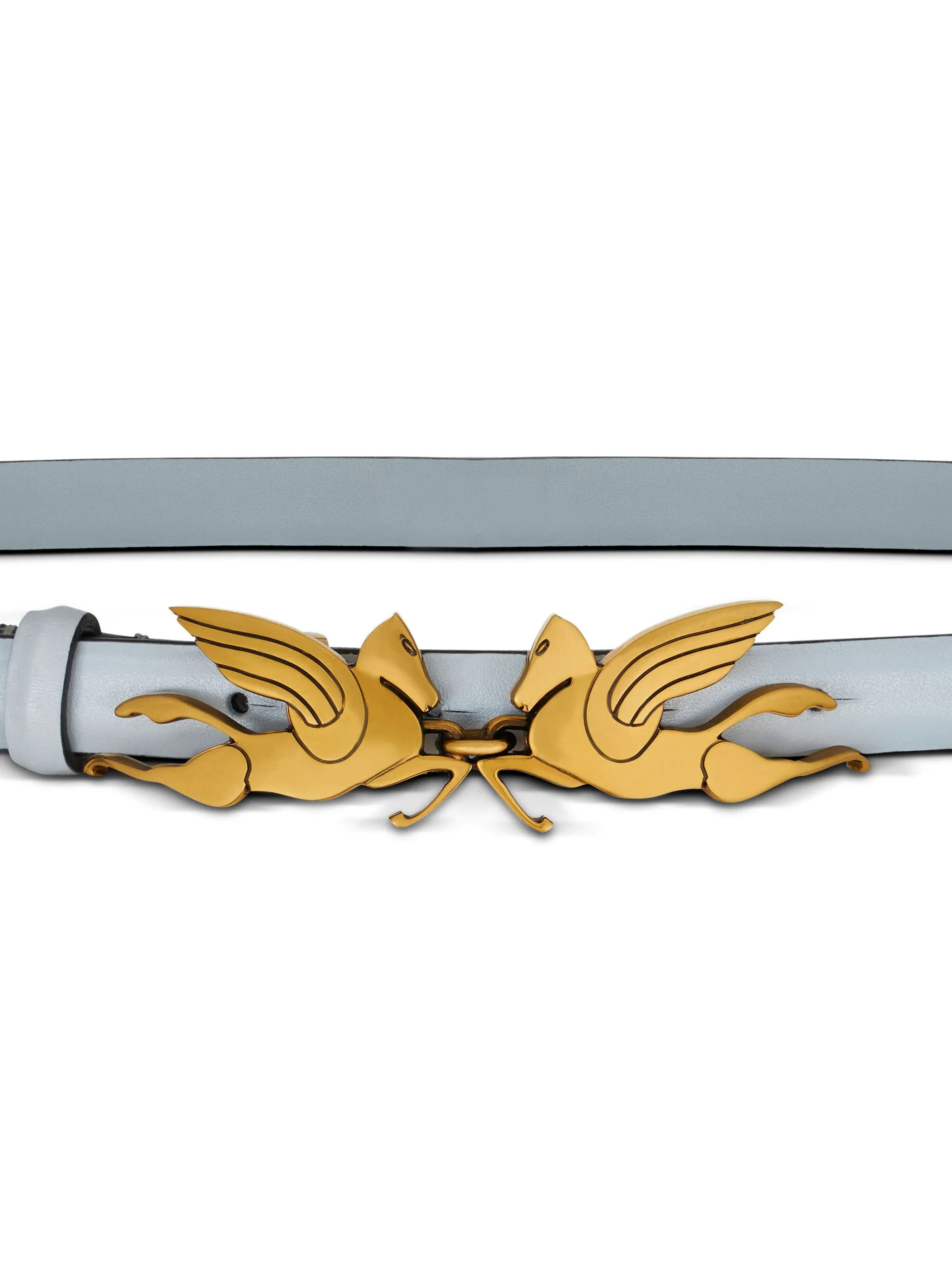 Голубой, кожа, гладкая текстура кожи, узор Pegaso, застежка на золотистой пряжке, регулируемый дизайн и декоративные вырезы.