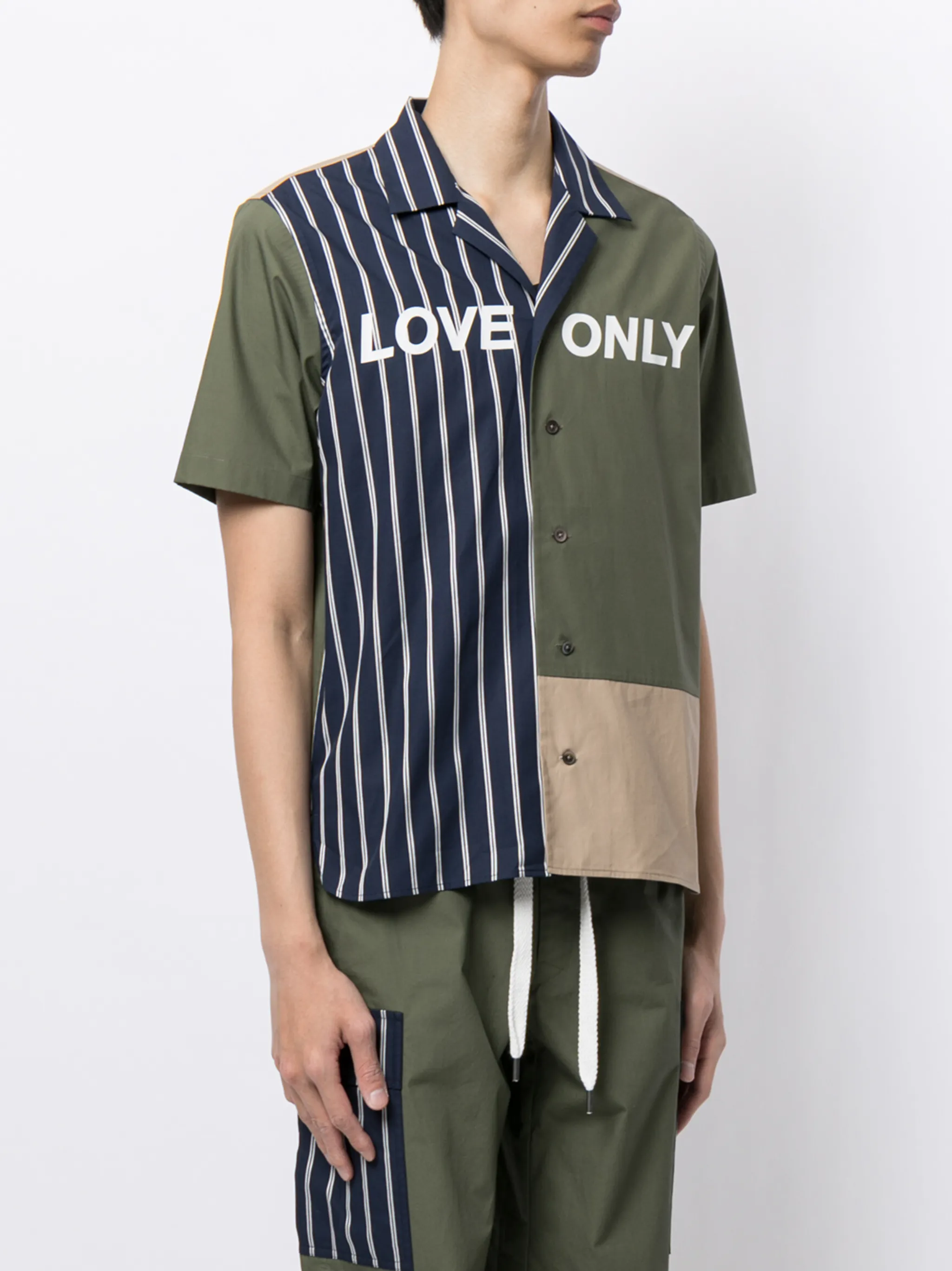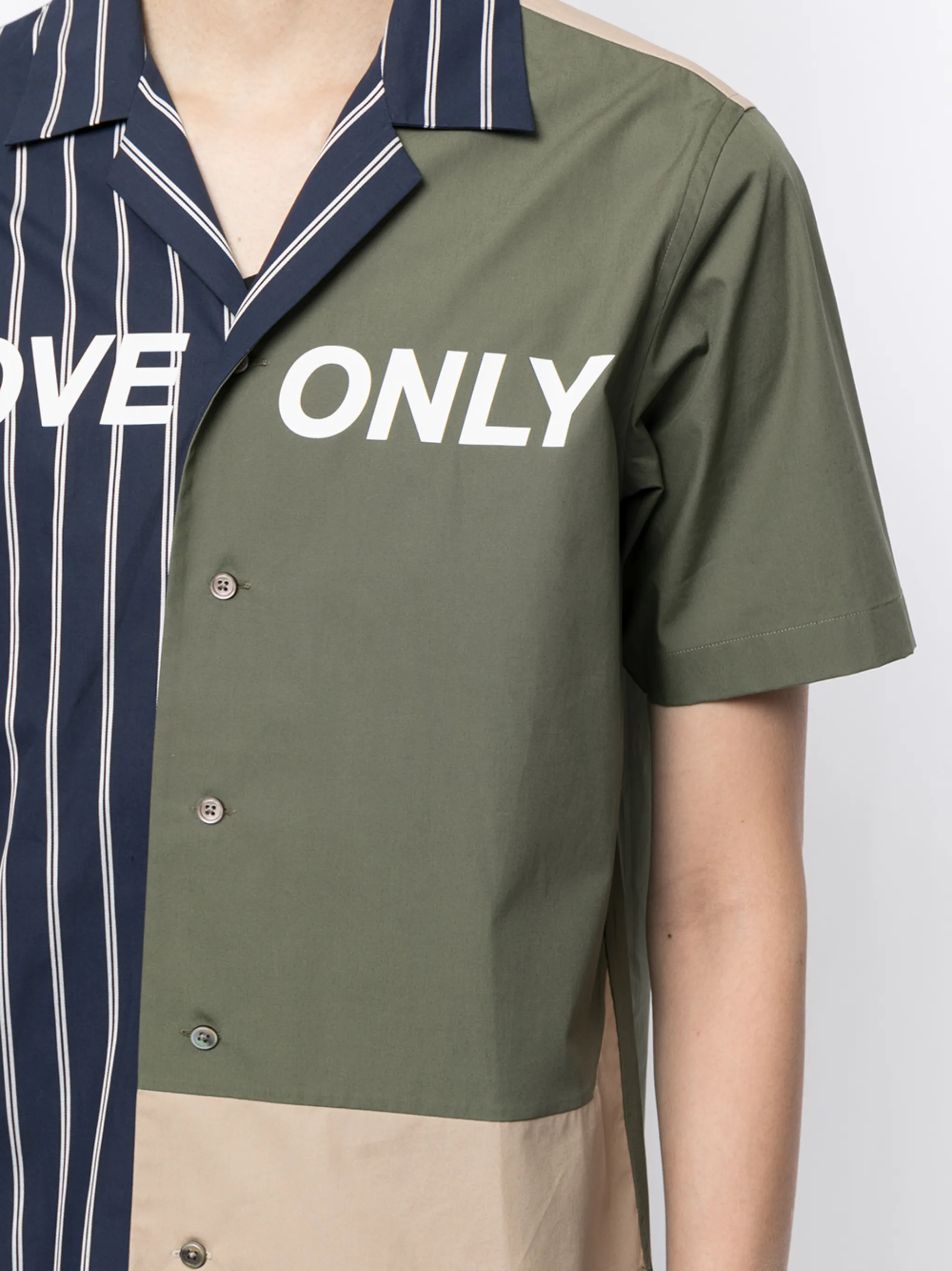 Принт в вертикальную полоску, принт с надписью спереди, планка на пуговицах спереди, классический воротник, короткие рукава и неравномерный подол. Это унисекс-модель. Обратите внимание, что для нее используется мужская размерная сетка.
