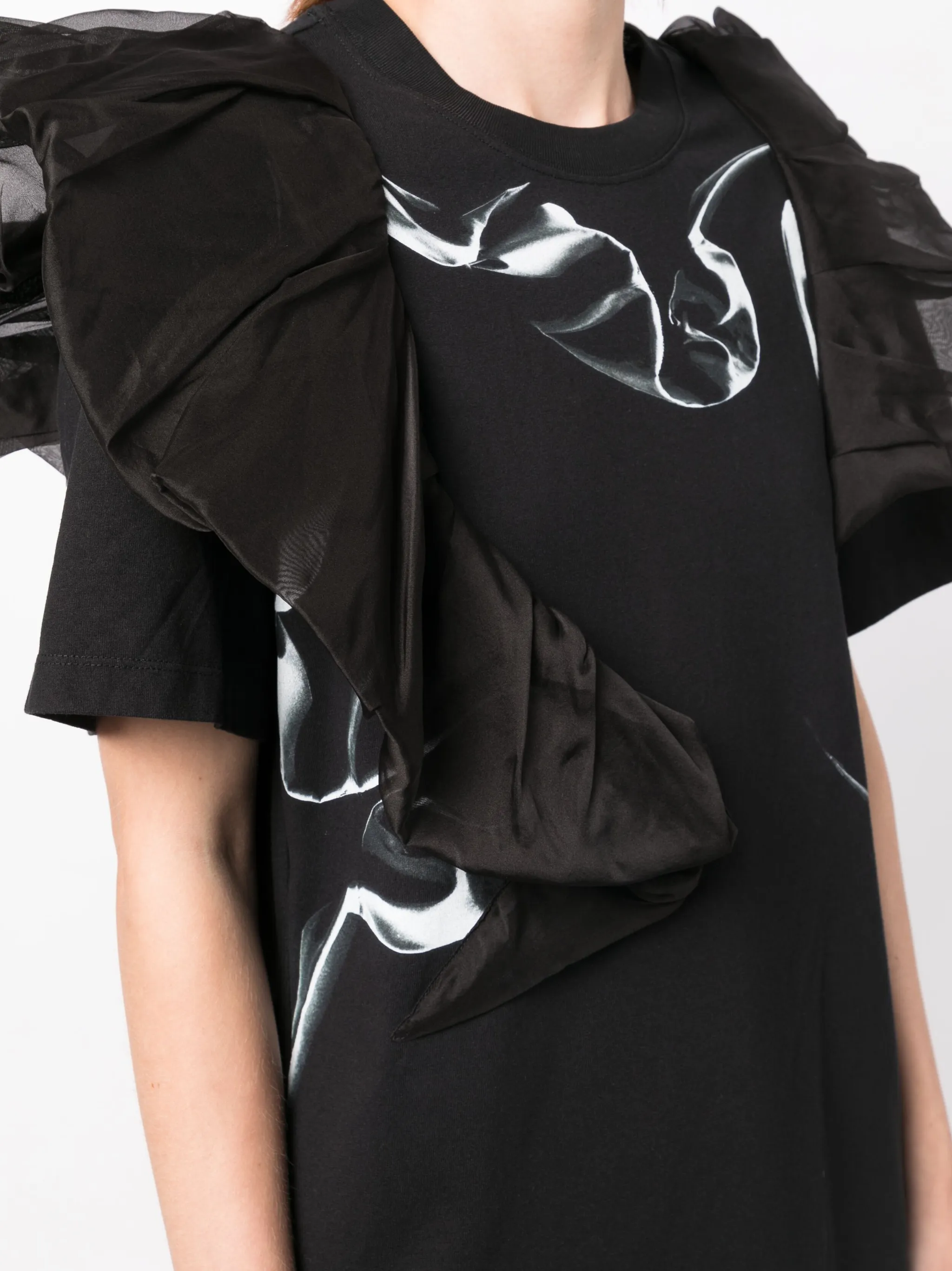 Черный, хлопок, вставки с оборками, верхний слой из тюля, круглый вырез, короткие рукава и прямой подол.