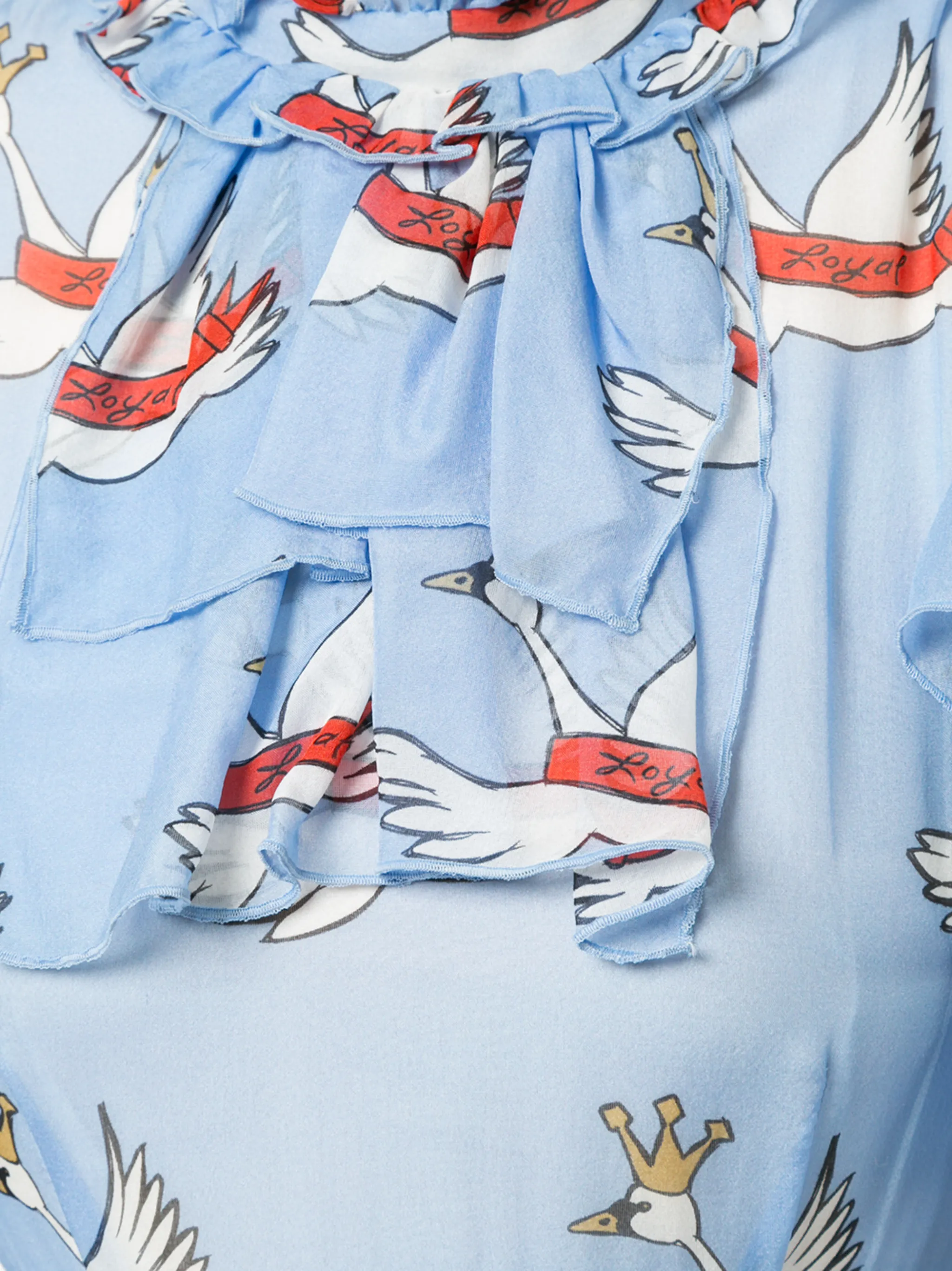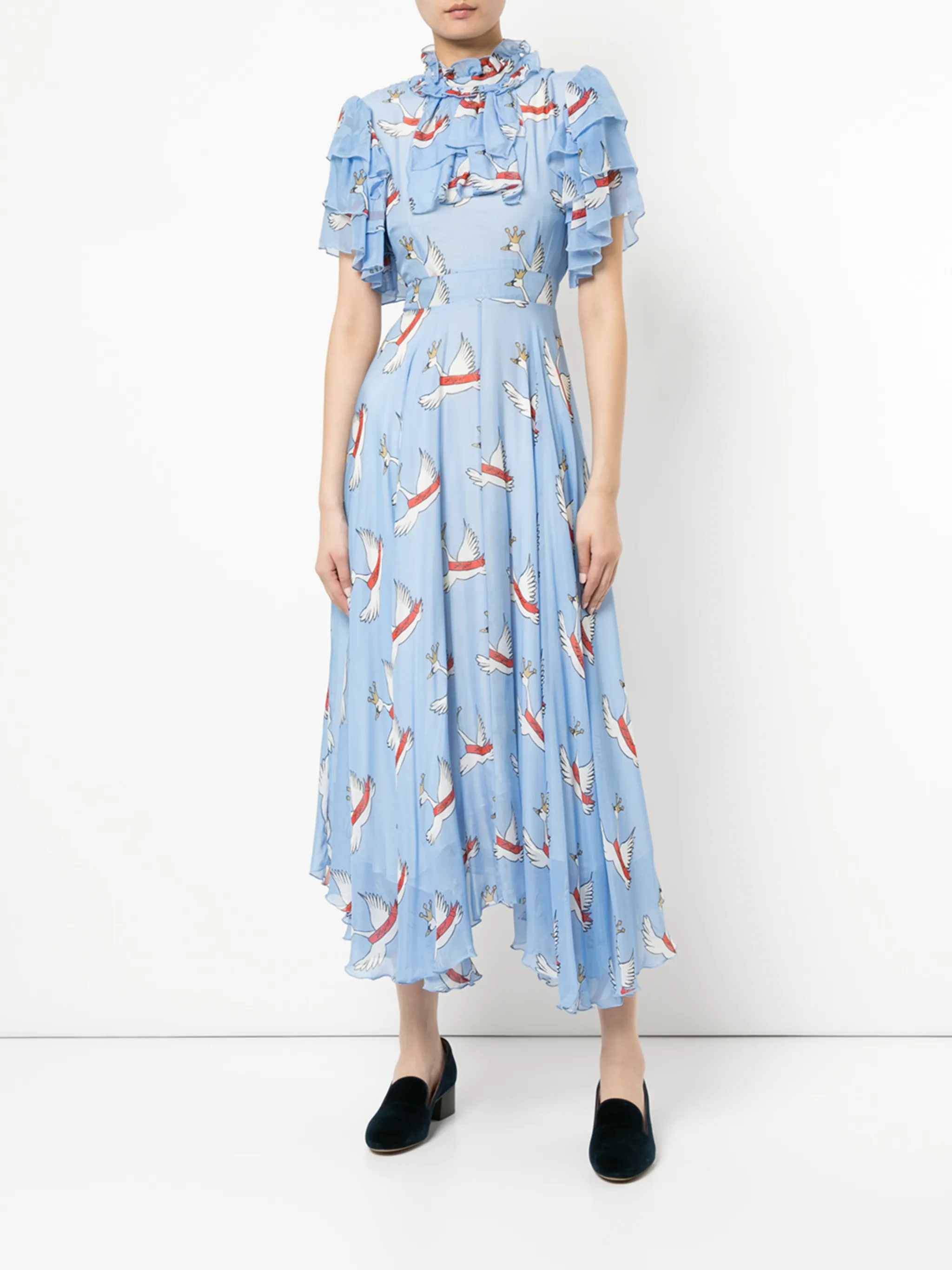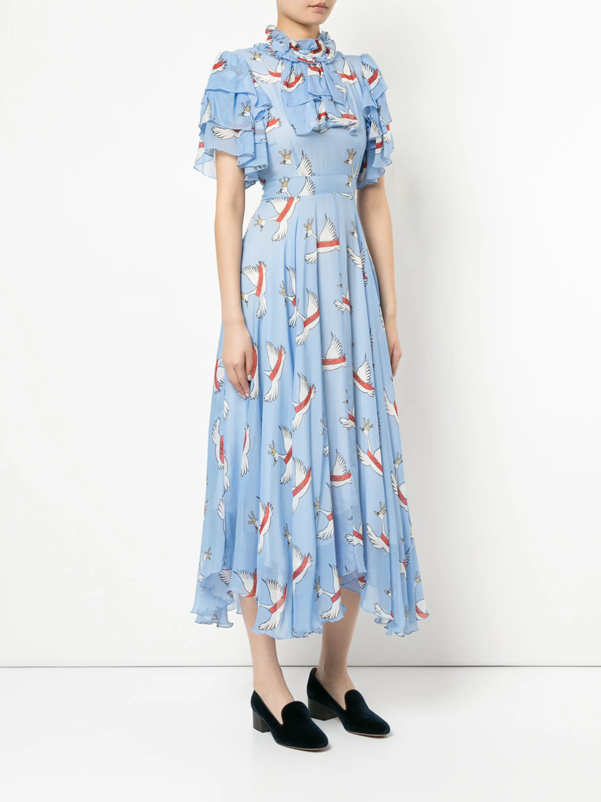 Воротник с оборками, рукава с воланами, приталенный силуэт, потайная застежка на молнию сзади, асимметричный подол.