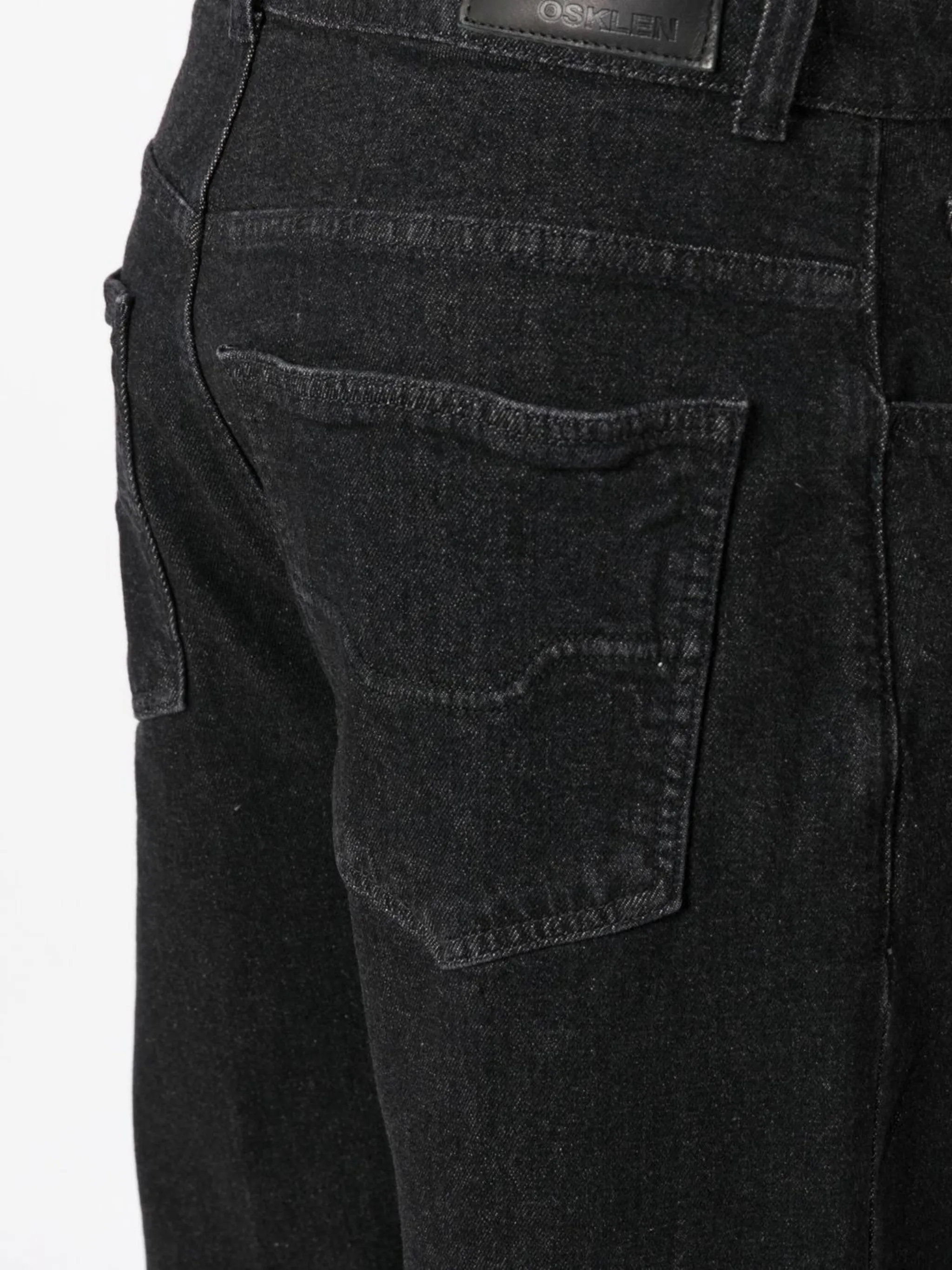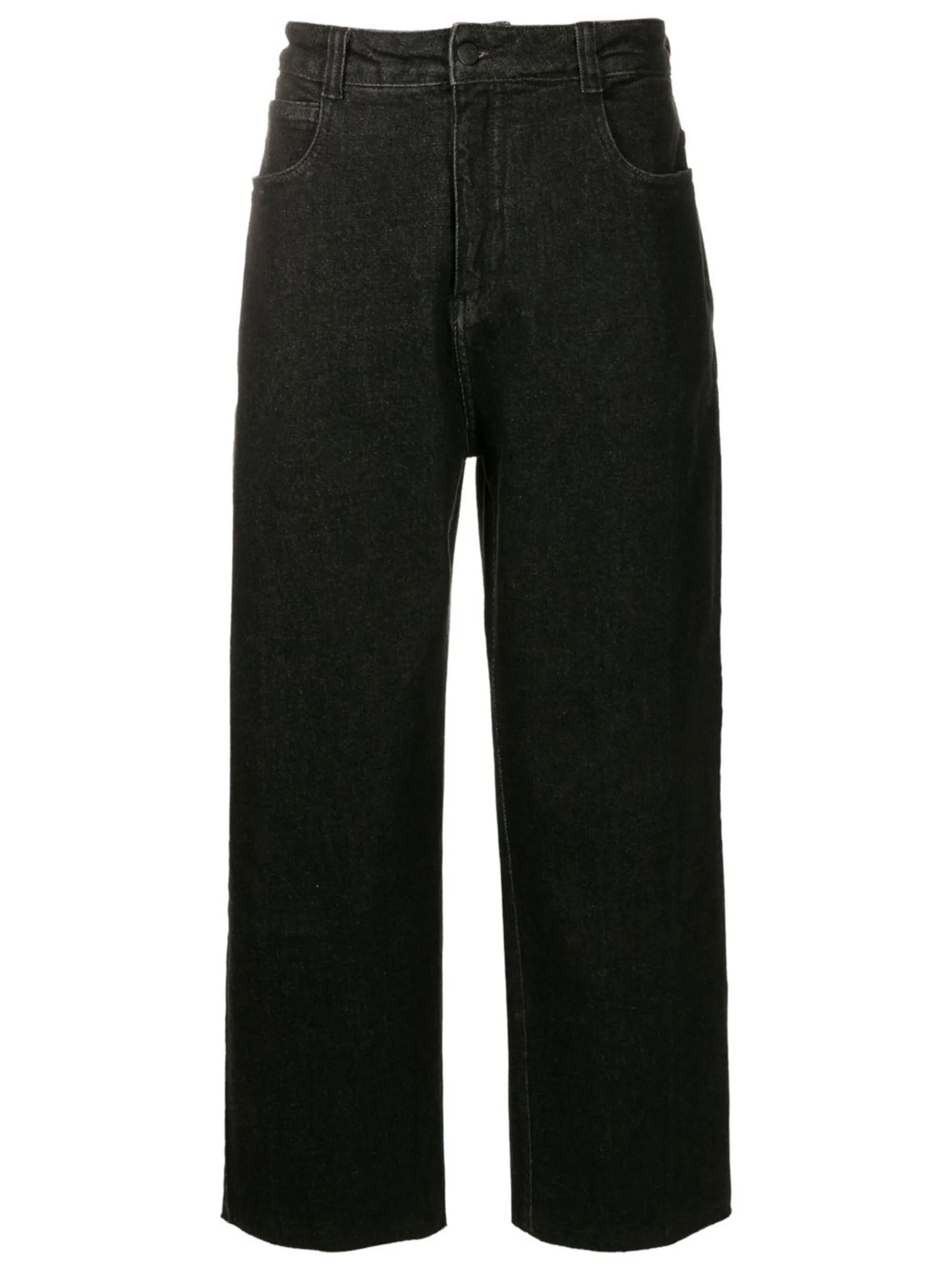 Черный, эластичный хлопок, деним, нашивка с логотипом сзади, петли для ремня, широкий крой, потайная застежка на молнии и пуговицах и пять карманов.