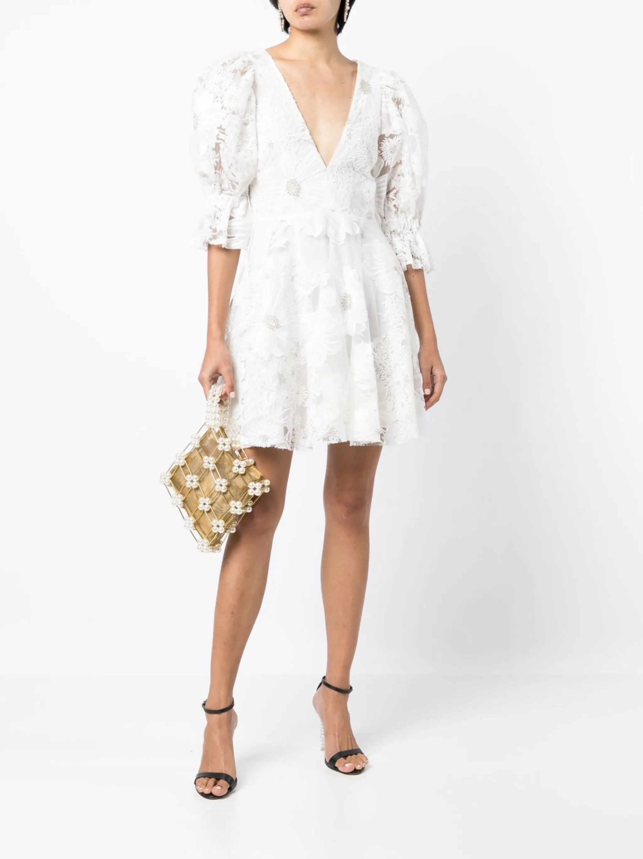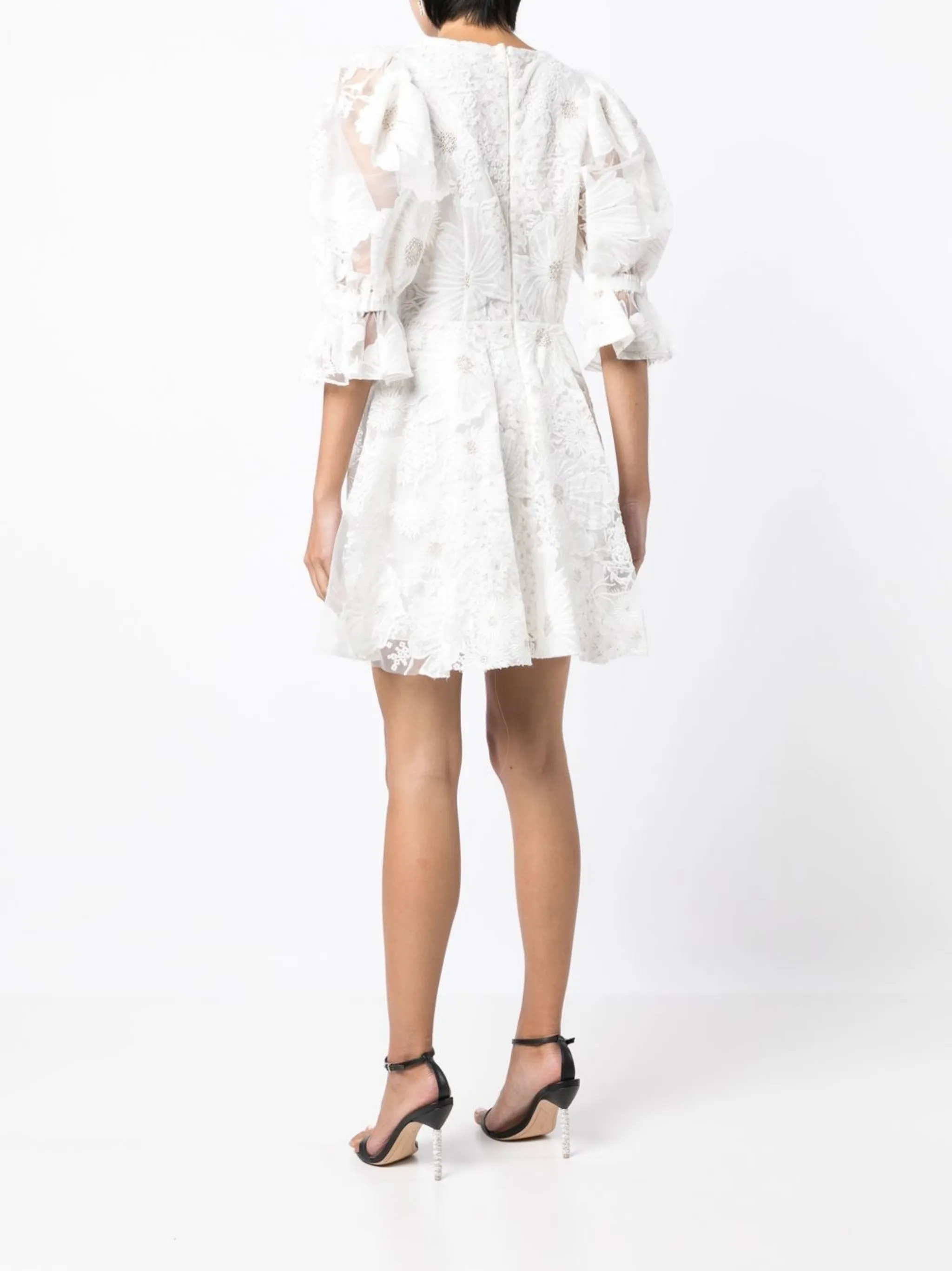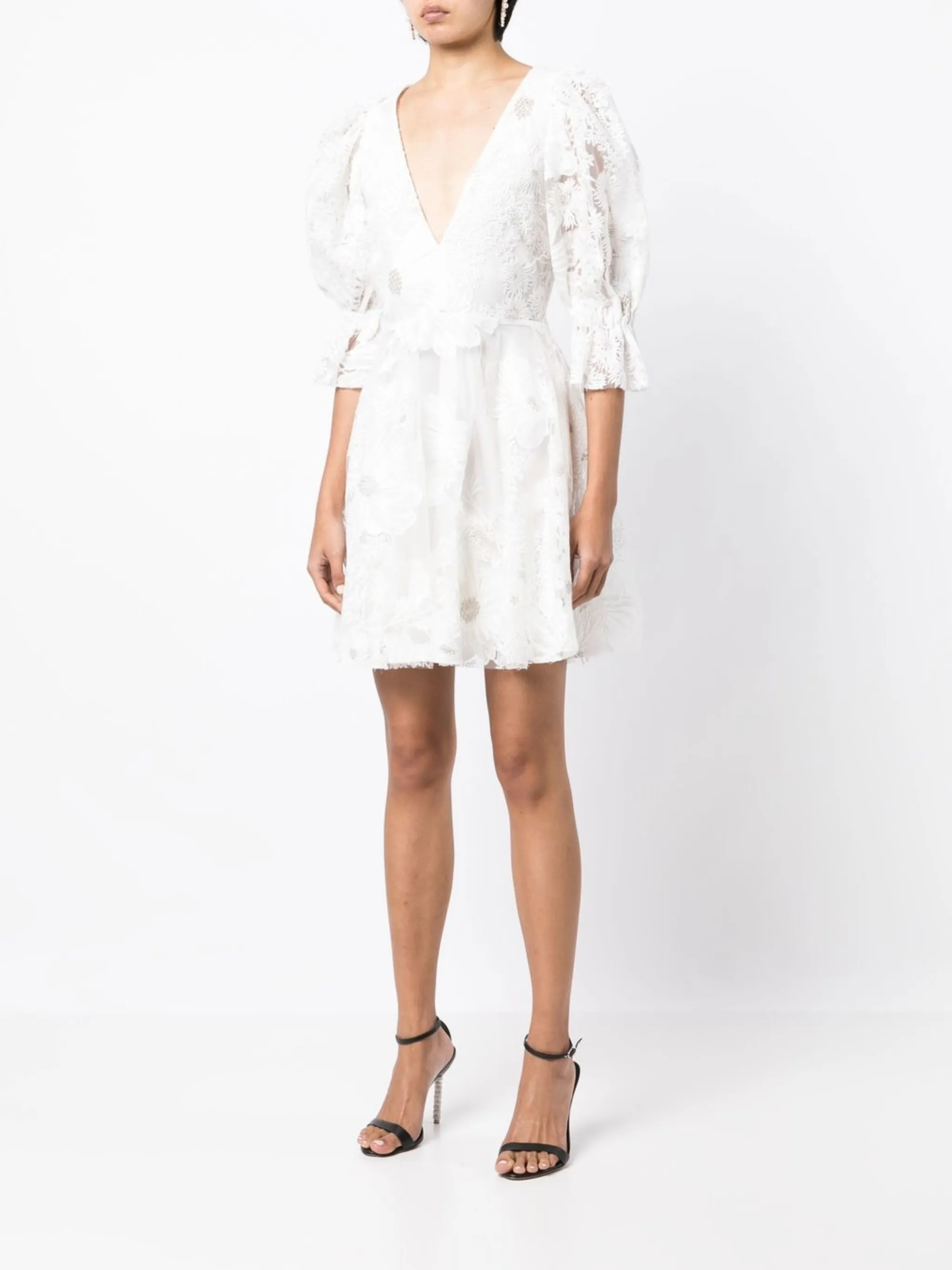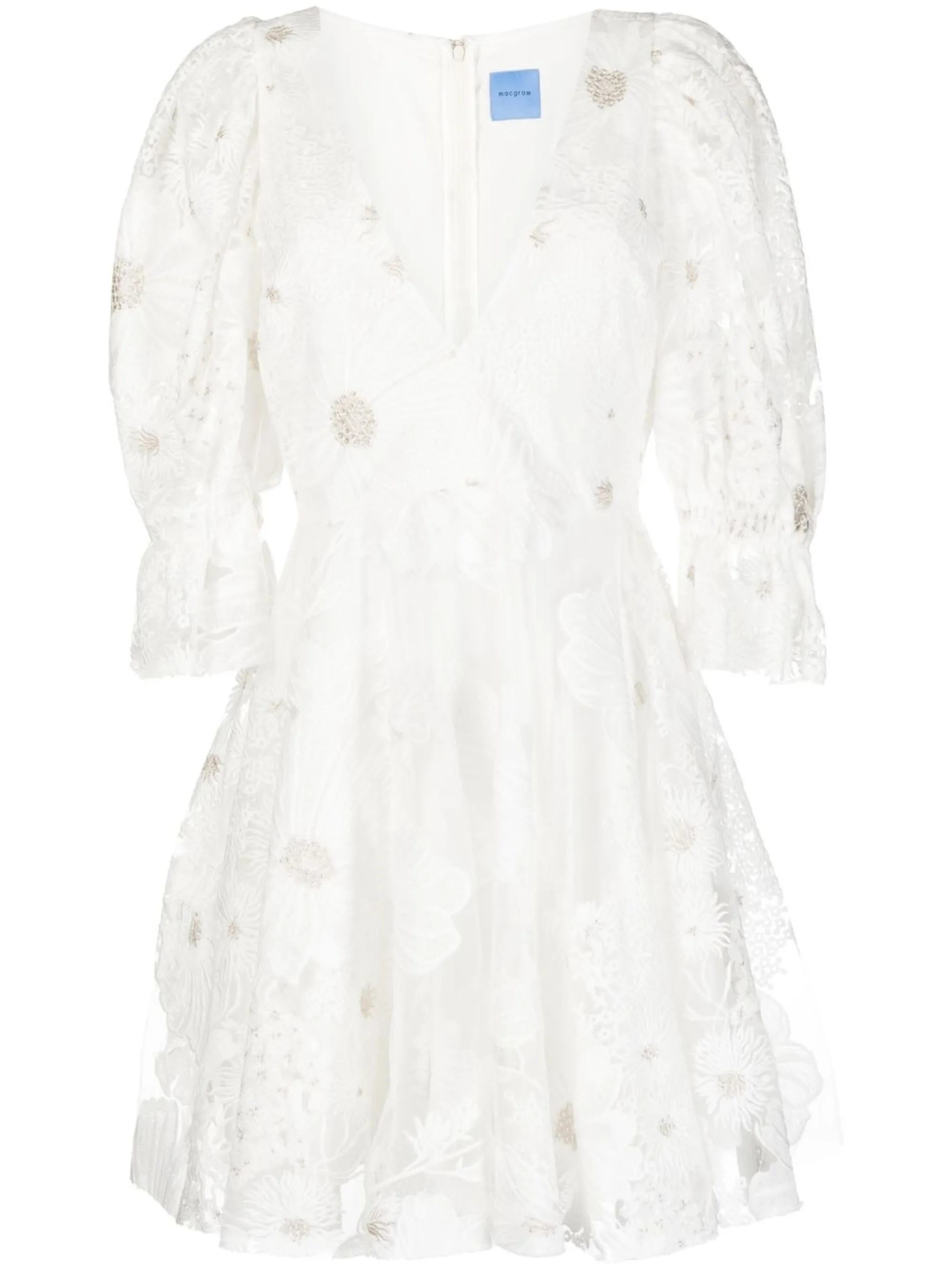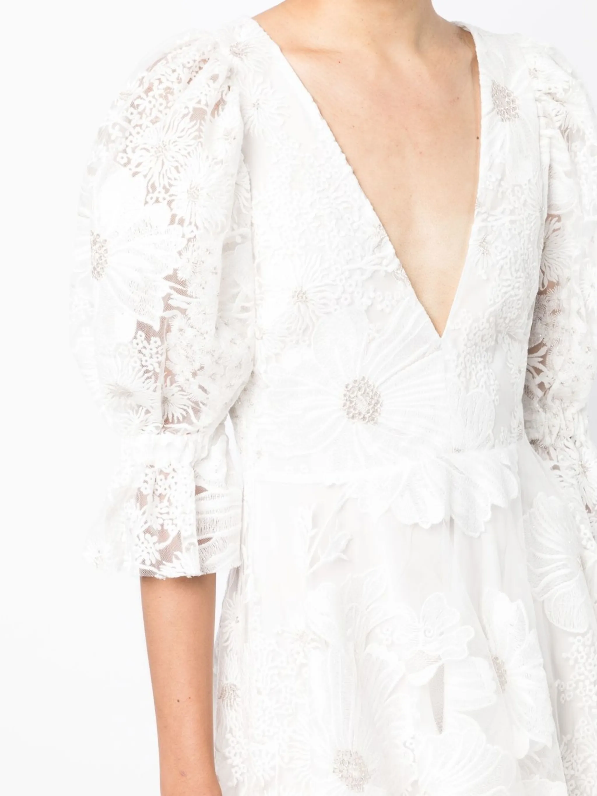 Цвет слоновой кости, сплошная цветочная вышивка, глубокий V-образный вырез, застежка на молнии сзади, пышные рукава три четверти, расклешенный крой и длина выше колена.