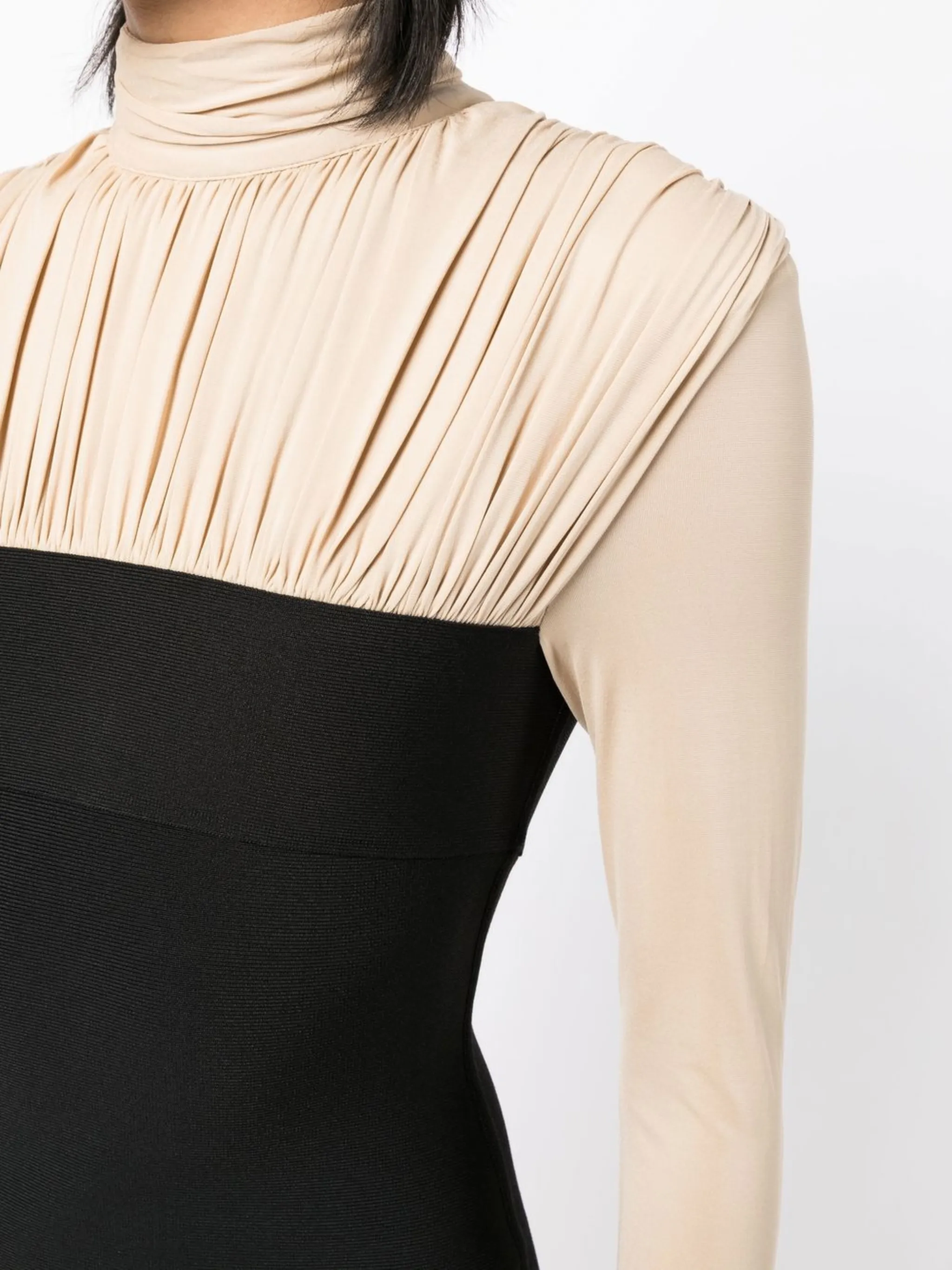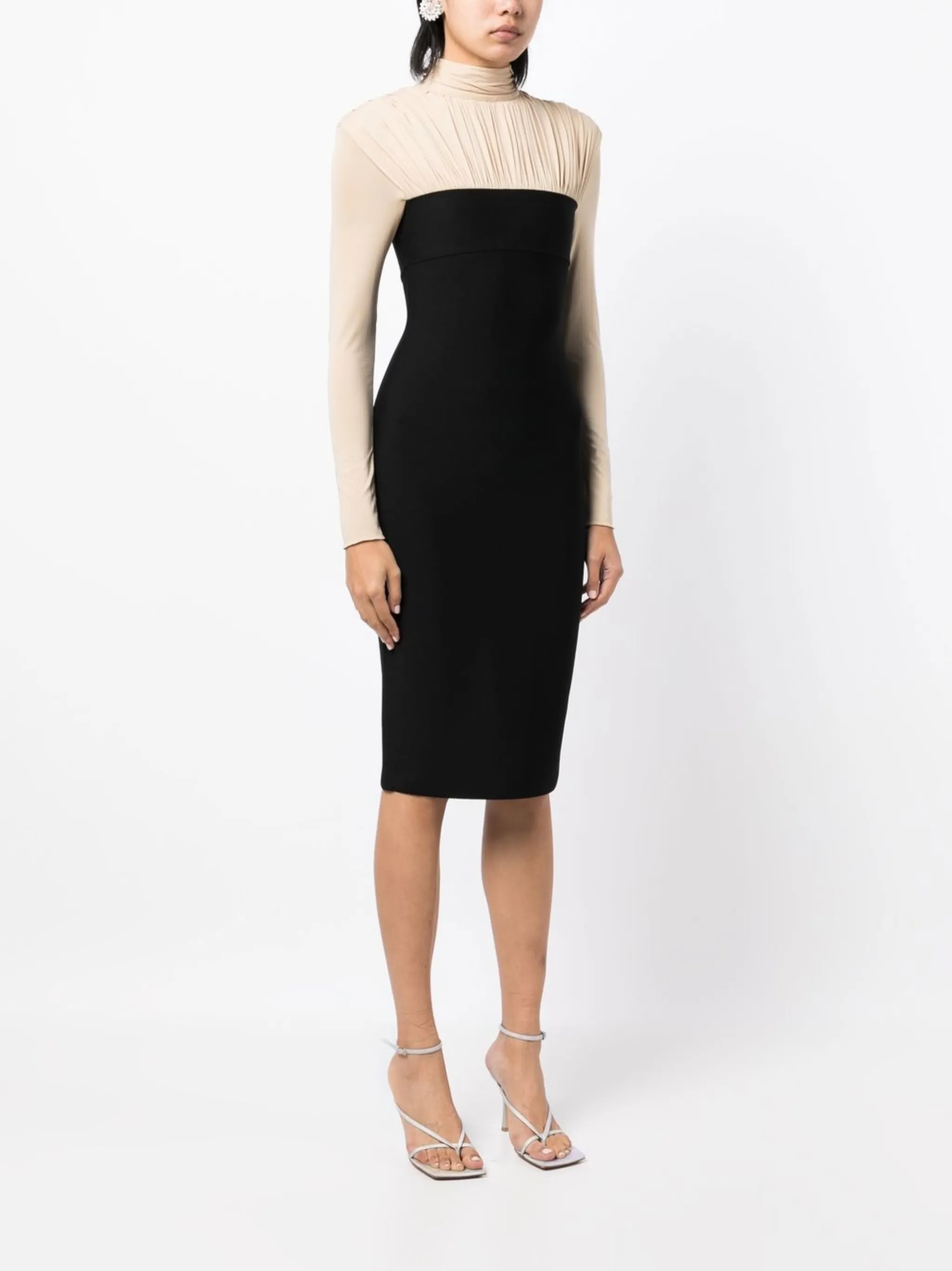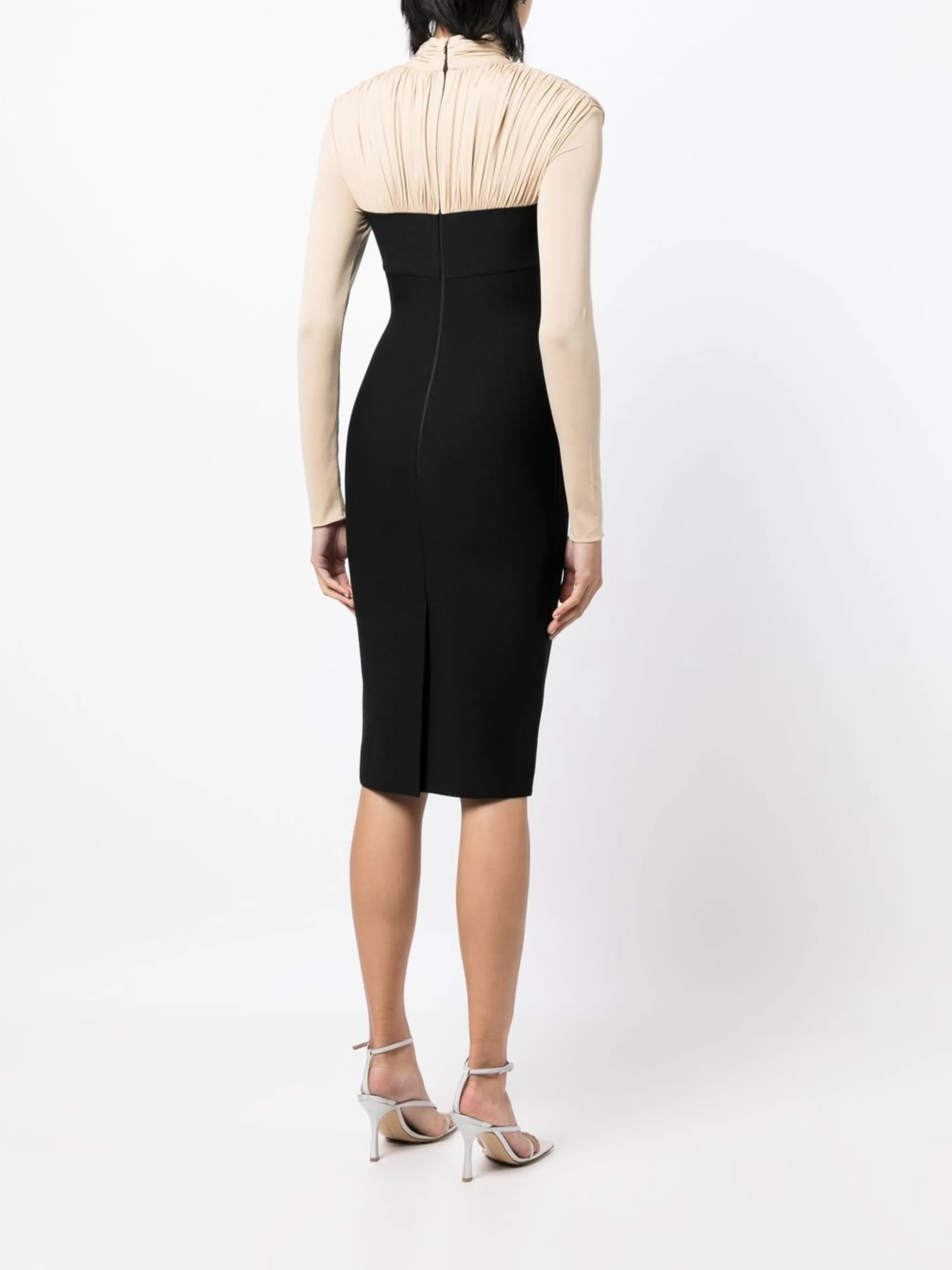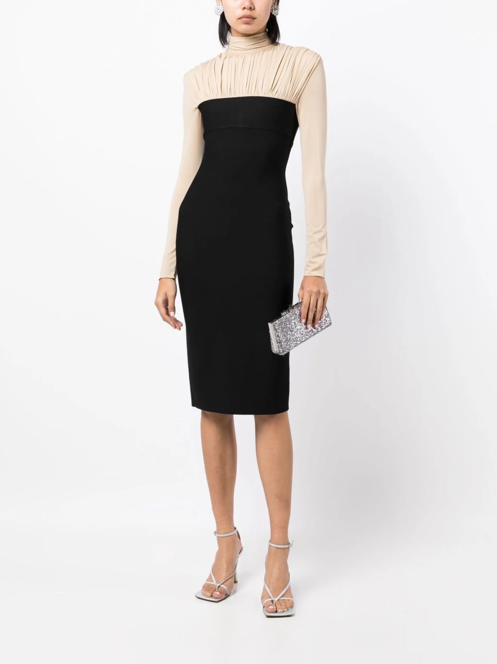Черный, бежевый, силуэт «карандаш», длинные рукава, застежка на молнии сзади и детали с оборками.