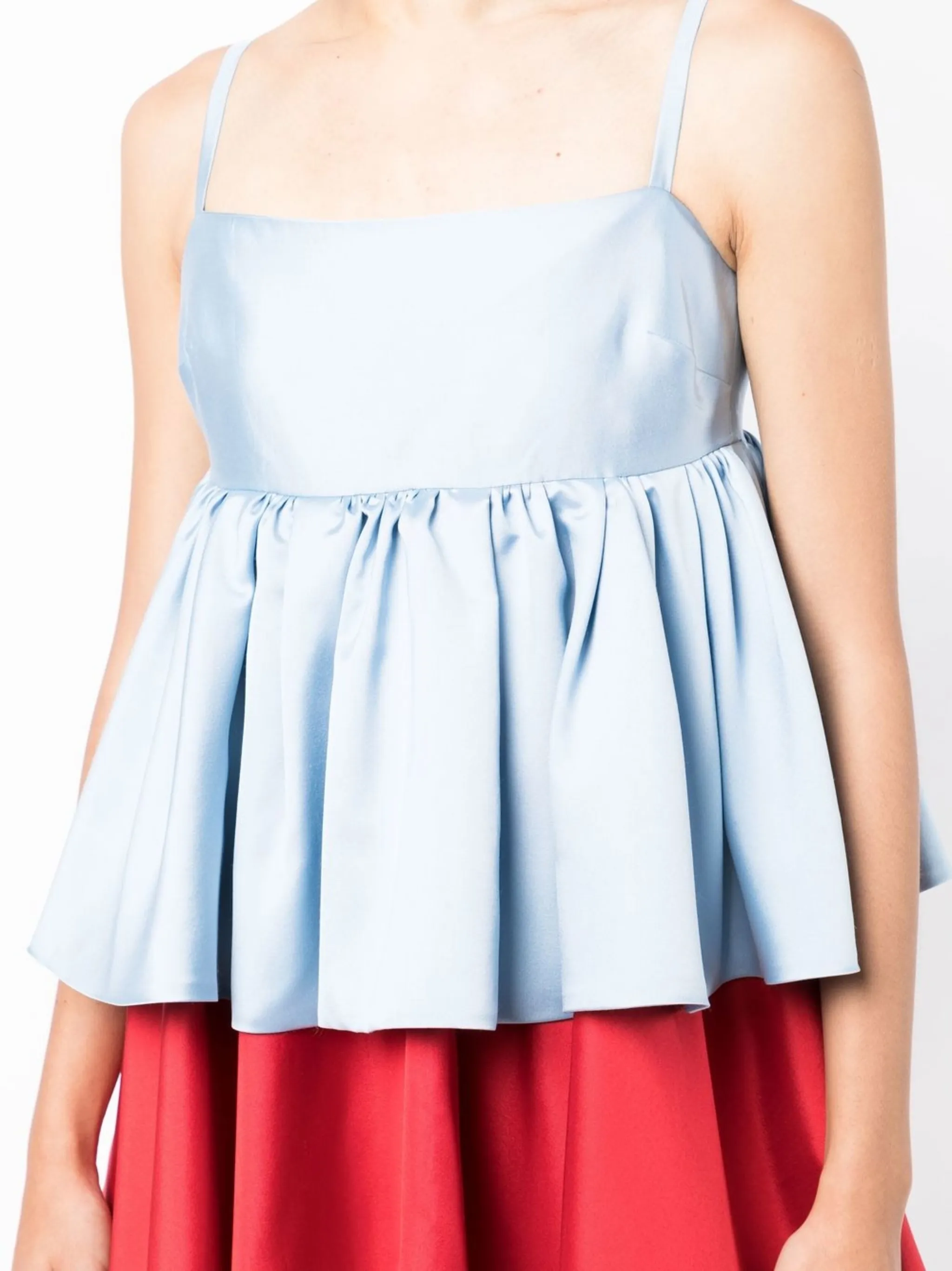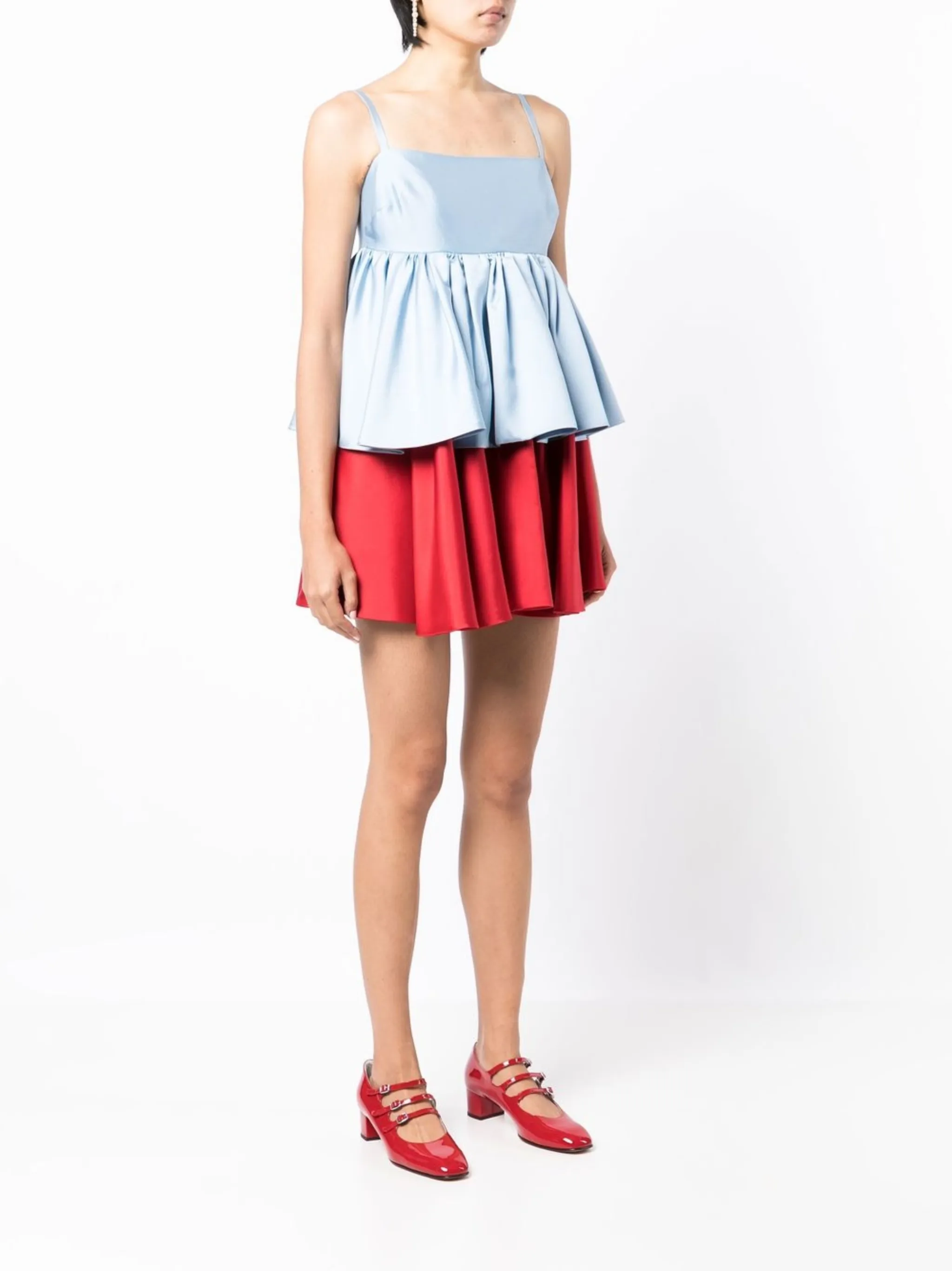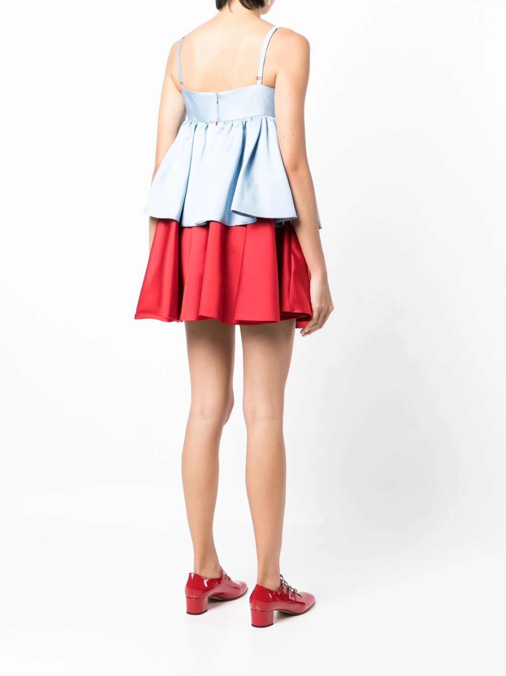 Голубой, красный, смесь шерсти и шелка, шелк, многослойный дизайн, ярусная юбка, квадратный вырез, тонкие бретели, застежка на молнии сзади и длина до бедер.