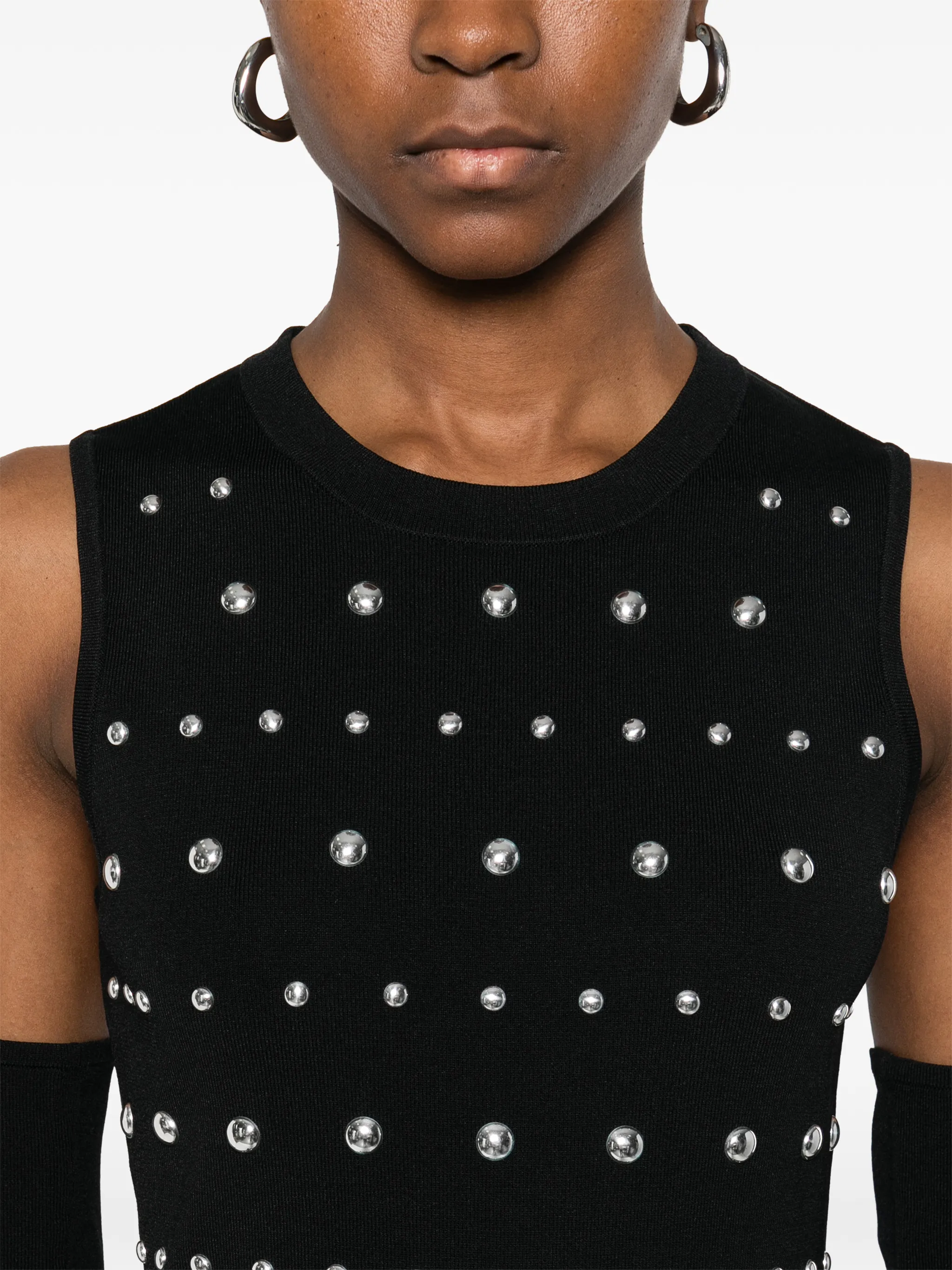 Черные, украшения с оборками на подоле, без рукавов, с круглым вырезом