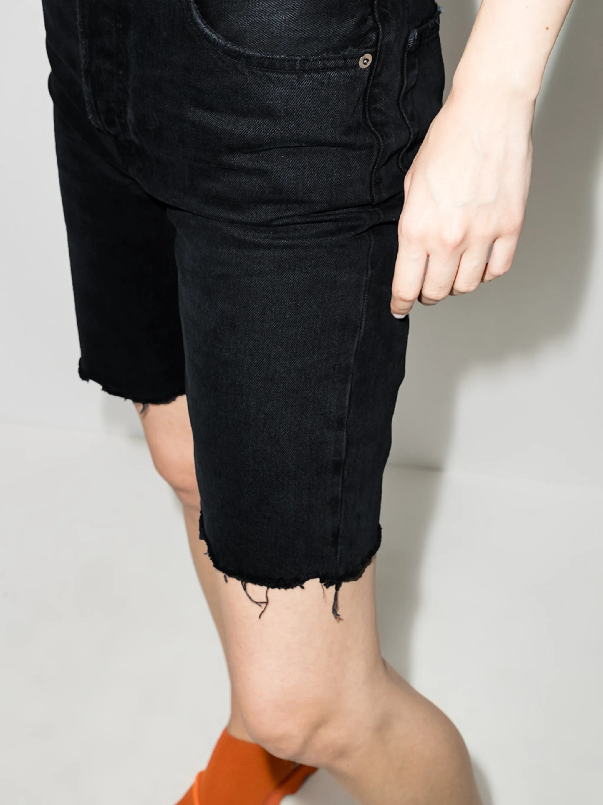 Черный, хлопок, необработанный подол, петли для ремня, завышенная талия, застежка на молнии и пуговице спереди, прямой крой, длина по колено, классическая пятикарманная модель