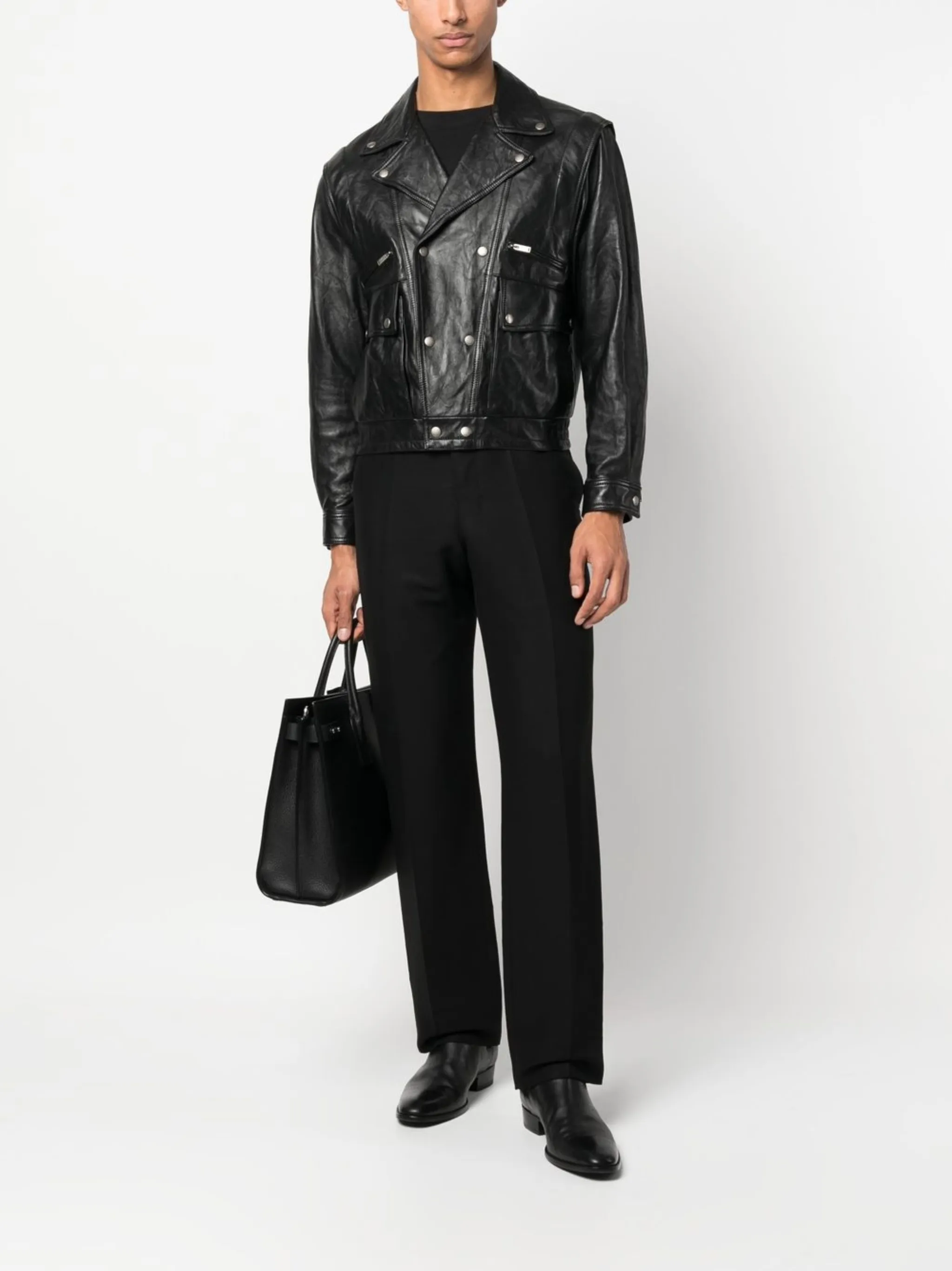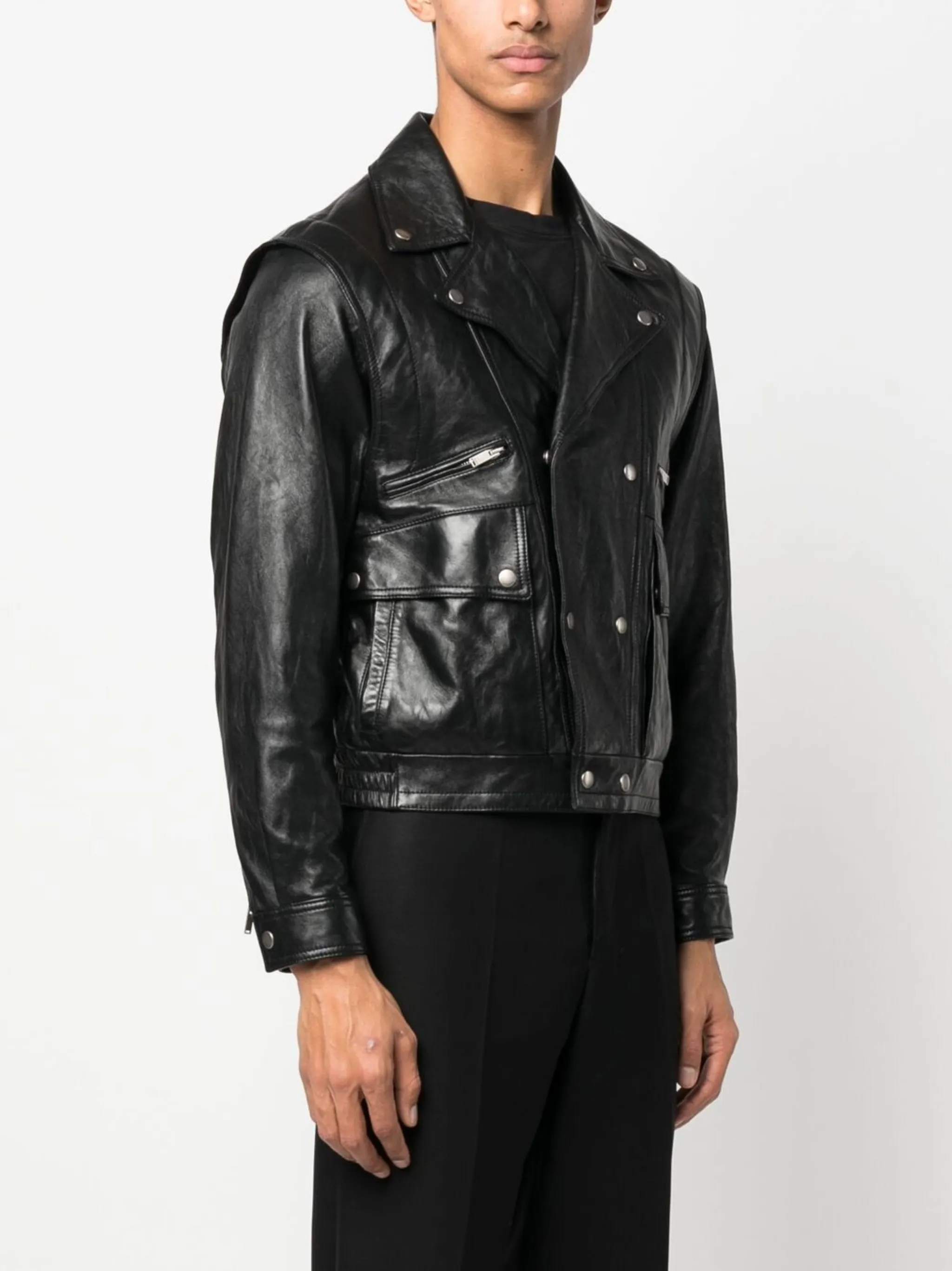 Черный, телячья кожа, жатый эффект, двубортная застежка на кнопки, два кармана карго спереди, два нагрудных кармана на молнии, зазубренные лацканы, длинные рукава, манжеты на пуговицах, манжеты на молнии и эластичные боковые вставки.