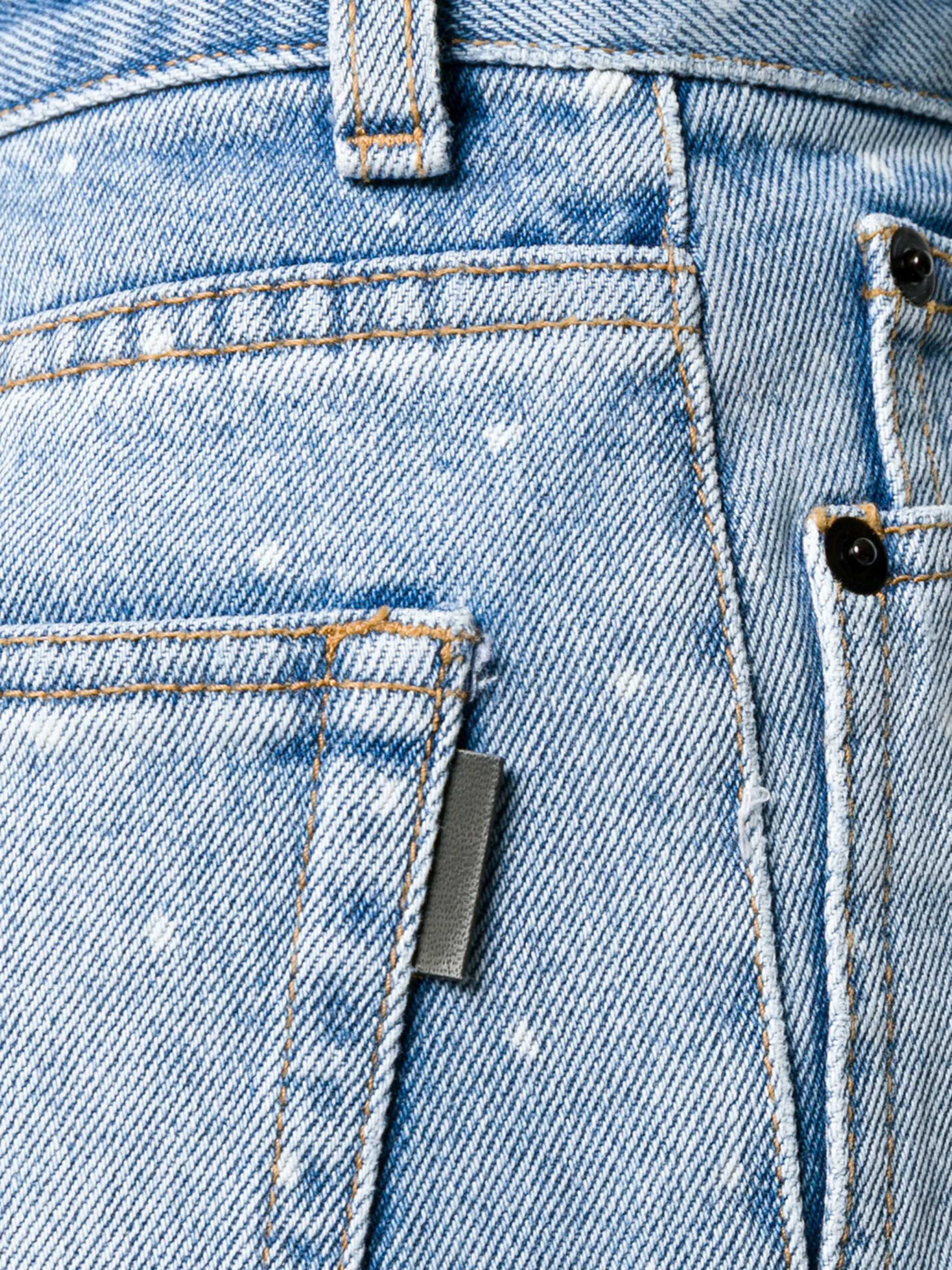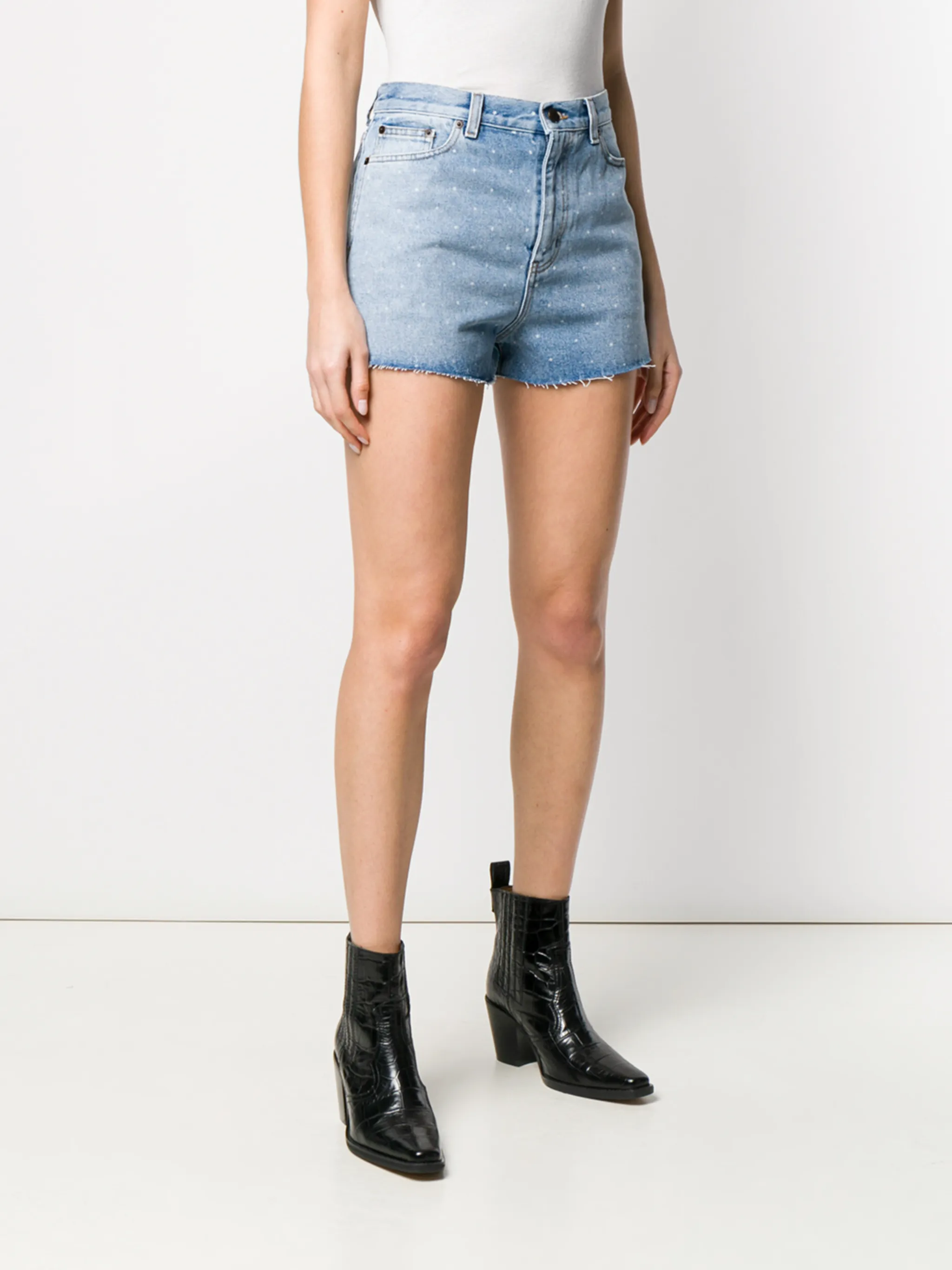 Коллекция нового сезона включила в себя джинсовые шорты с узором в горох от Saint Laurent (Сен Лоран), выполненные из голубого хлопка. Классическая пятикарманная модель, завышенная посадка, пояс с петлями для ремня, ширинка на молнии с пуговицей, расклешенный силуэт, короткая длина, необработанные края и эффект вареного денима. Сделано в Италии.