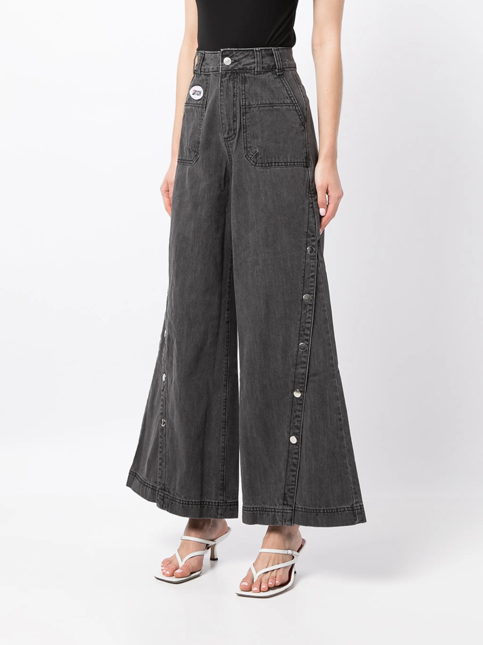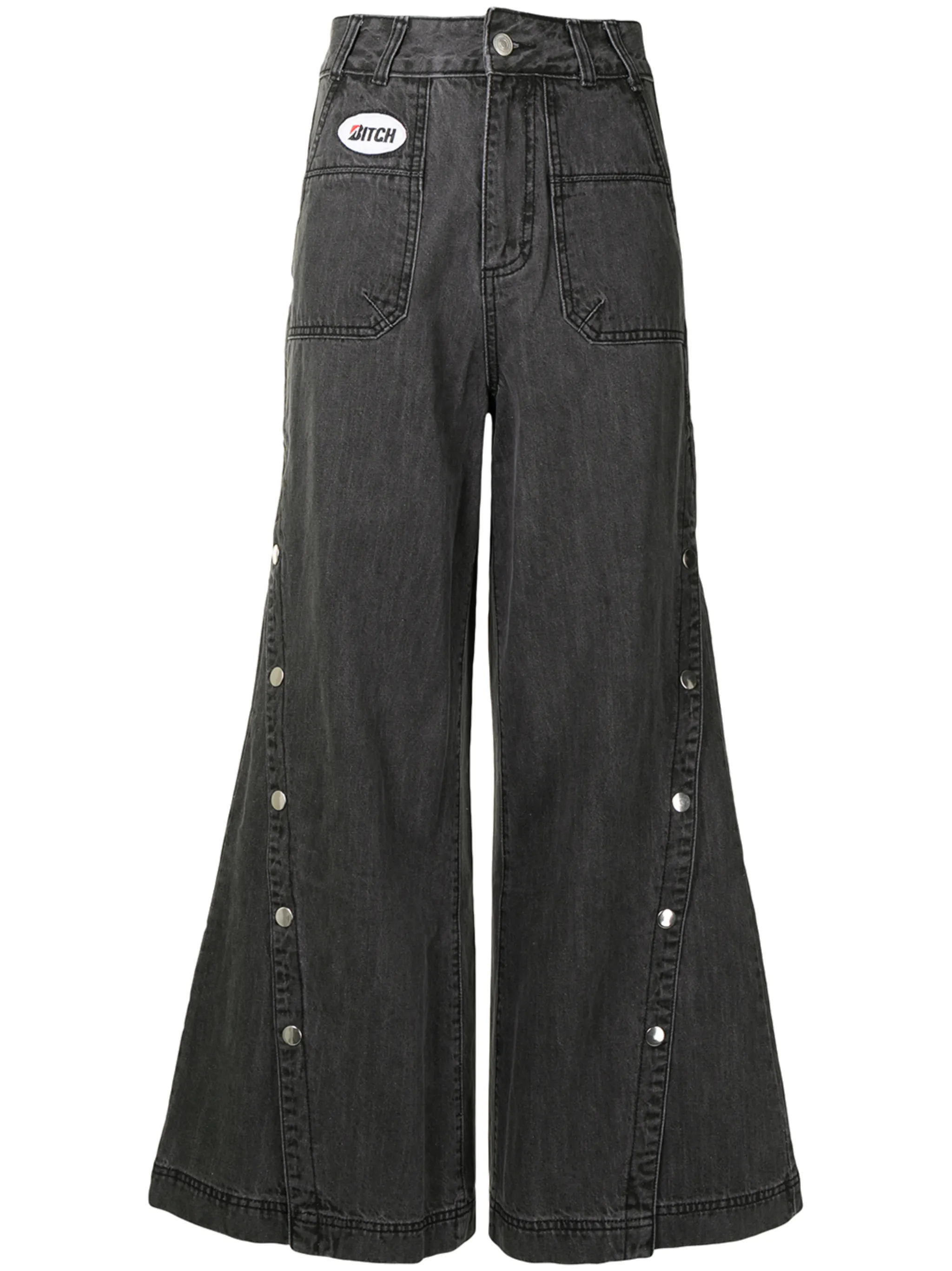 Нашивка с логотипом спереди, петли для ремня, потайная застежка спереди, два передних кармана, задние карманы с листочкой, пуговичная застежка сбоку и свободный крой.