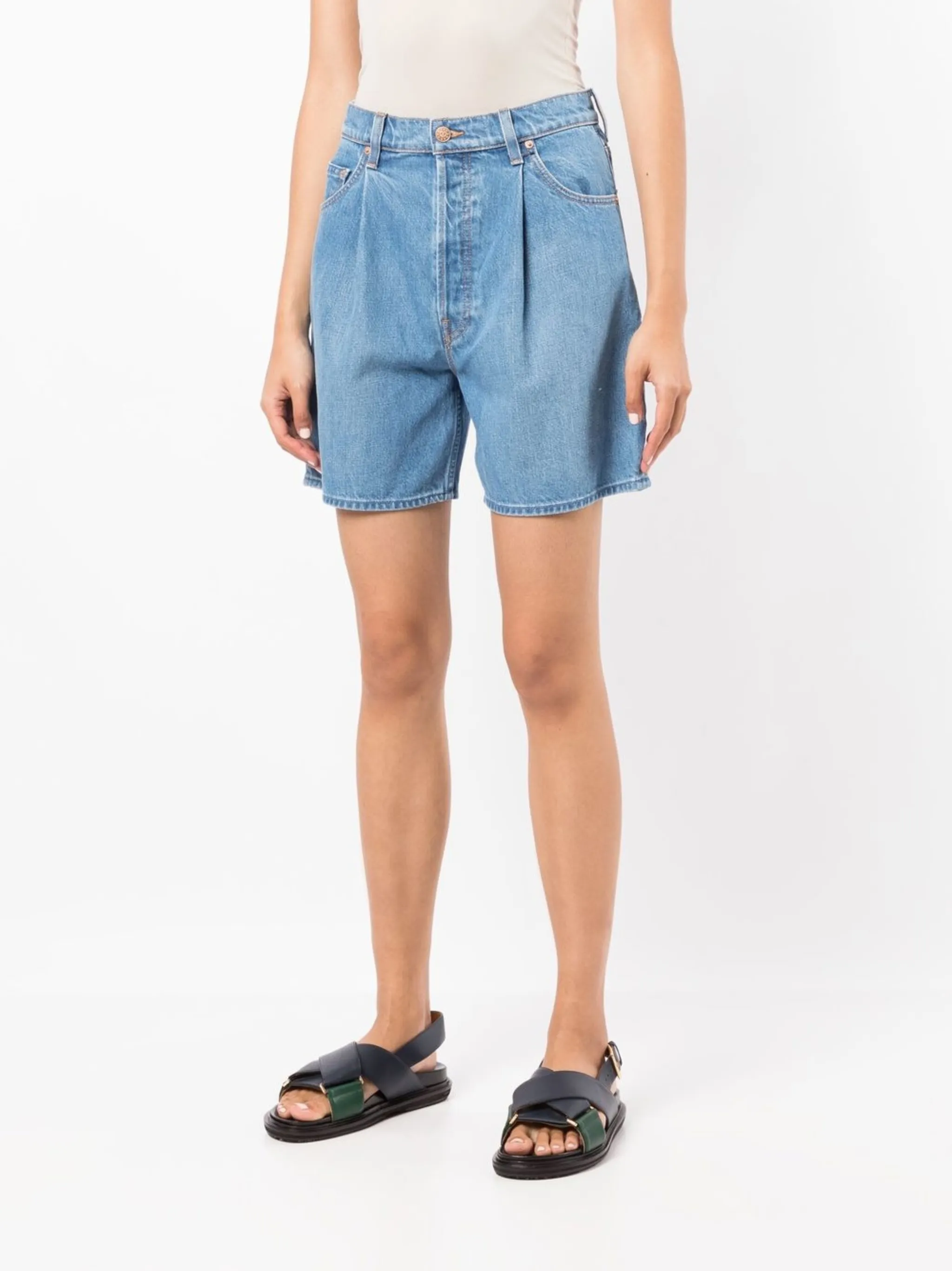 Синий, хлопок, средняя посадка, складки, петли для ремня, застежка на пуговицах спереди и пять карманов.