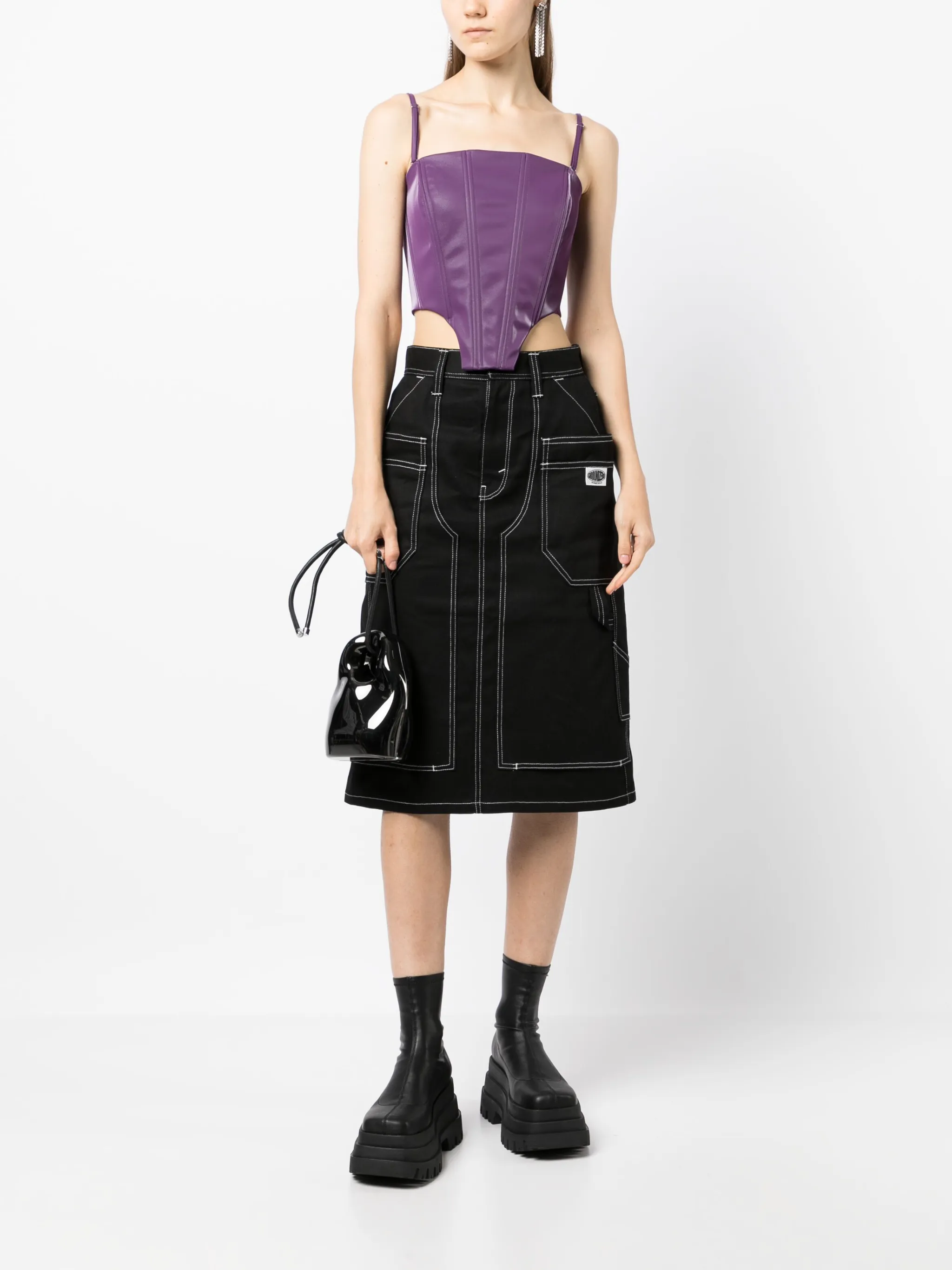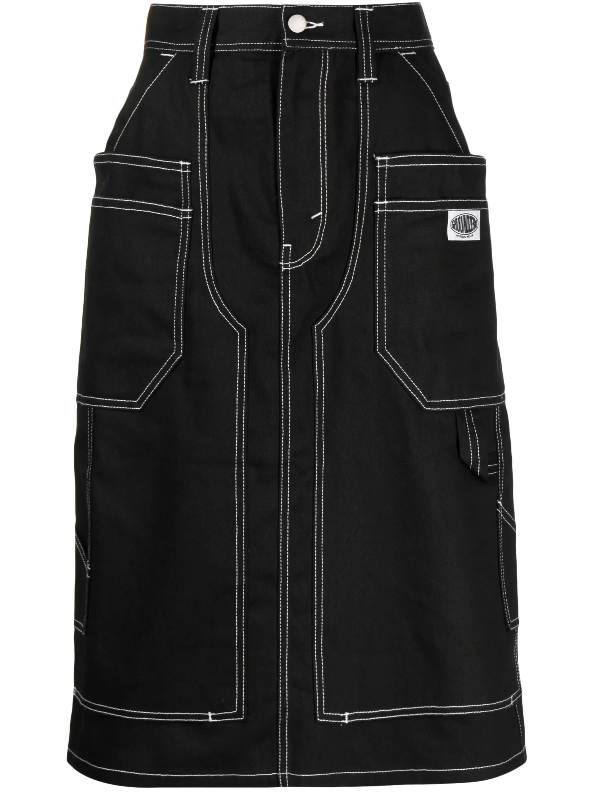 Черный, хлопок, деним, нашивка с логотипом спереди, контрастная строчка, завышенная талия, петли для ремня, застежка на молнии и пуговице спереди, два накладных кармана по бокам, накладные карманы сбоку, прямой подол и длина миди.