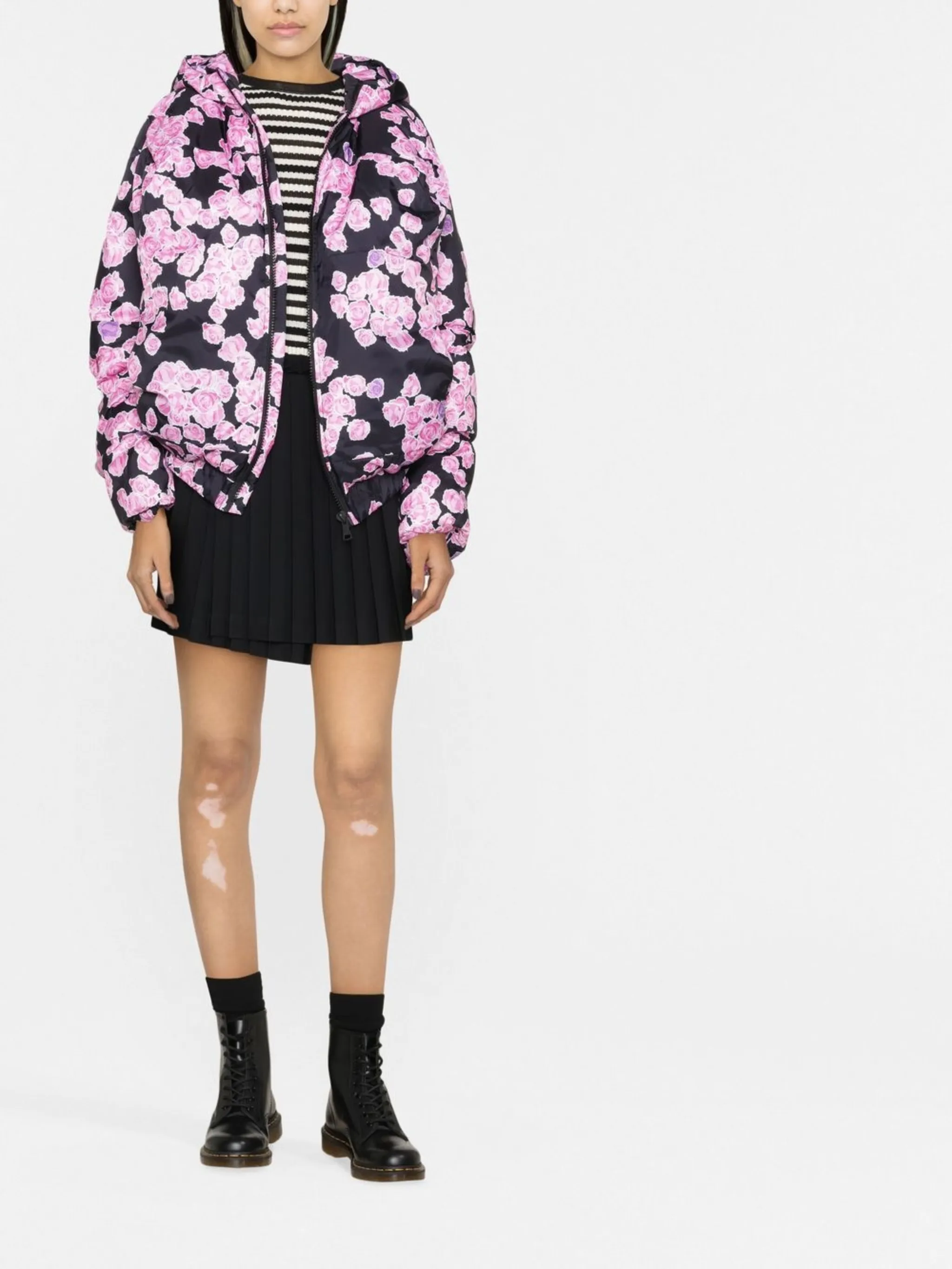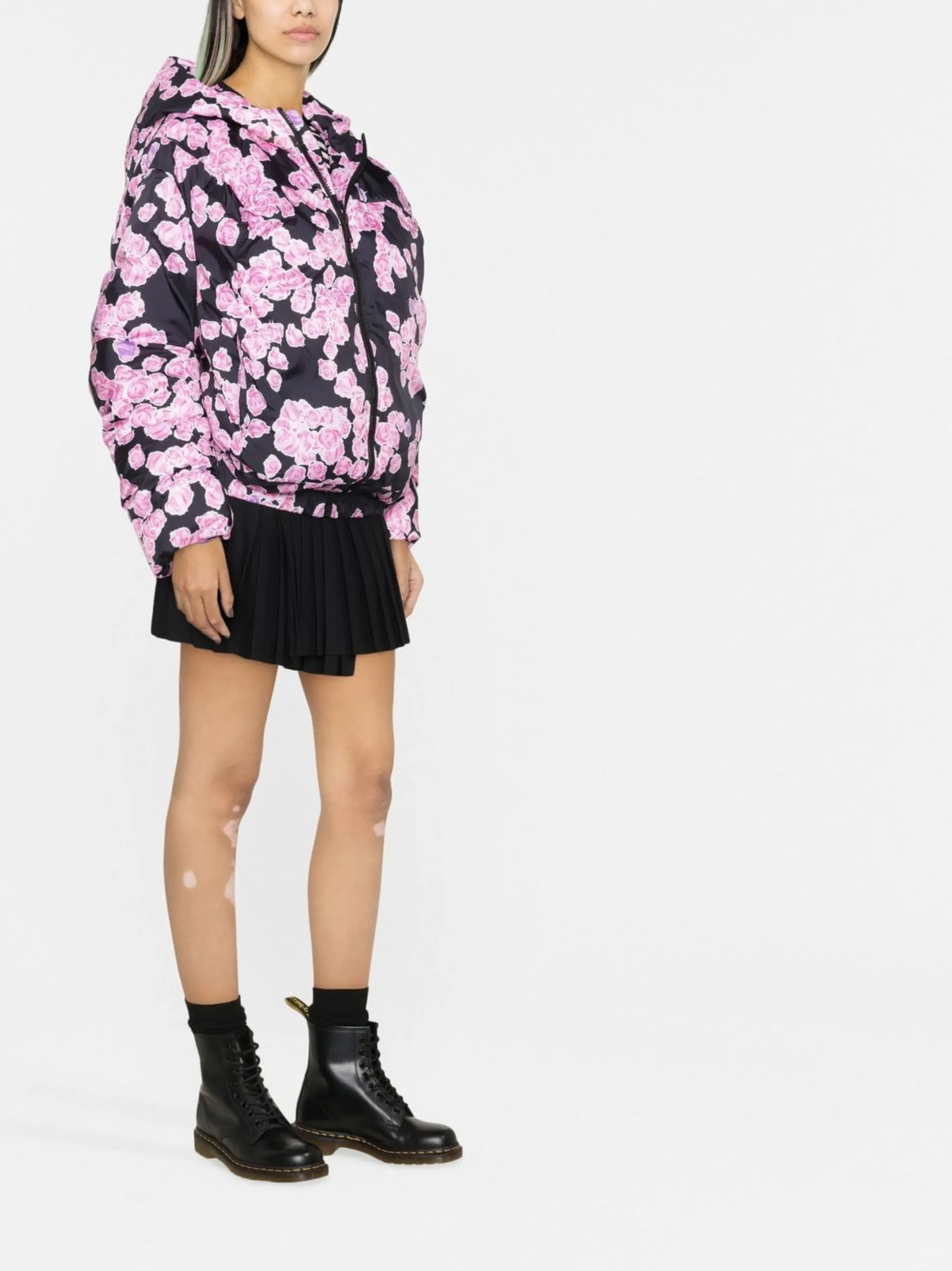 Черный, сплошной принт с изображением роз, застежка на молнии спереди и длинные рукава.