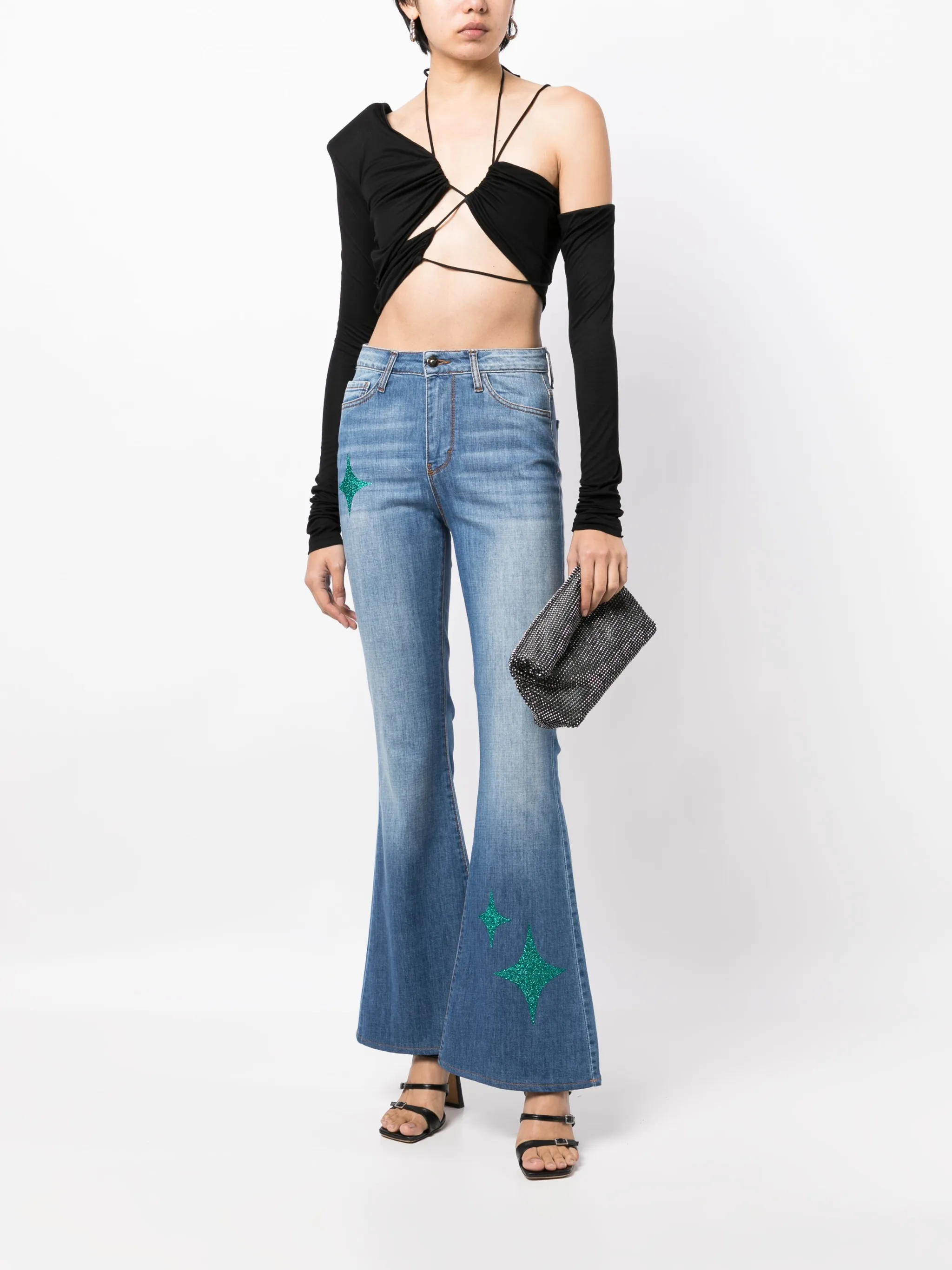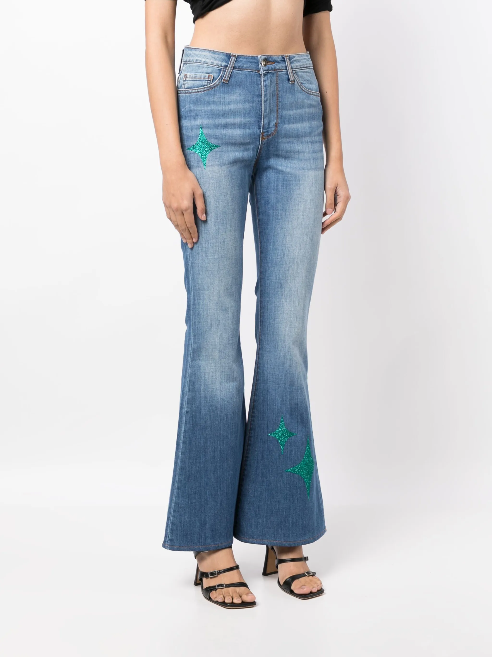Индиго, эластичный хлопок, обработанный деним, декоративные складки, принт с изображением звезд, блестящий материал, завышенная талия, расклешенный крой, потайная застежка на молнии и пуговицах, пять карманов и прямой подол.