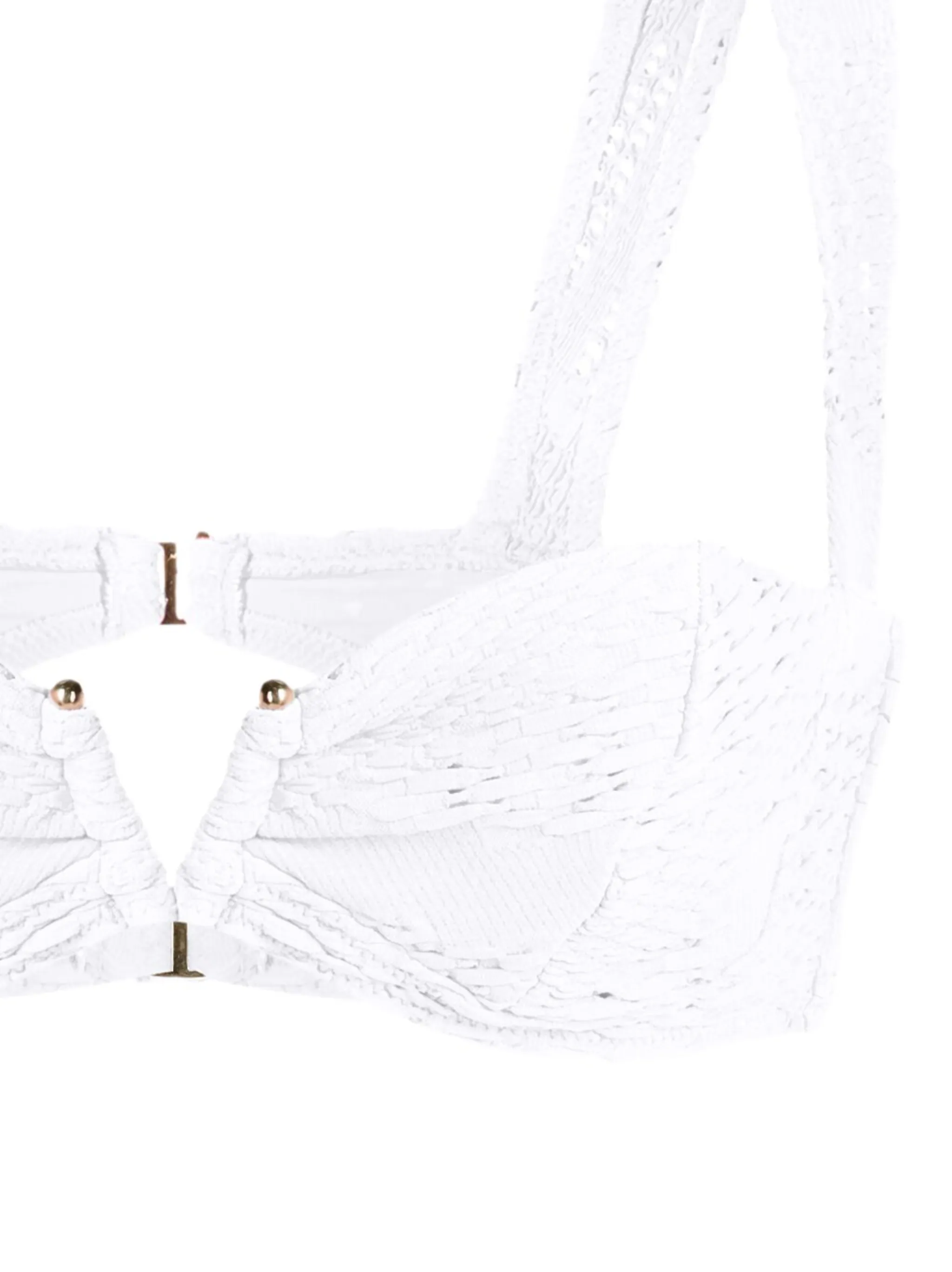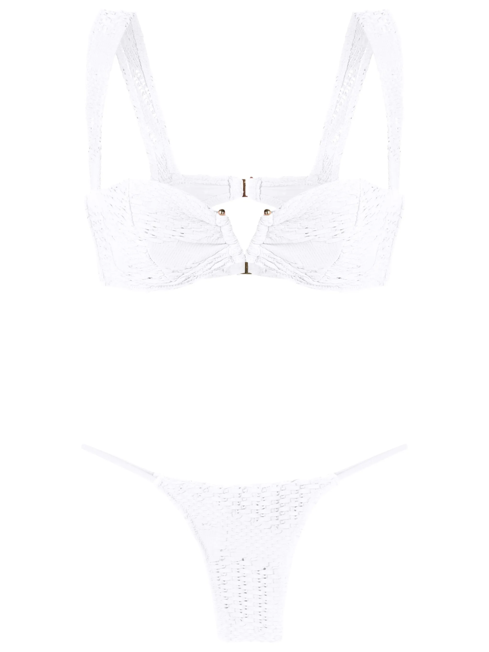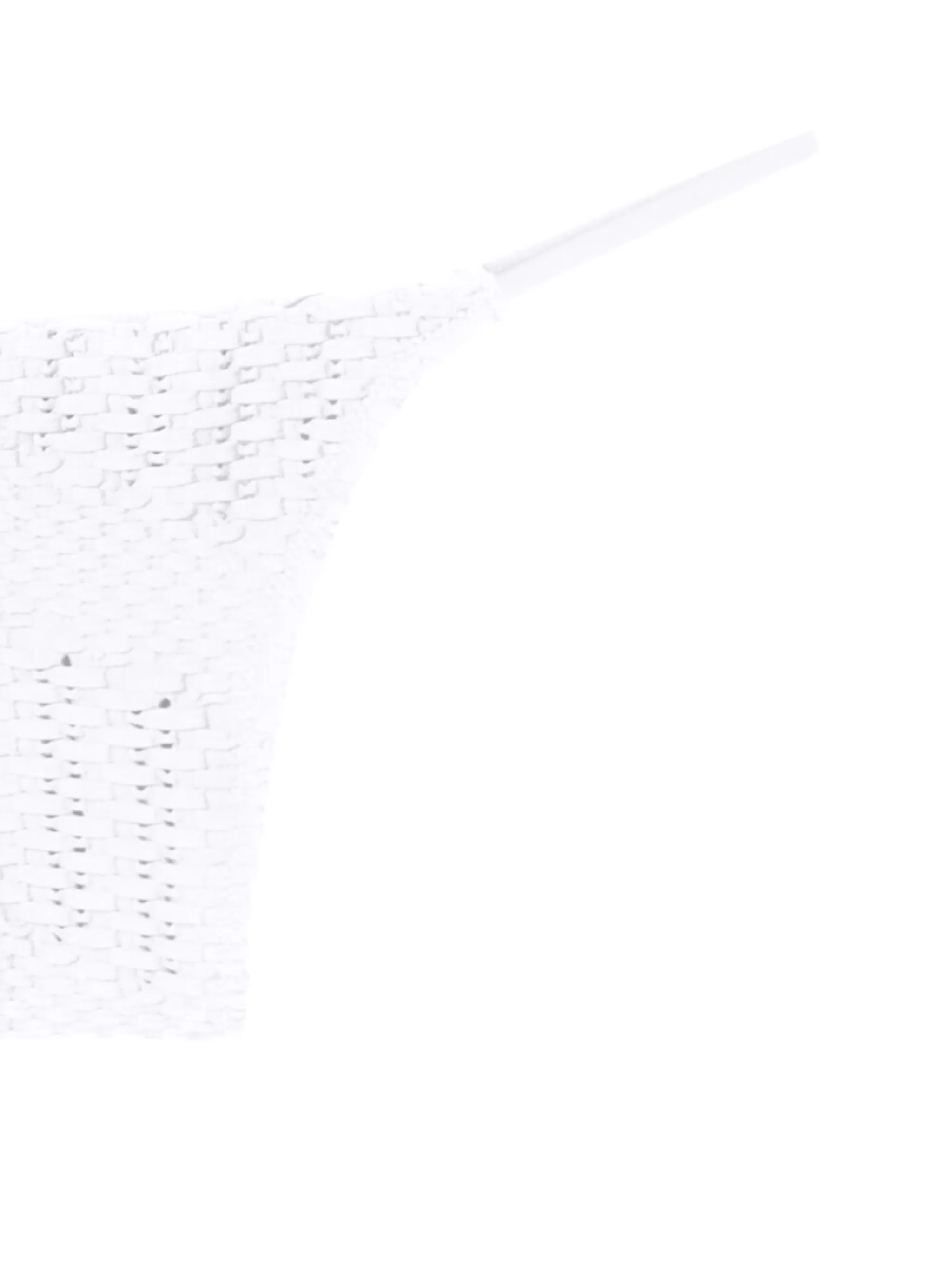 Белый, переплетенный дизайн, дутый материал, вырезные детали, балконет, чашка на косточках, тонкие бретели, застежка на зажиме сзади, переплетенный дизайн, низкая посадка и эластичный материал.
