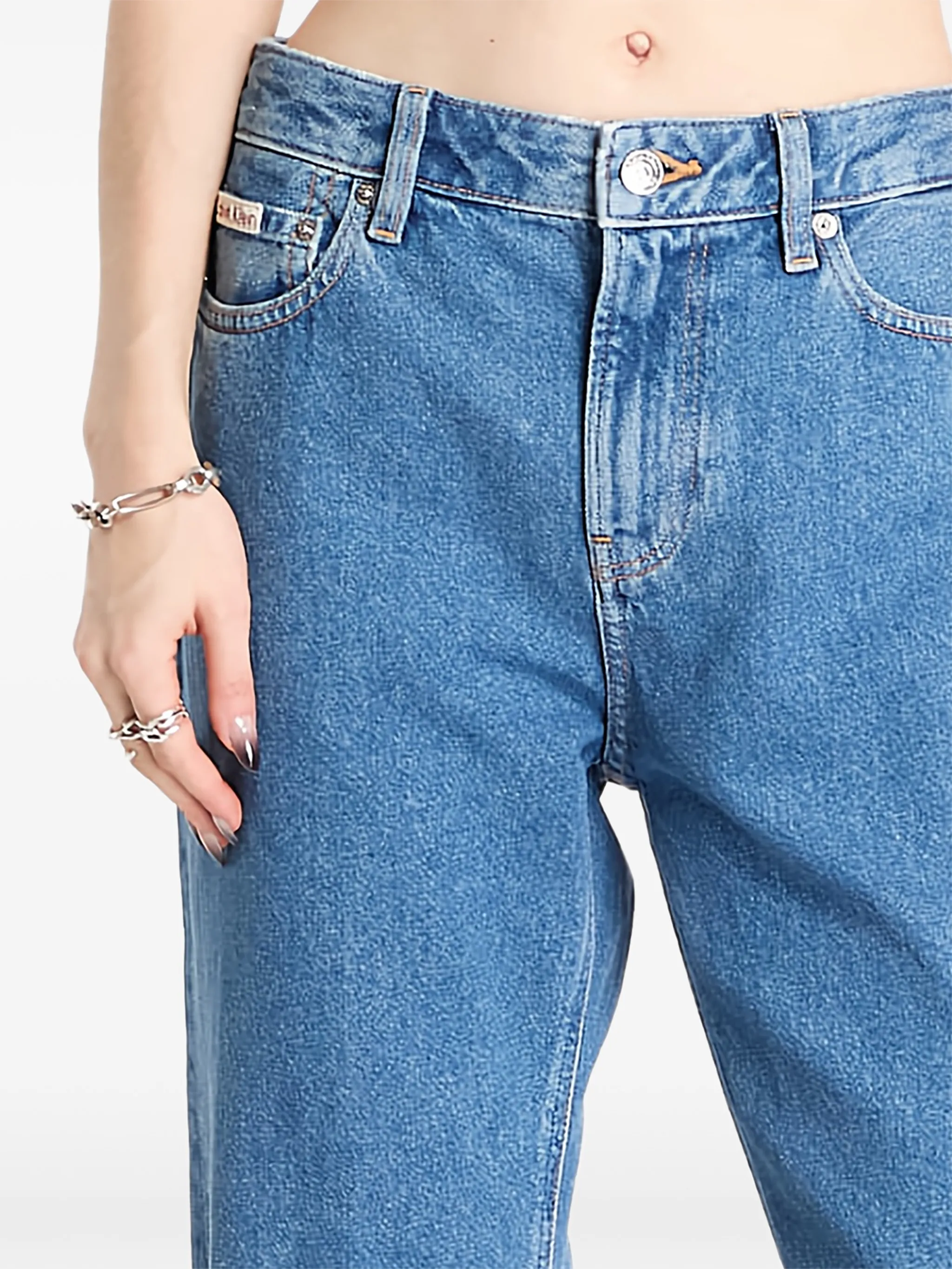 Синие, прямые брюки с разорванной деталью, пять карманов, шлевки для ремня, потайная ширинка