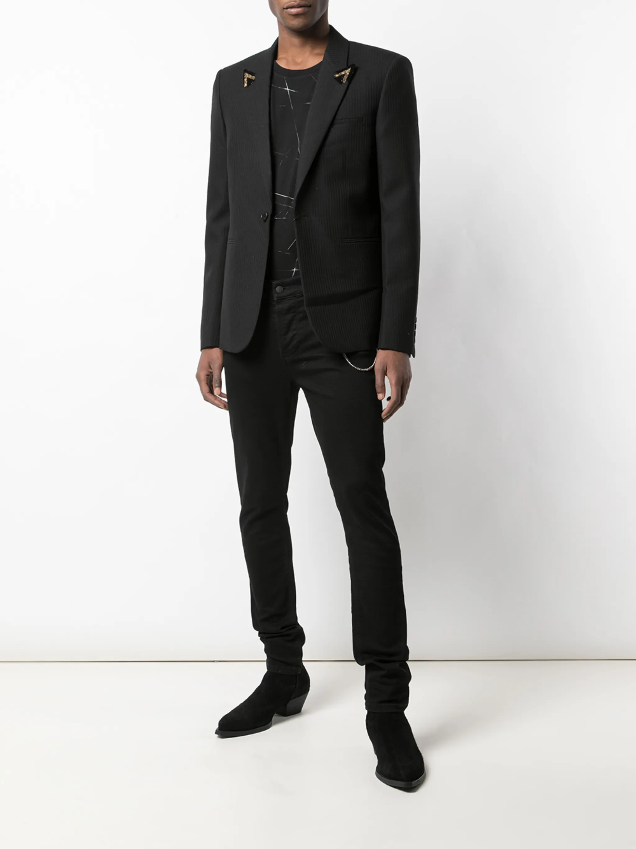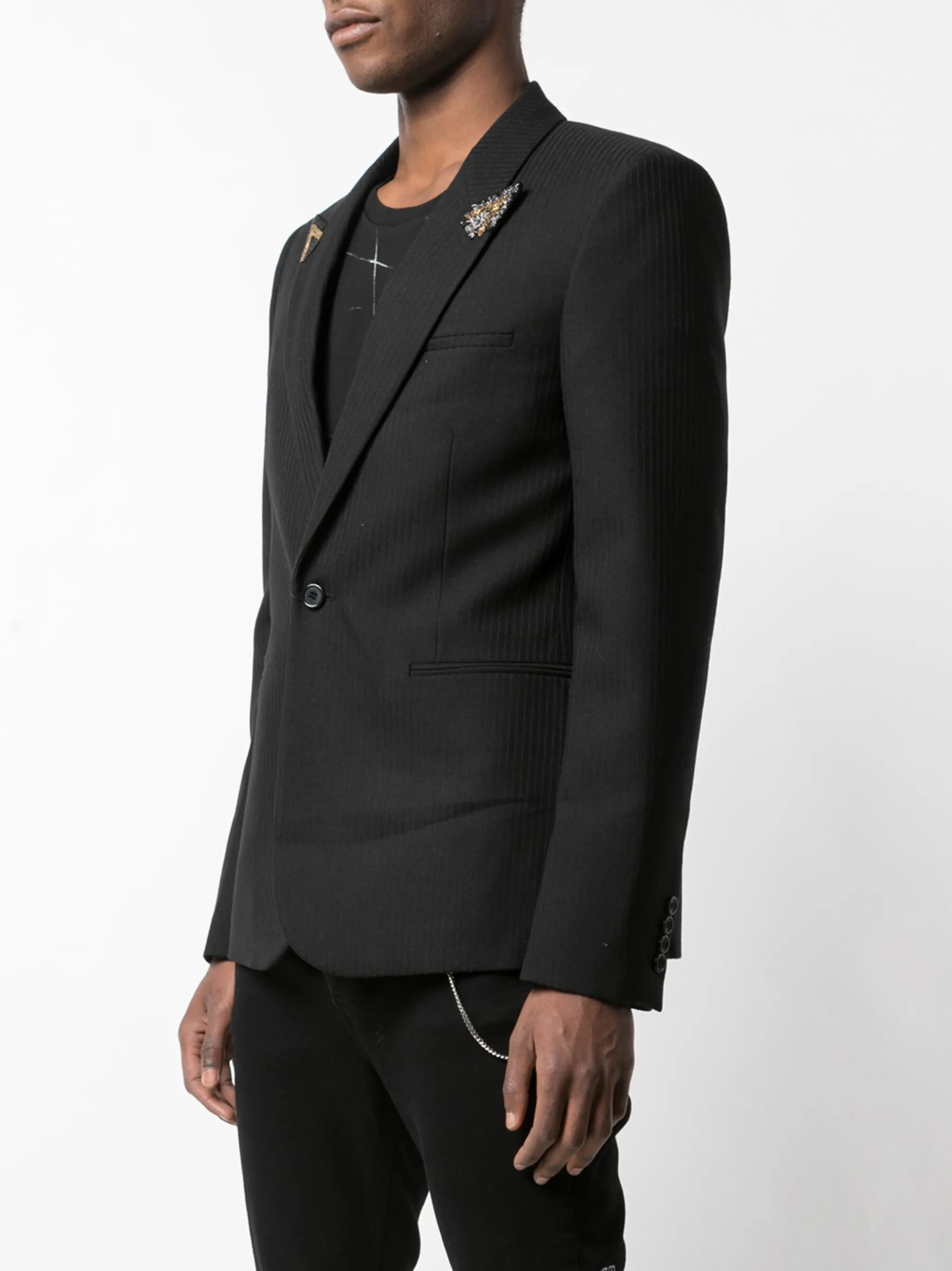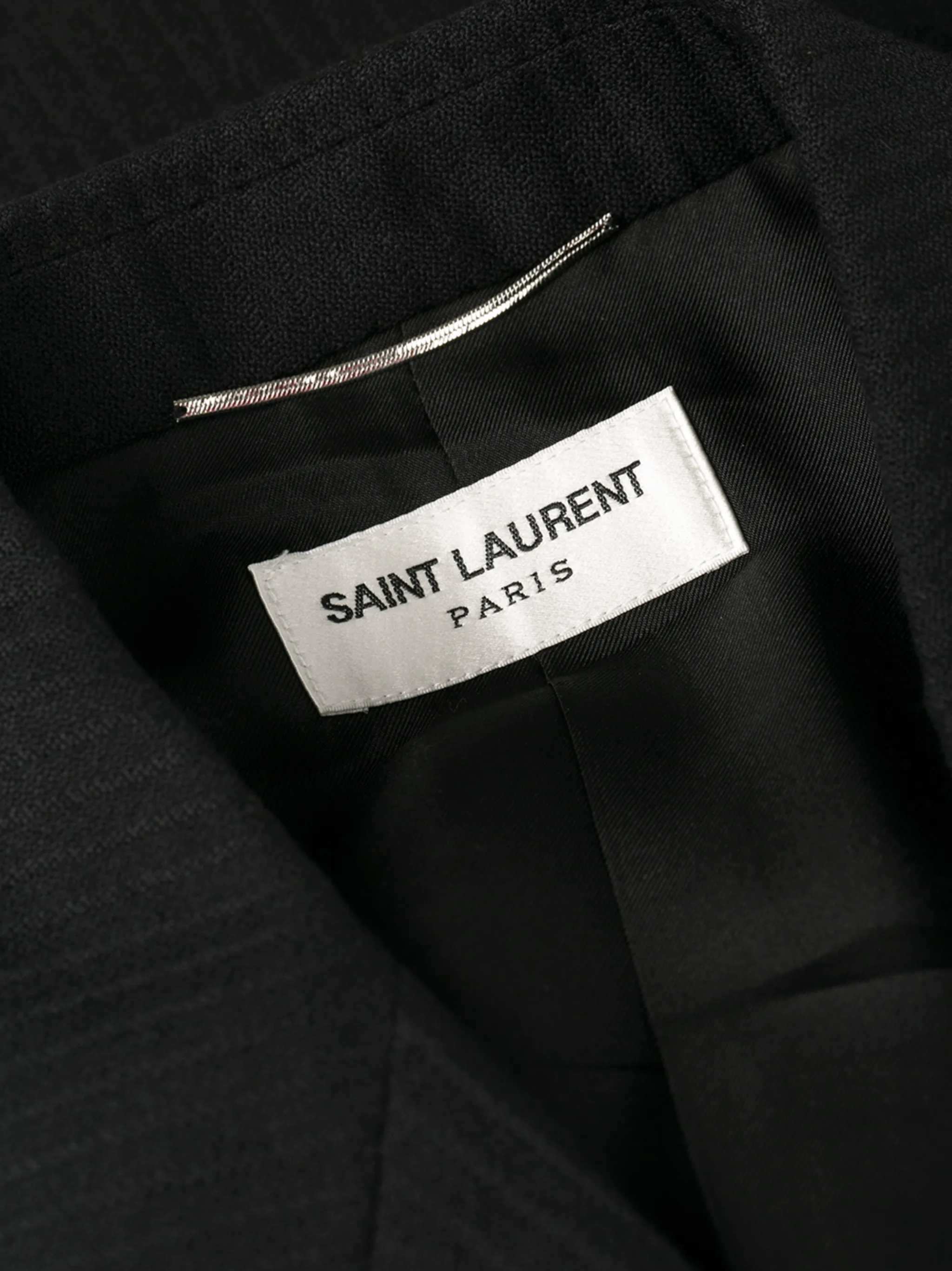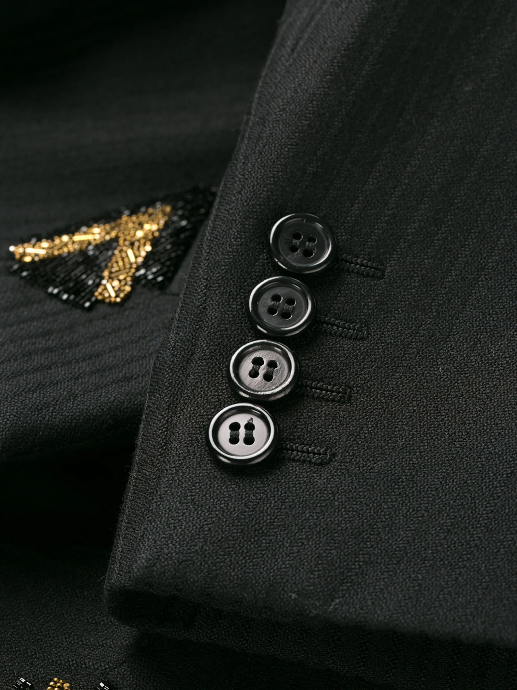 Приталенный блейзер с бисером от Saint Laurent (Сен Лоран). Приталенный силуэт, боковые карманы, манжеты на пуговицах, зазубренный воротник, застежка на пуговицы и нагрудный карман. Цвет: черный.