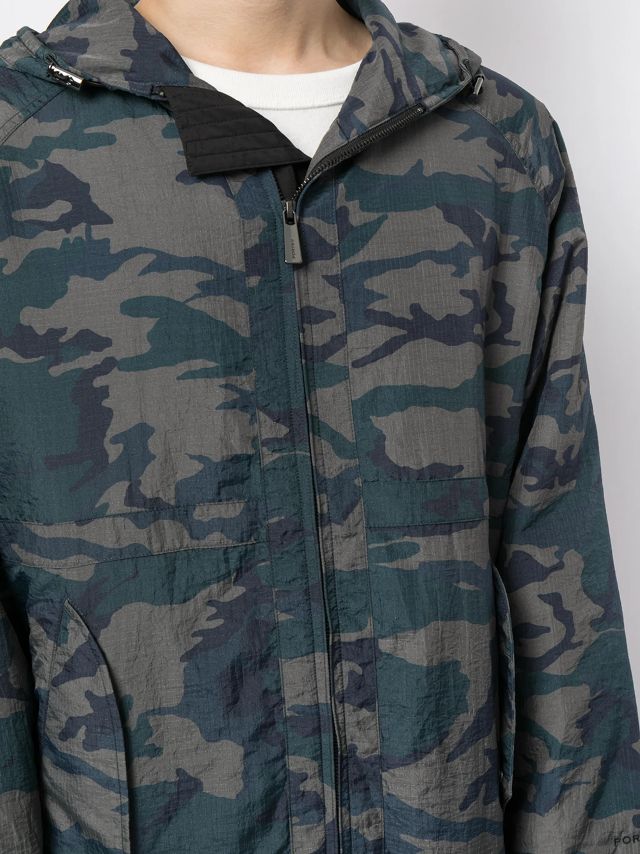 Камуфляжный принт, затягивающийся на шнурок капюшон, застежка на молнии спереди, длинные рукава, два кармана с клапанами по бокам и прямой подол. Цвет: синий. Это унисекс-модель. Обратите внимание, что для нее используется мужская размерная сетка.