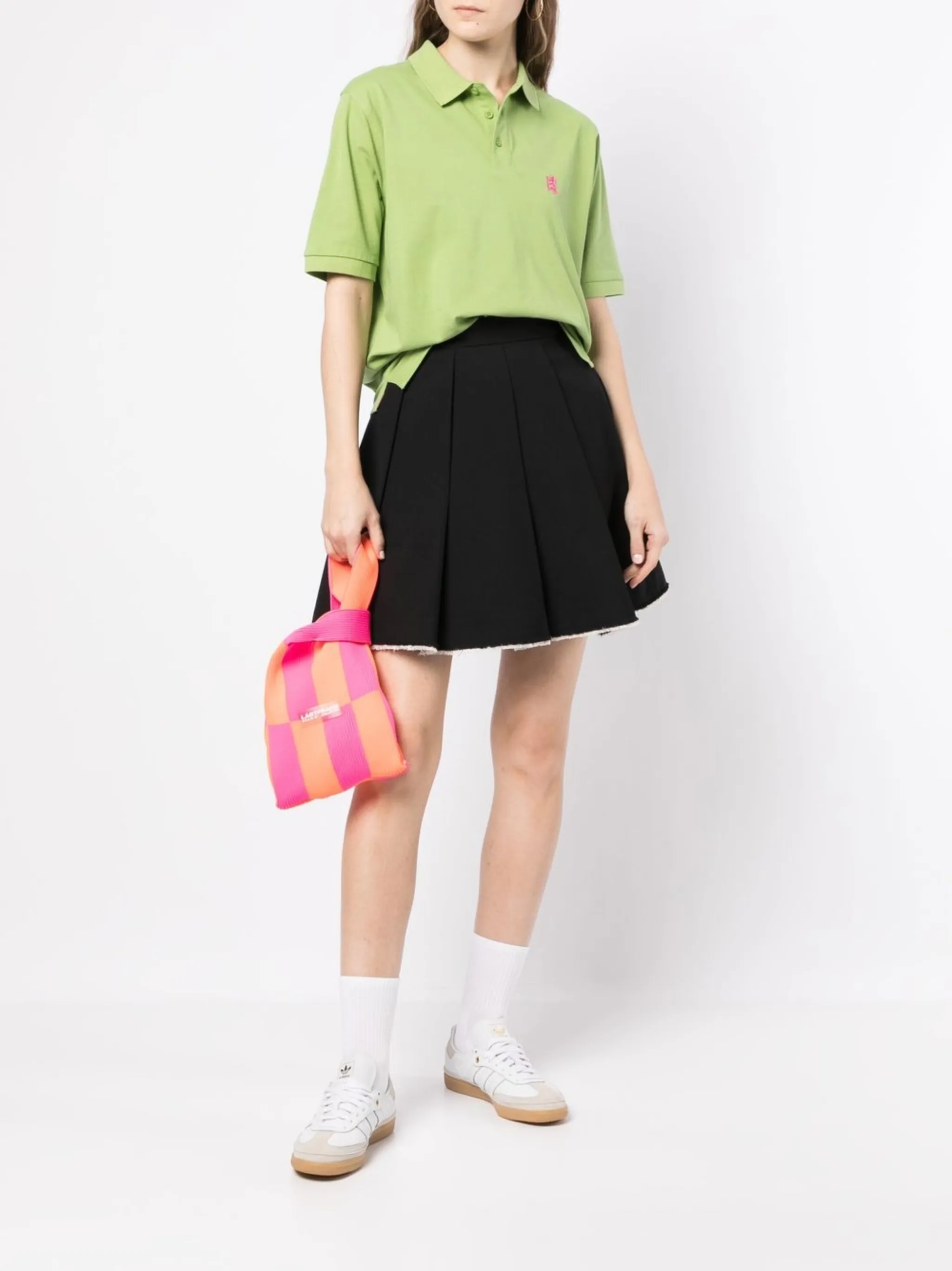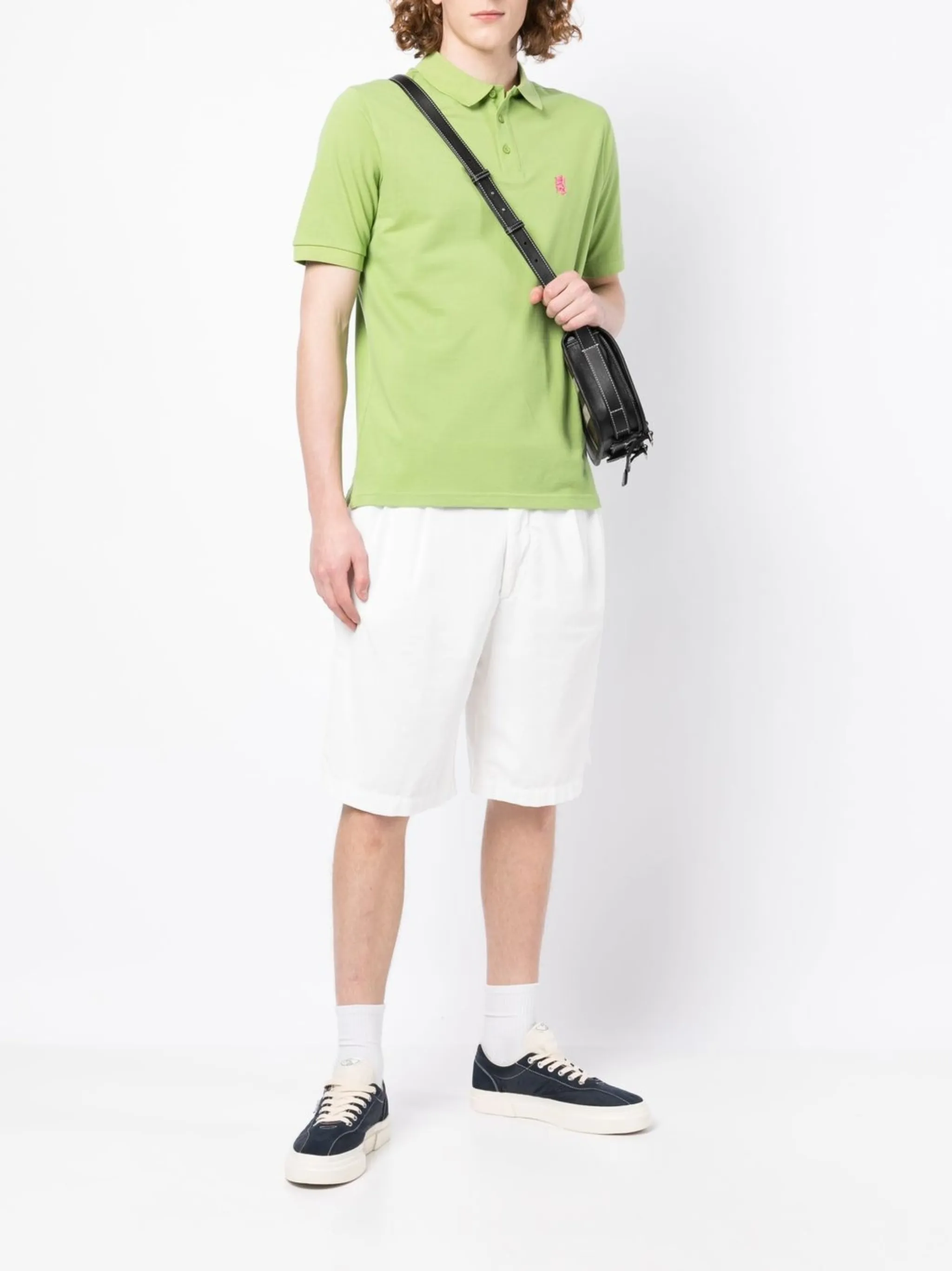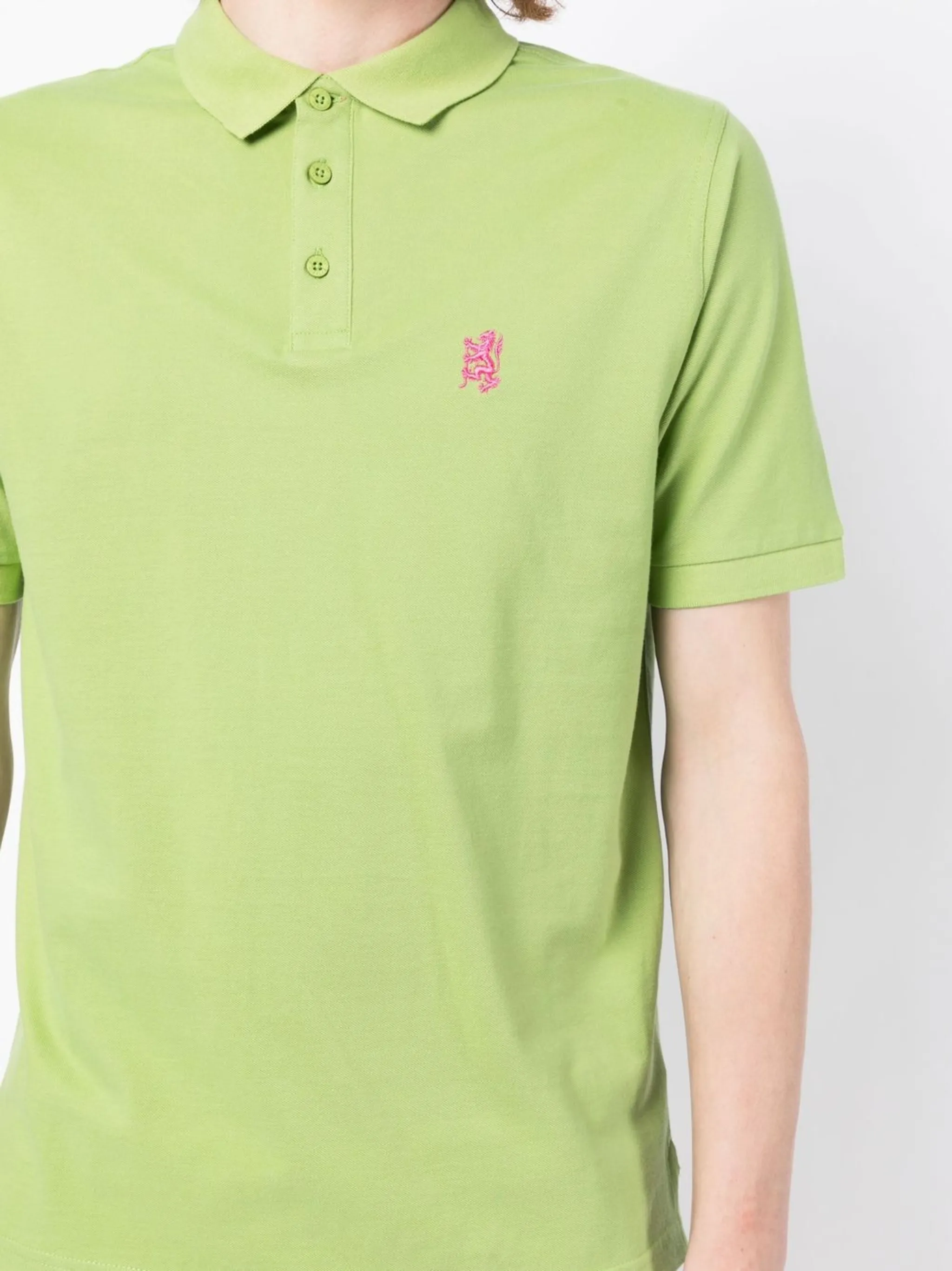 Зеленый чай, хлопок, вышитый логотип на груди, анималистичный принт, воротник поло, планка на пуговицах спереди, короткие рукава и прямой подол. Это унисекс-модель. Обратите внимание, что для нее используется мужская размерная сетка.