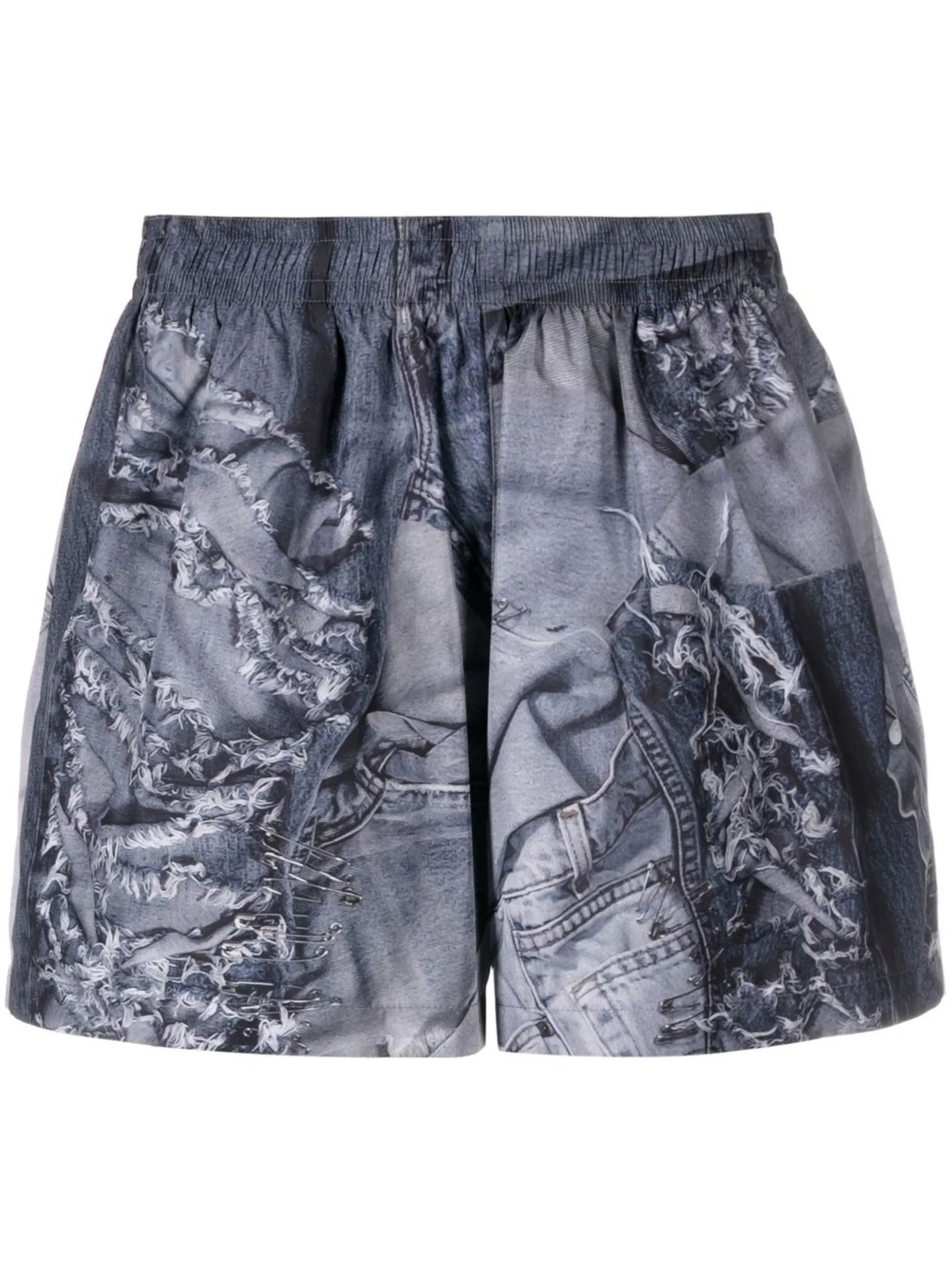 Серый, обработанный деним, абстрактный принт и длина выше колена.