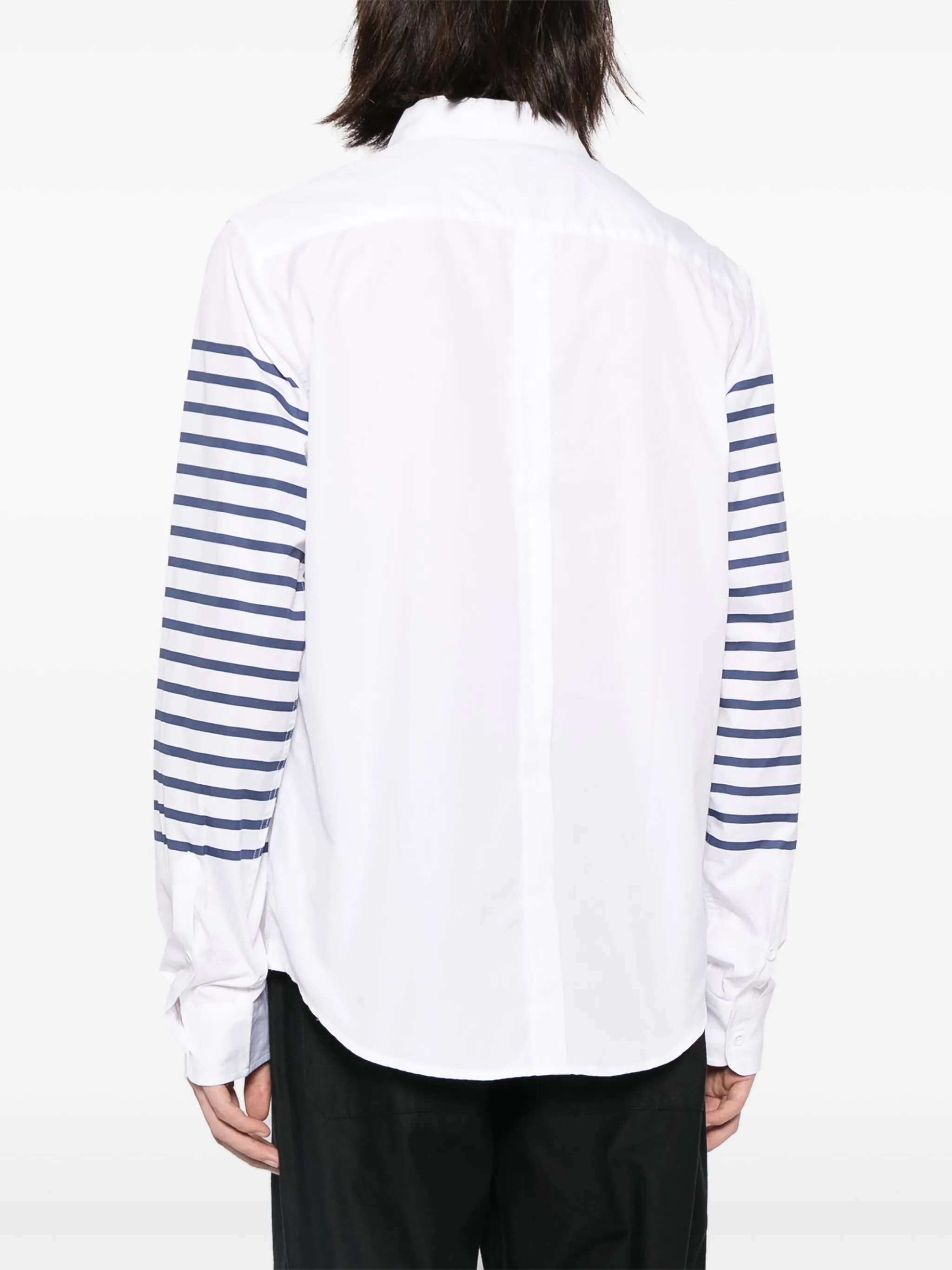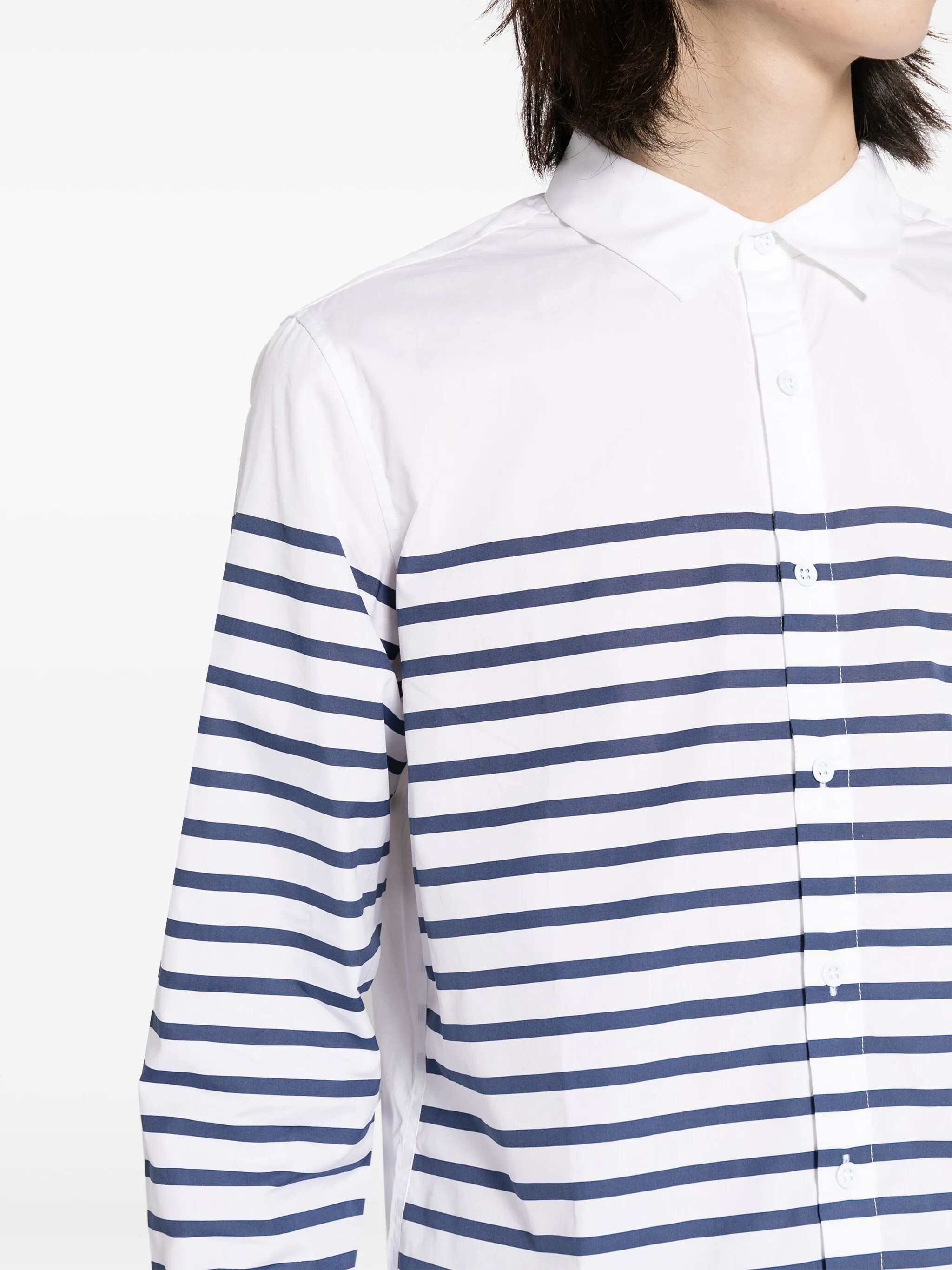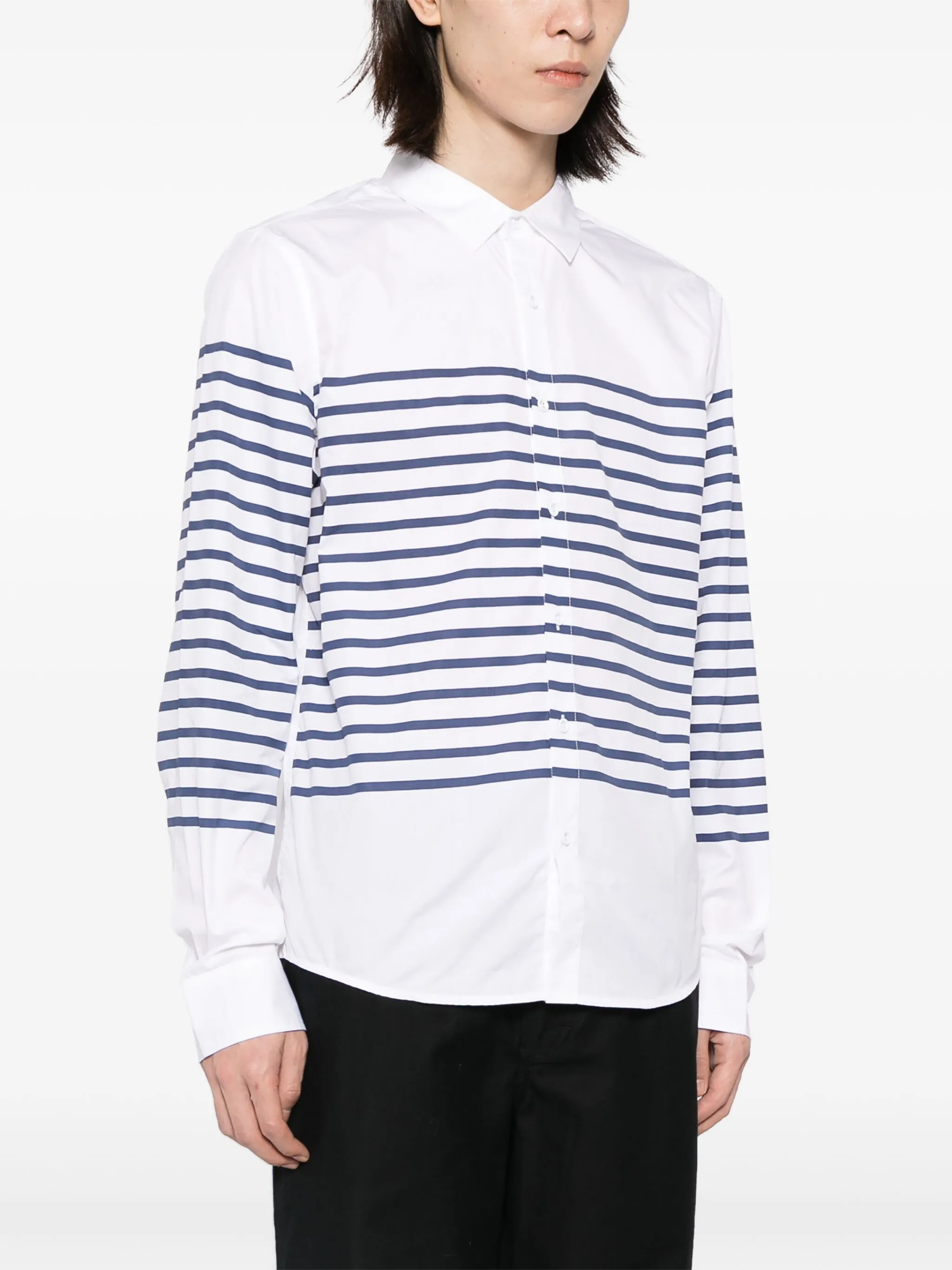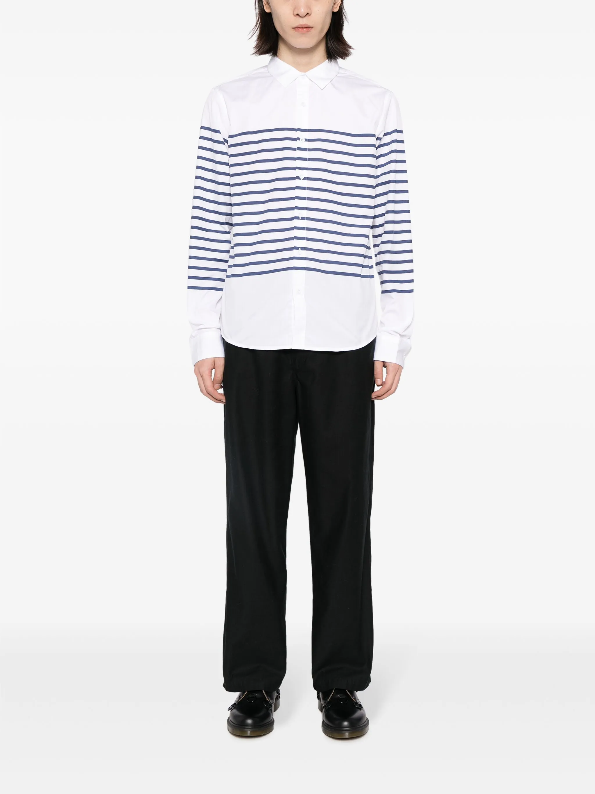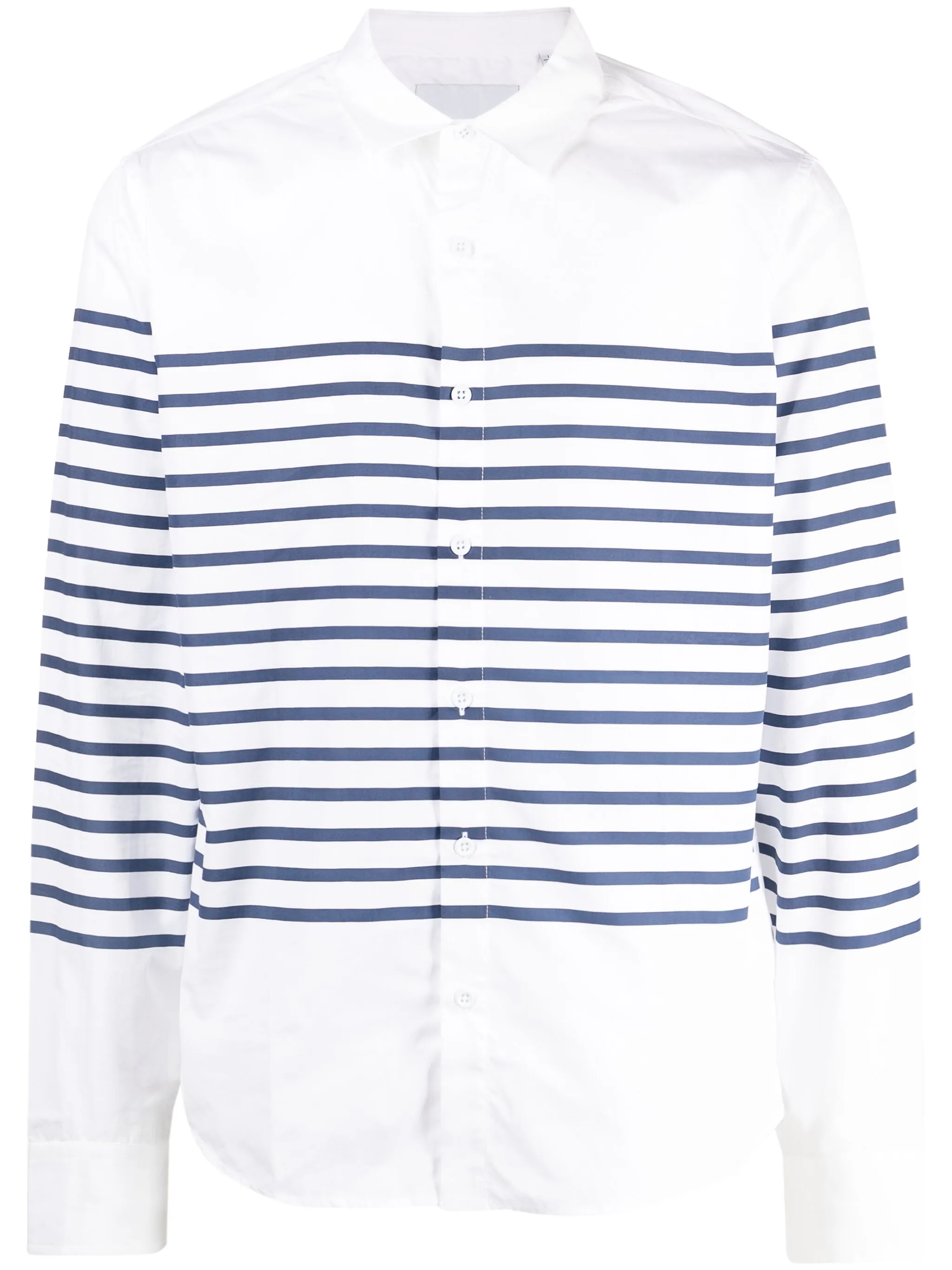 Белый, темно-синий, хлопок, узор в горизонтальную полоску, классический воротник, застежка на пуговицах спереди, длинные рукава, манжеты на пуговицах и закругленный подол.