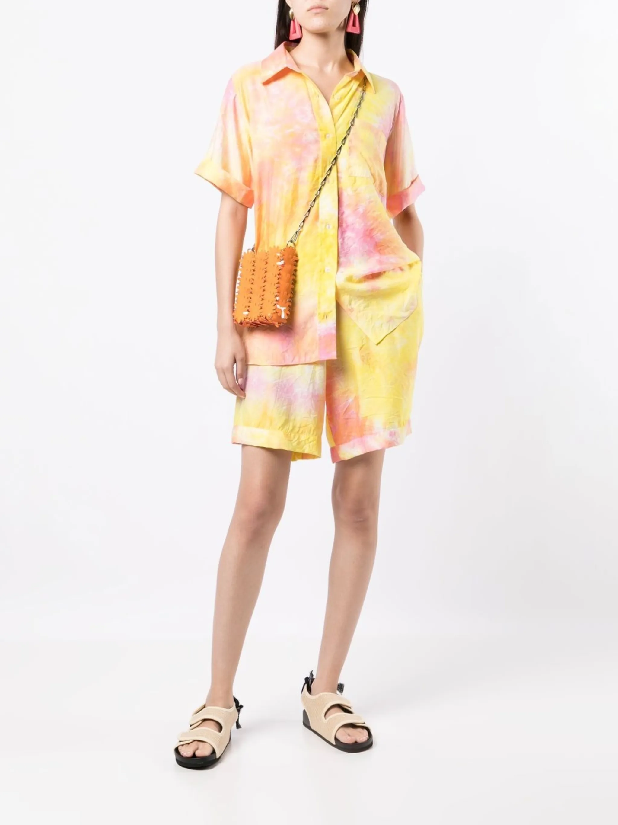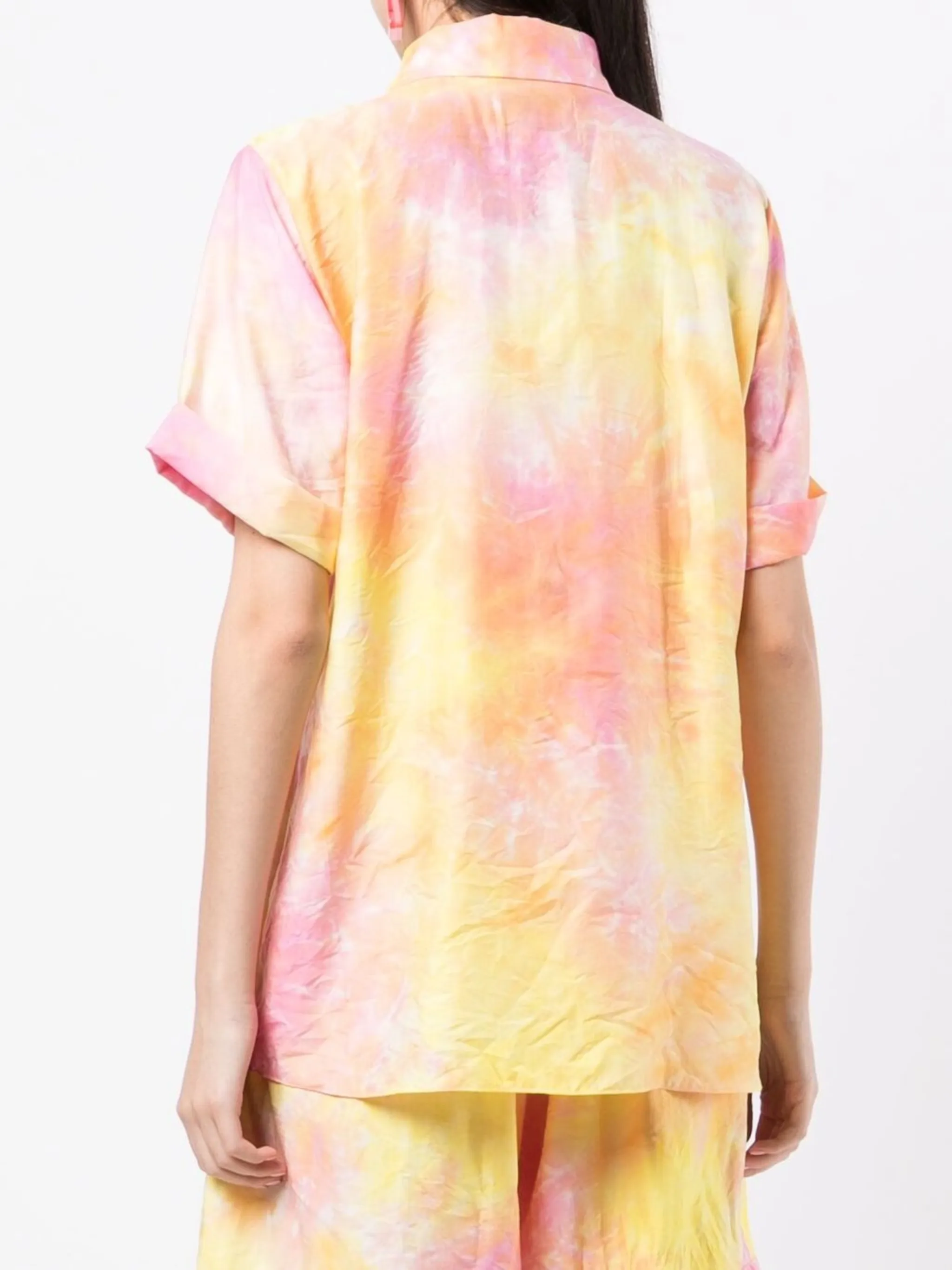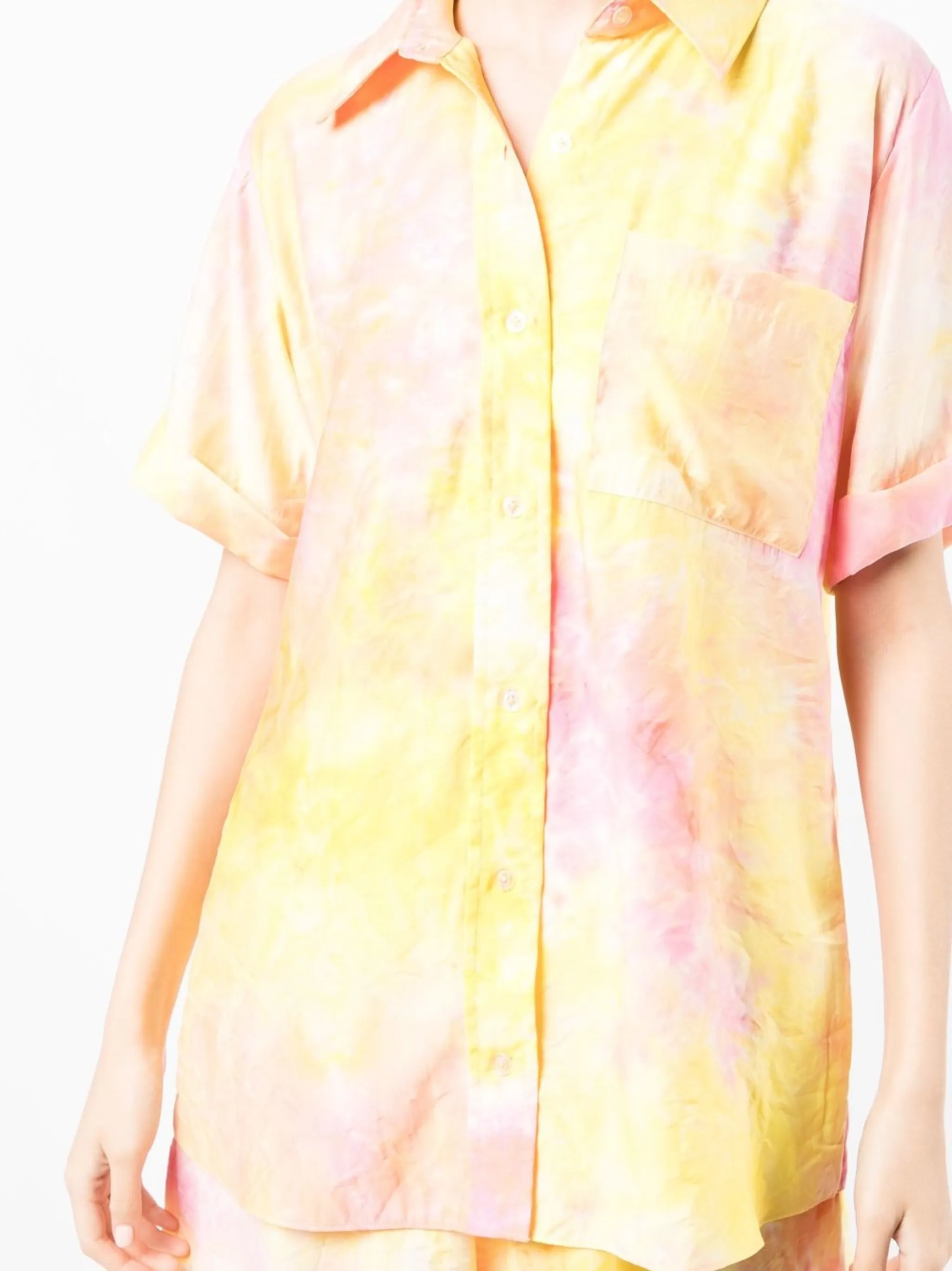 Желтый, принт тай-дай, отложной воротник, нагрудный накладной карман, короткие рукава и застежка на пуговицы.