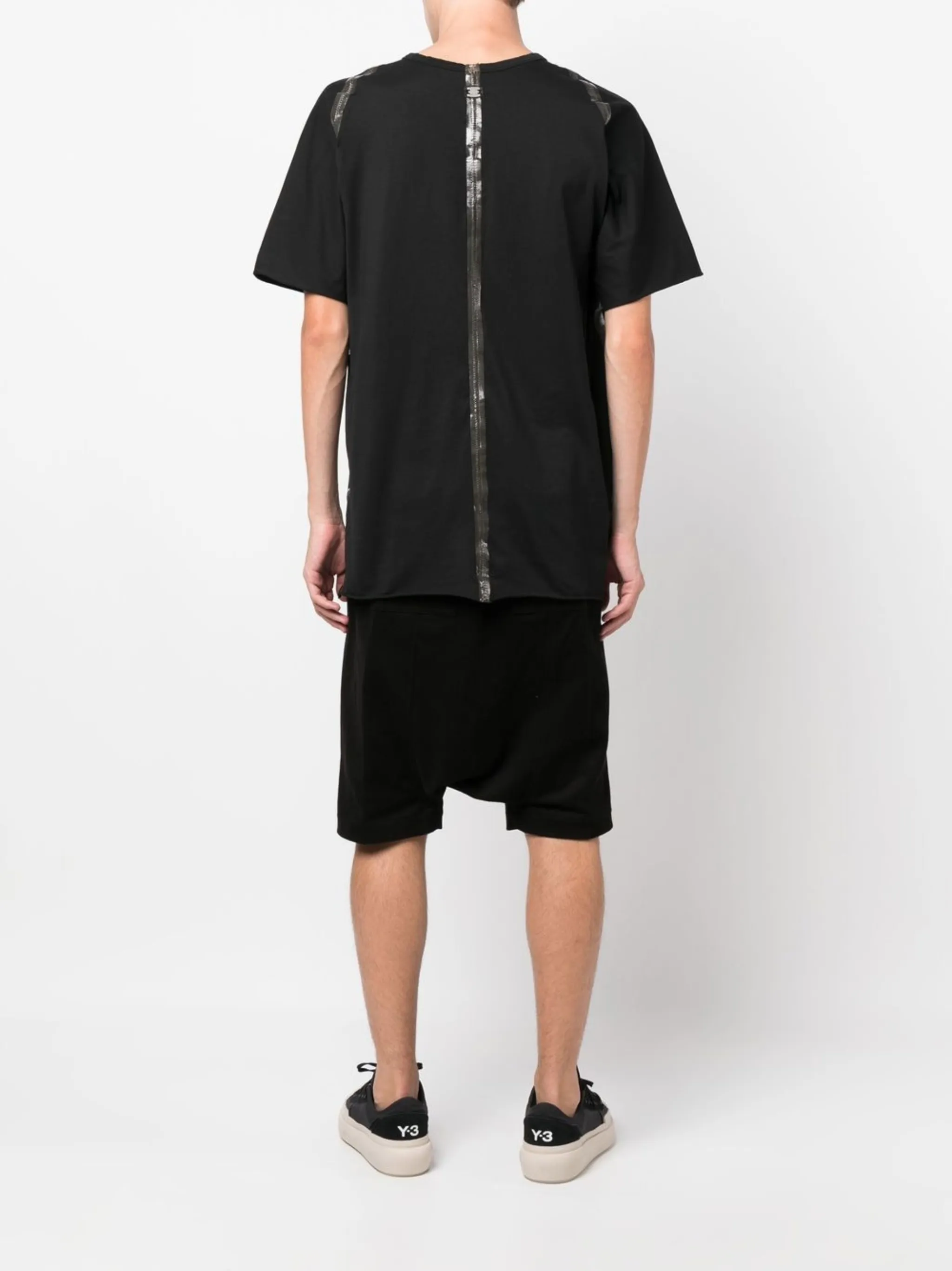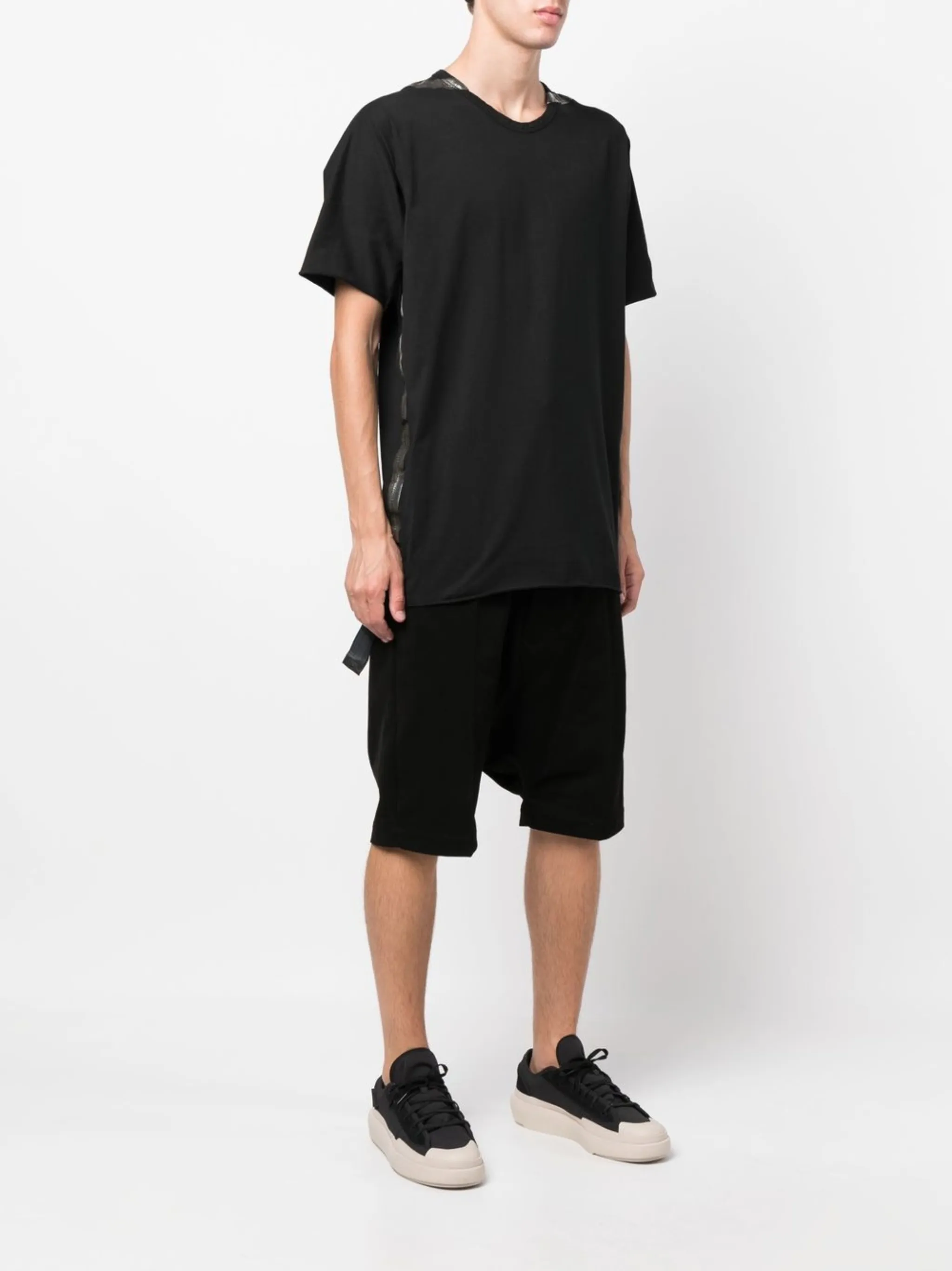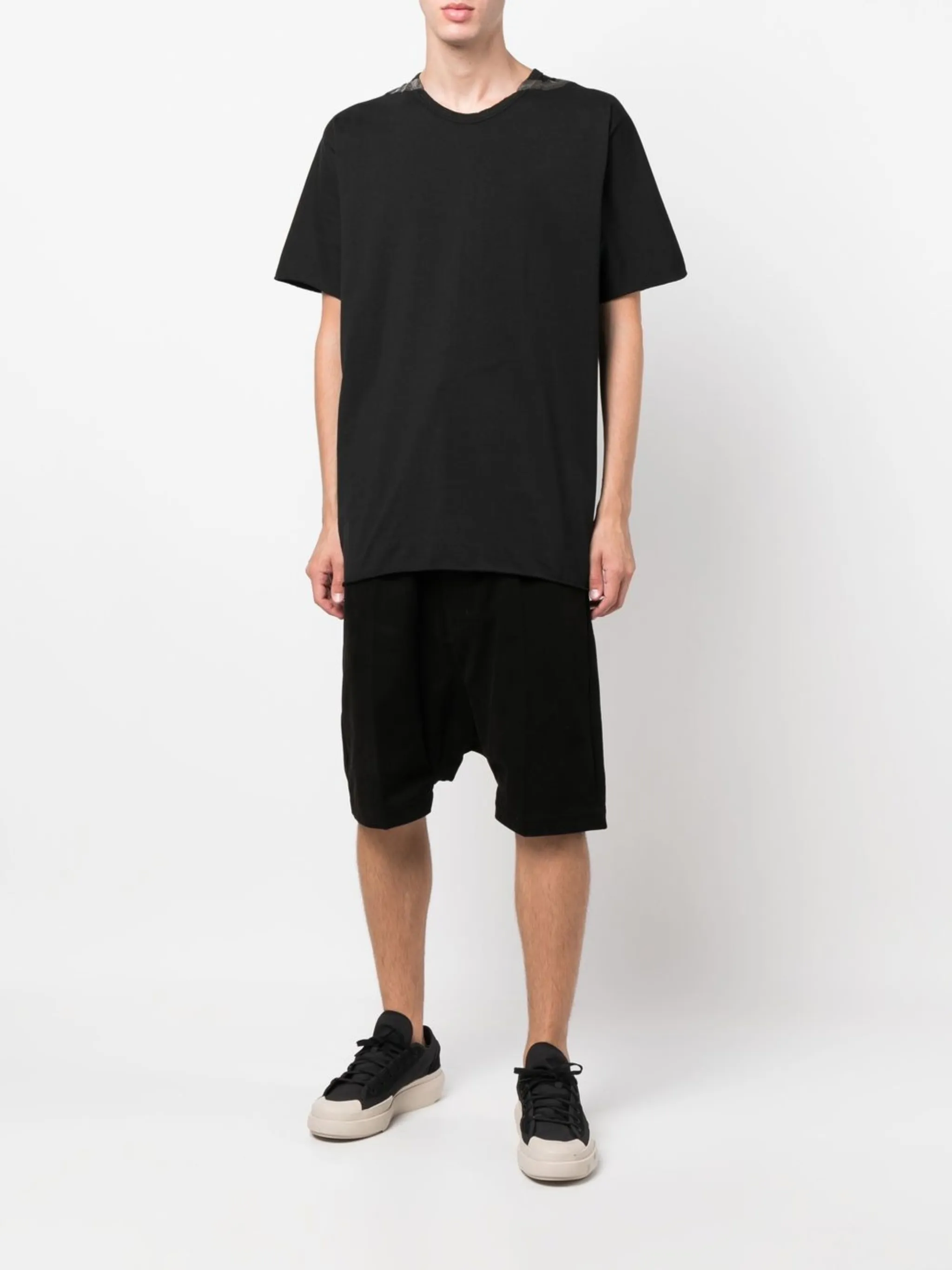 Черный, органический хлопок, швы, нашивка с логотипом сзади, круглый вырез, короткие рукава и прямой подол.