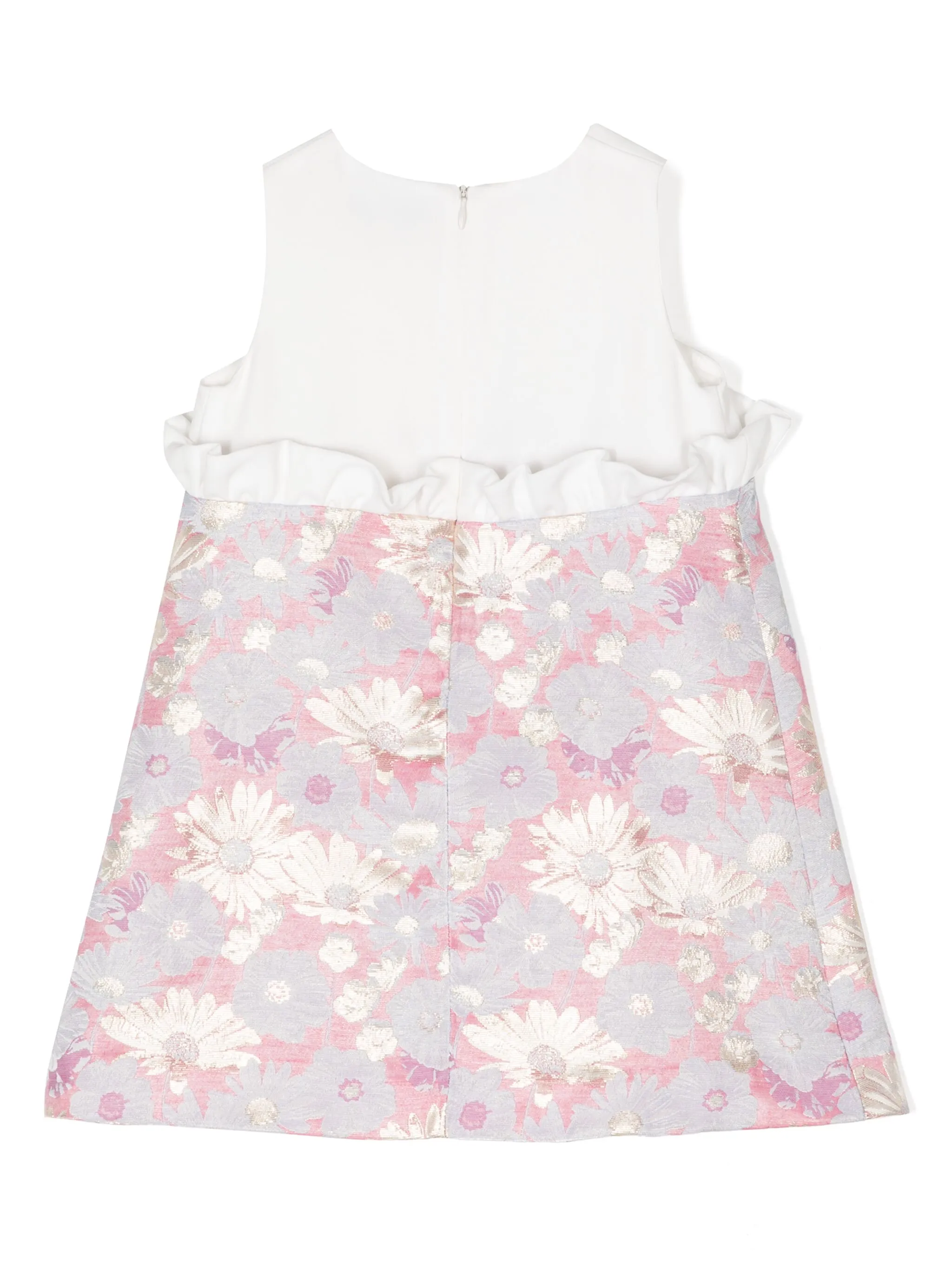 Белый/разноцветный, смесовый хлопок, бант, цветочный принт на юбке, без рукавов, круглый вырез, узкие бретели, потайная застежка сзади и прямой подол.