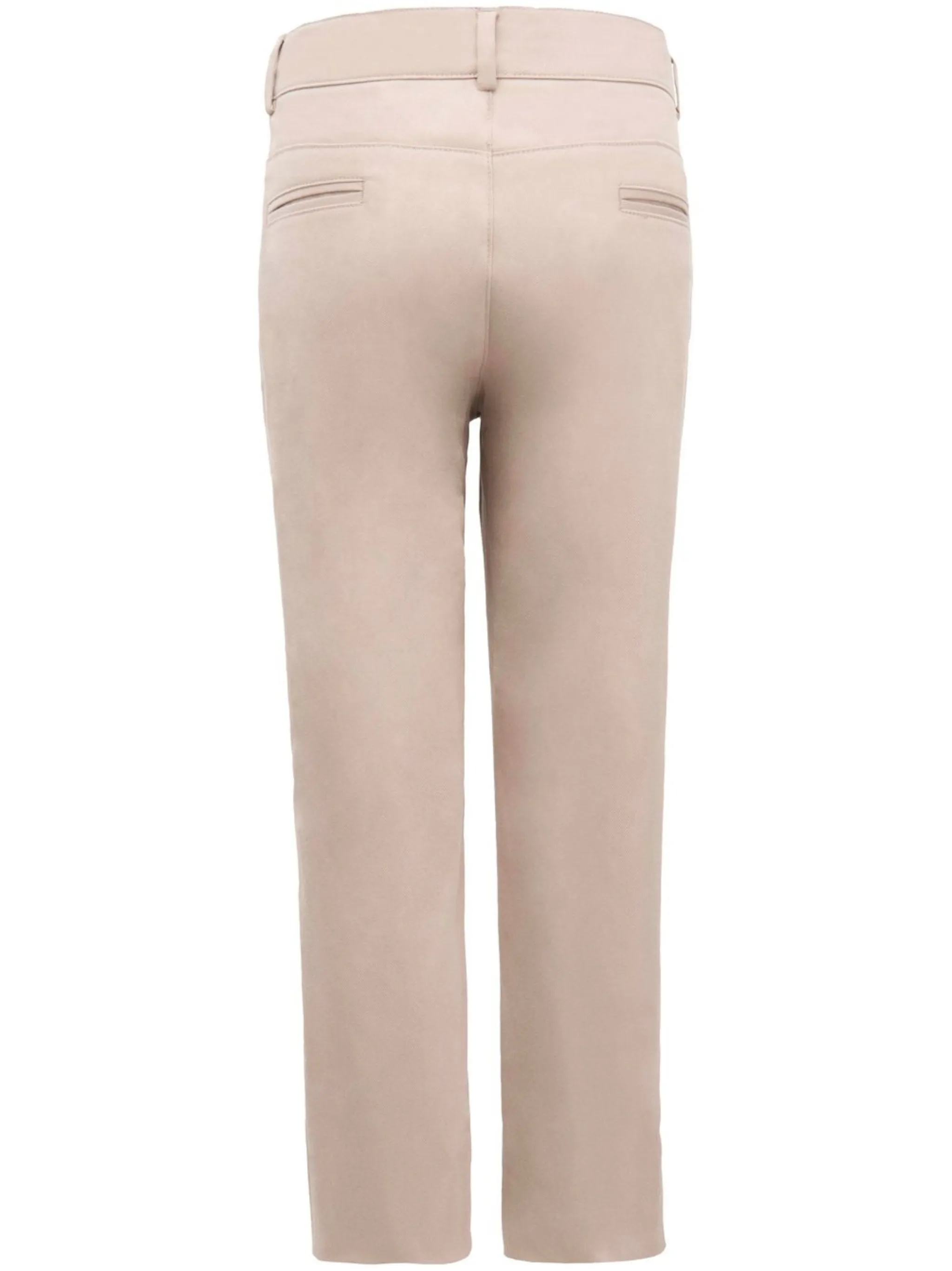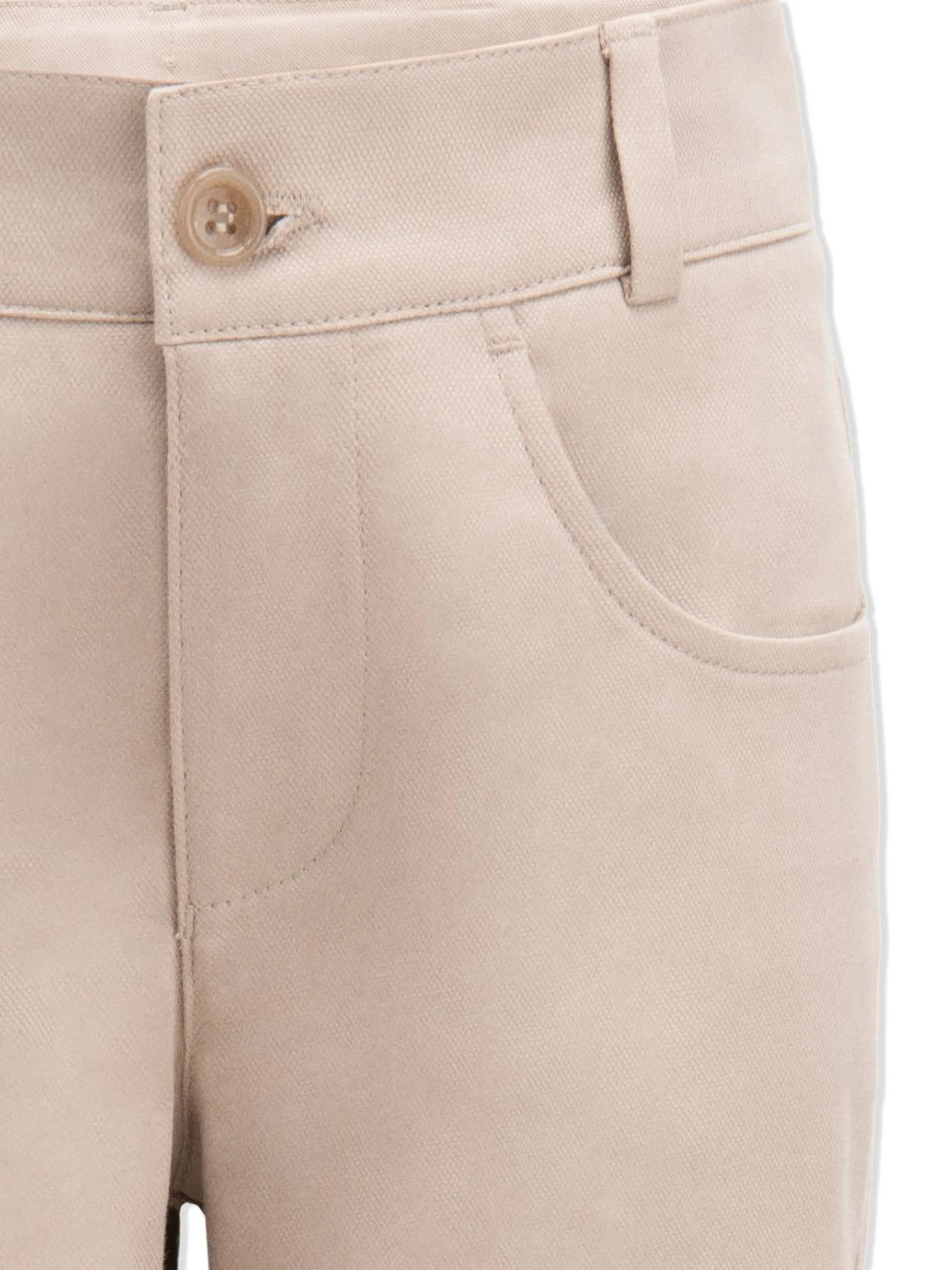 Бежевый, эластичный хлопок, средняя посадка, ширинка на пуговицах, петли для ремня, пять карманов и прямой крой.