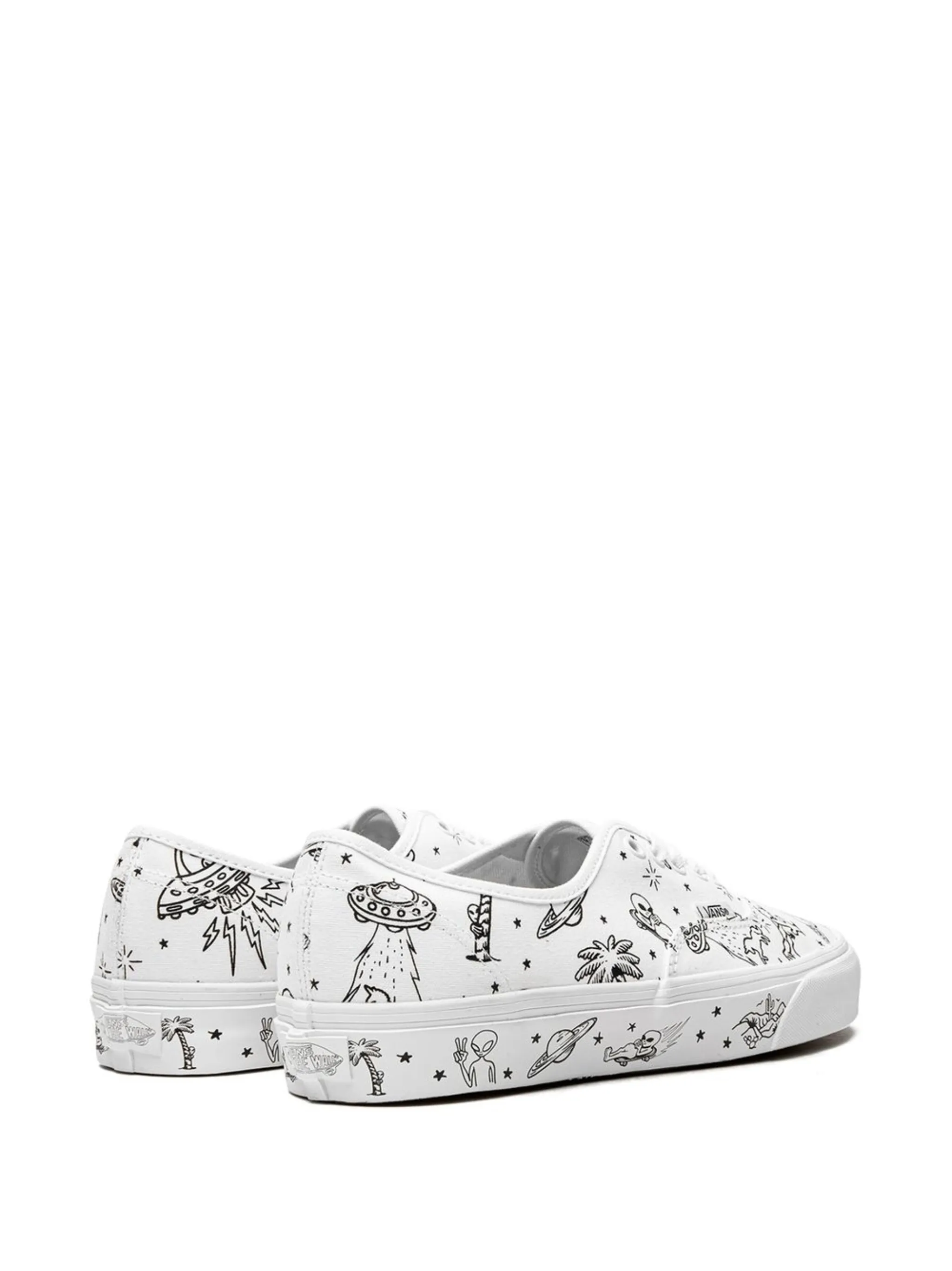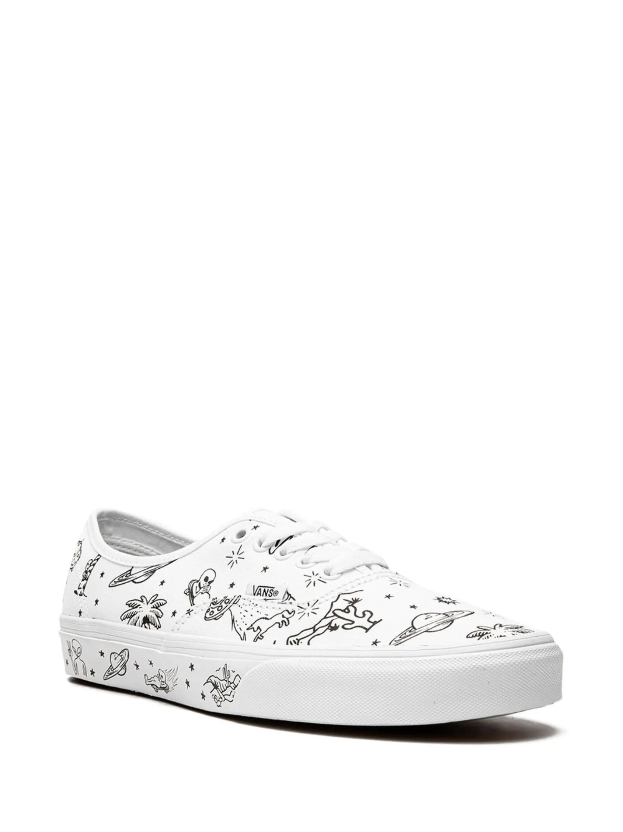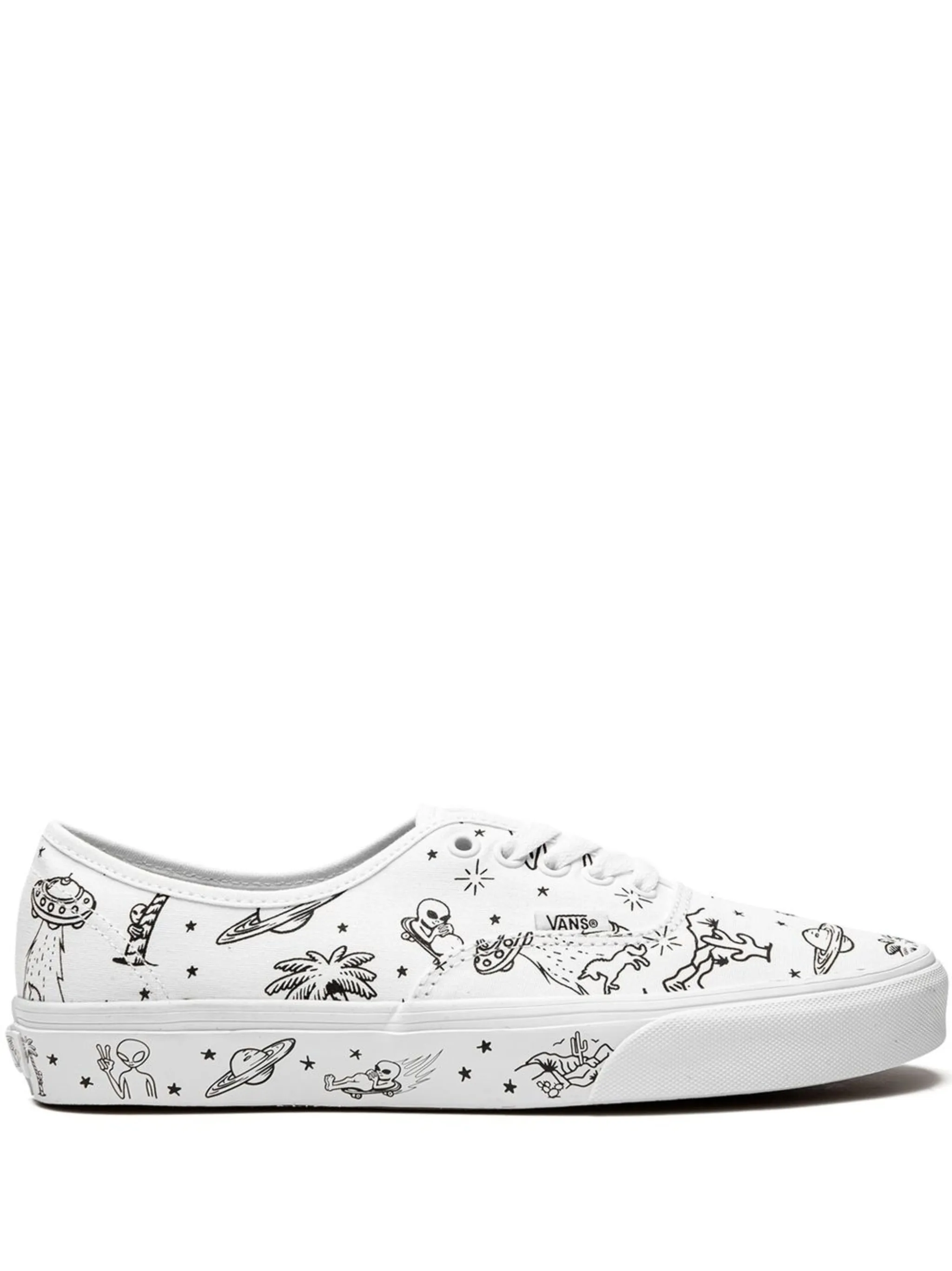 Белый, парусина, нашивка с логотипом сбоку, сплошной графичный принт, закругленный носок, шнуровка спереди, стелька с логотипом и плоская резиновая подошва.