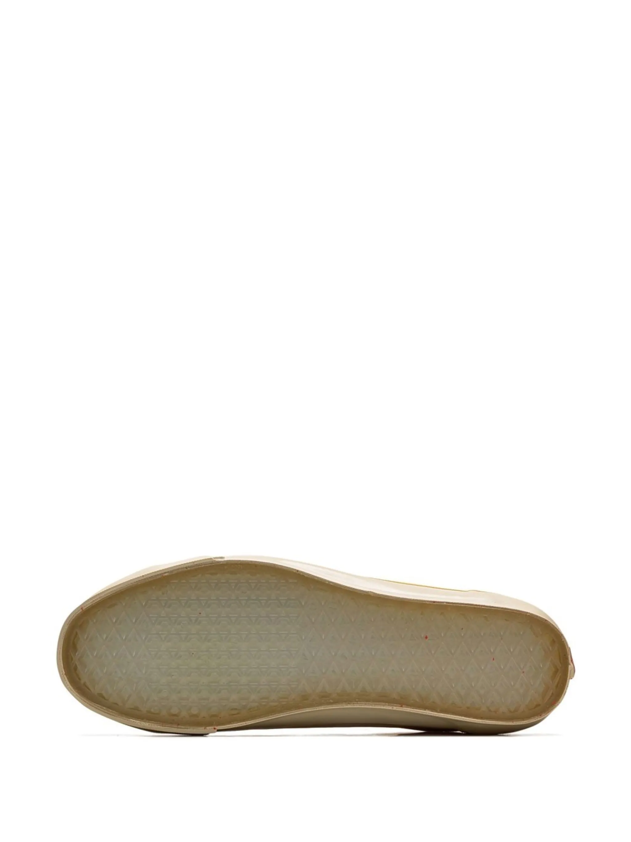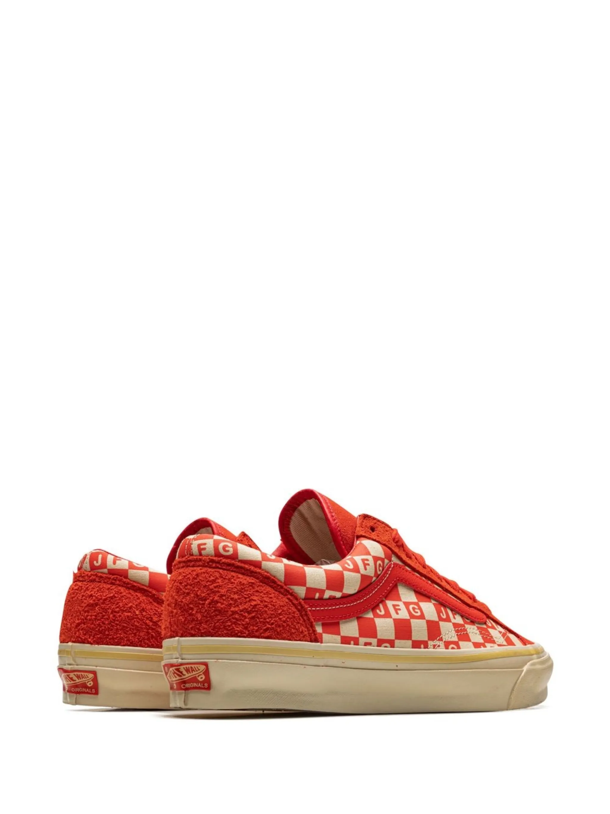 Ярко-красный, белый, парусина, замша, вставки, принт в шахматную клетку, закругленный носок, плоская резиновая подошва и шнуровка спереди.