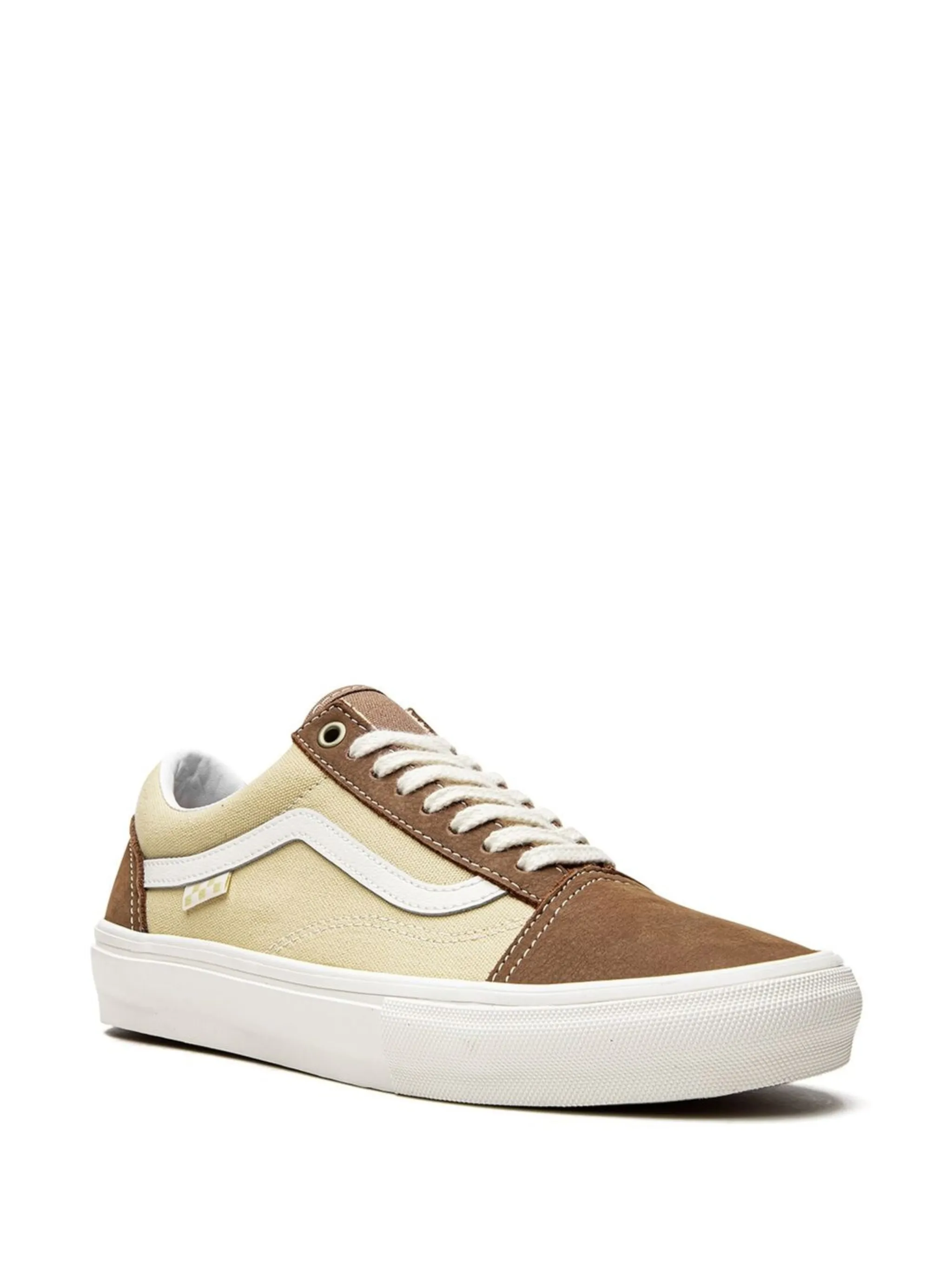 Коричневый, бежевый, белый, замша, вставки, полоска сбоку, закругленный носок, шнуровка спереди и резиновая подошва.