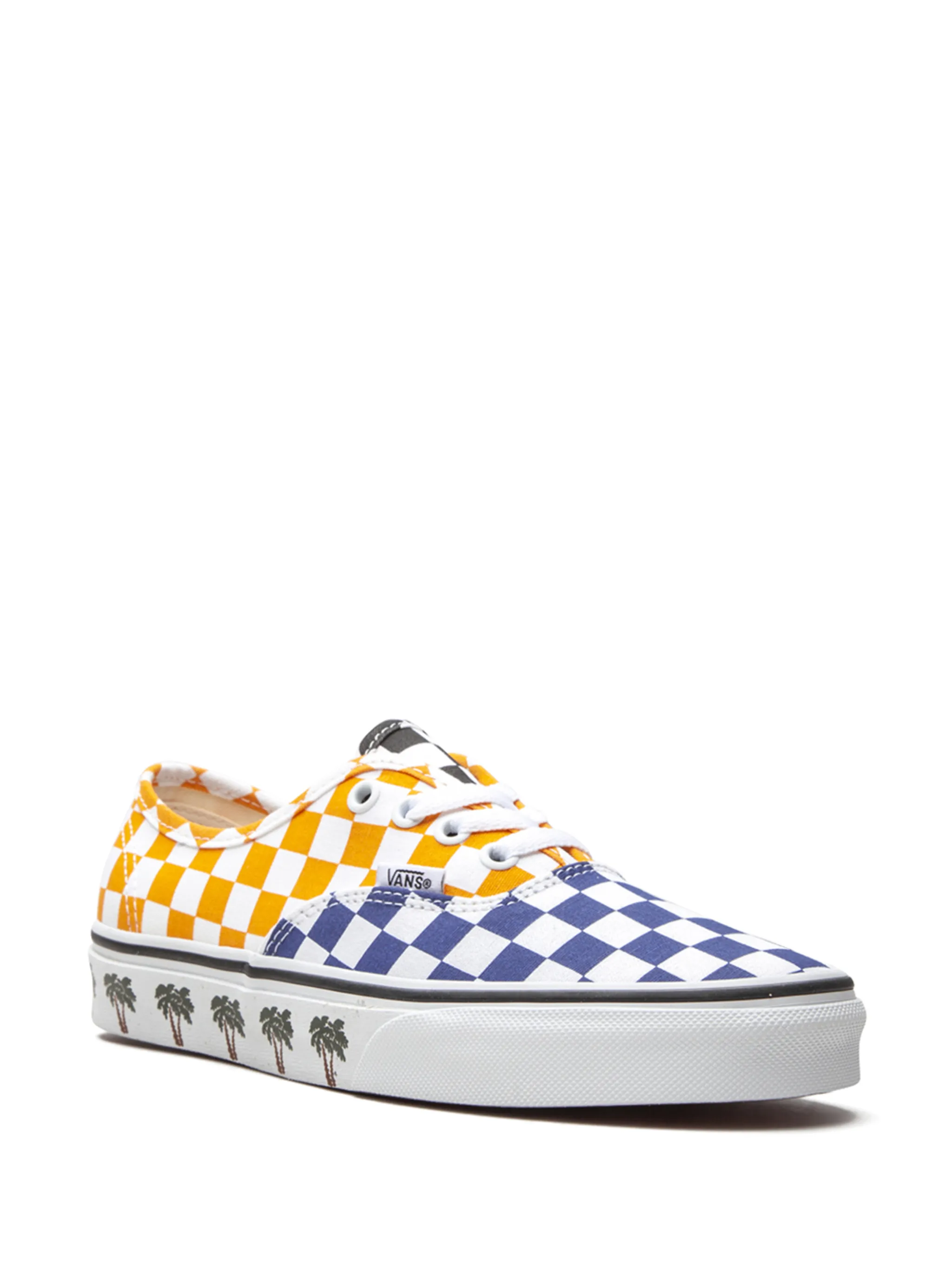 Закругленный носок, плоская резиновая подошва, шнуровка спереди, стелька с логотипом и принт в шахматную клетку.