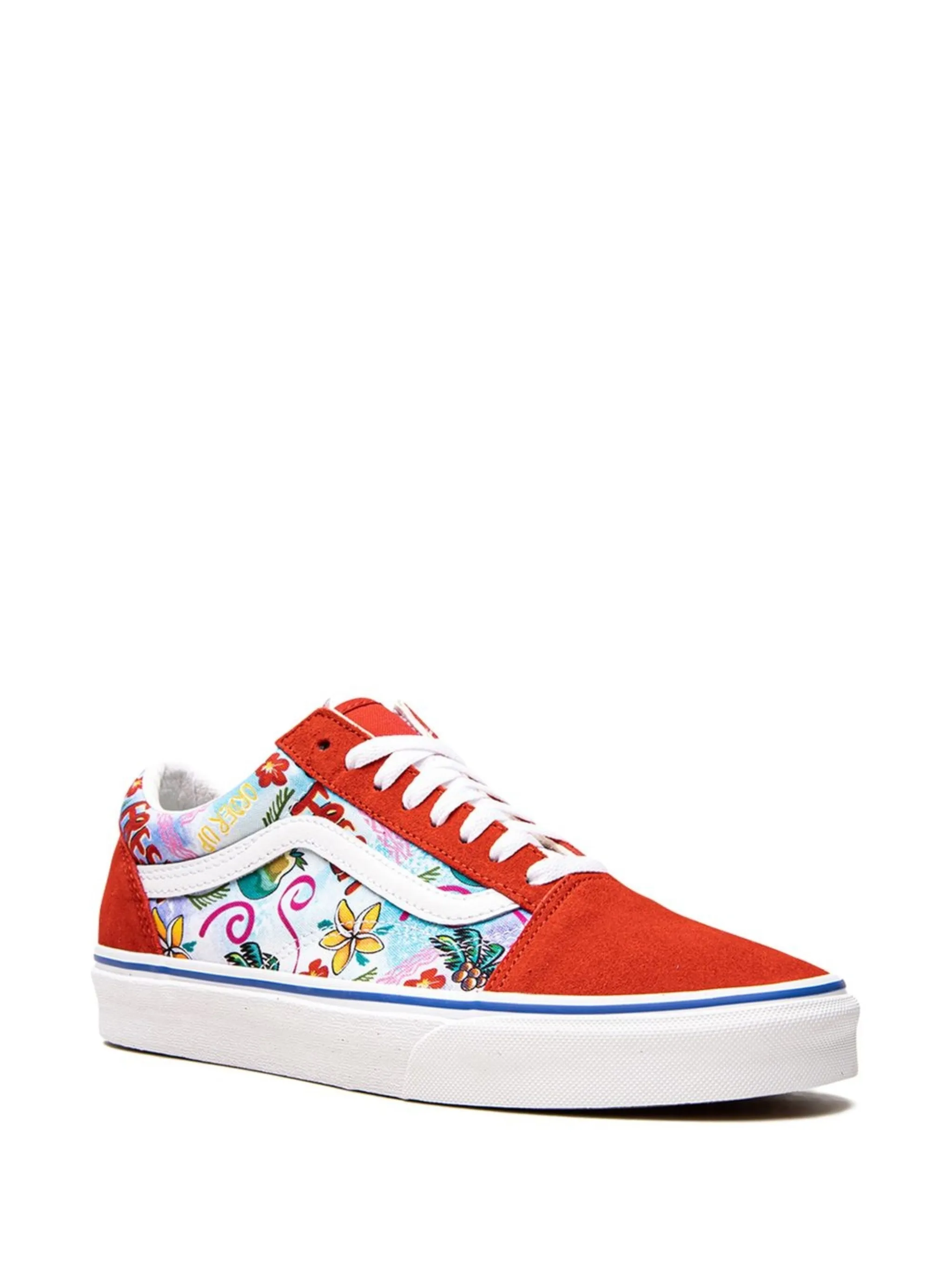 Красный, замша, кожа, полоска сбоку, сплошной графичный принт, закругленный носок, шнуровка спереди, стелька с логотипом и плоская резиновая подошва.