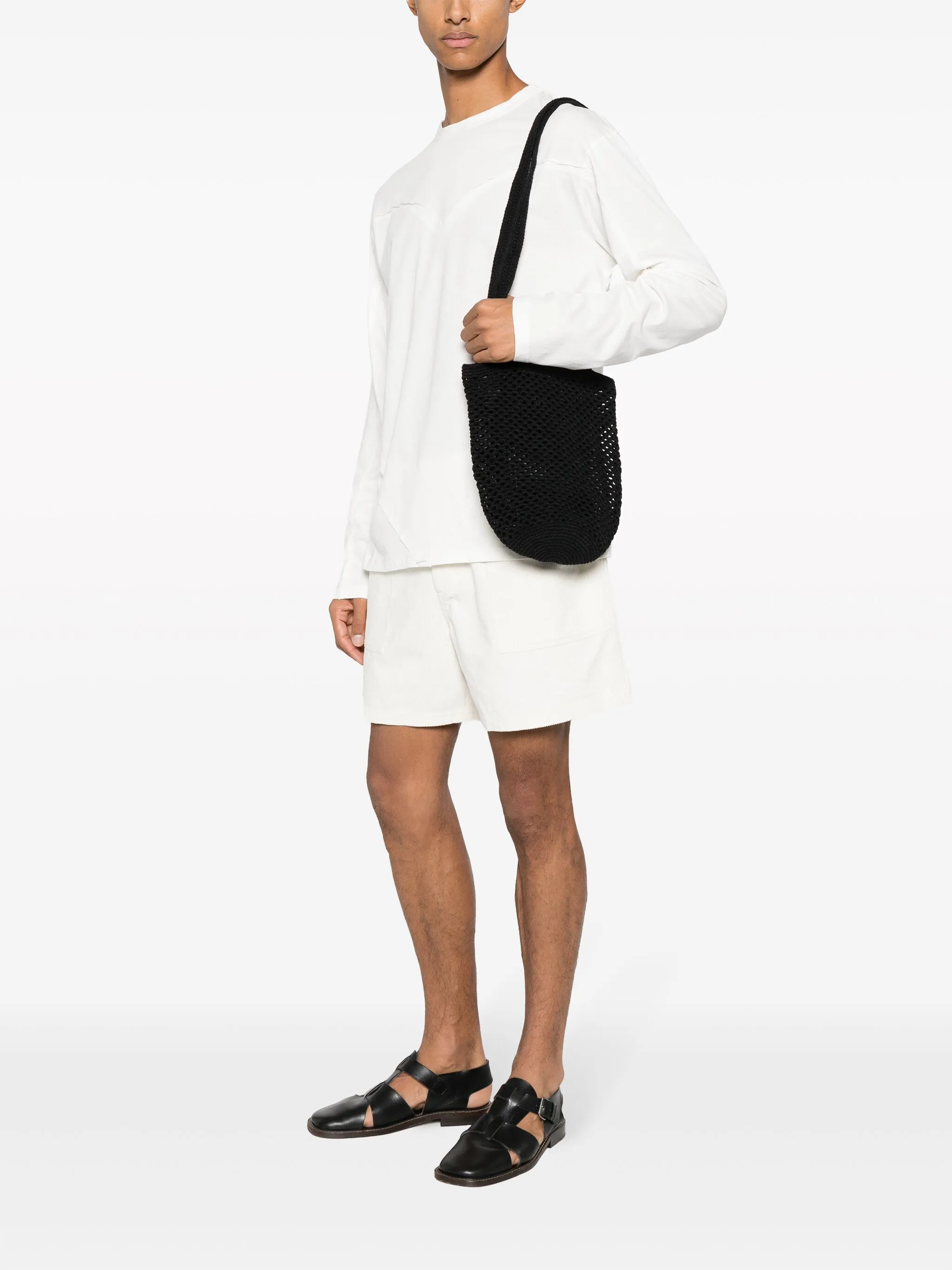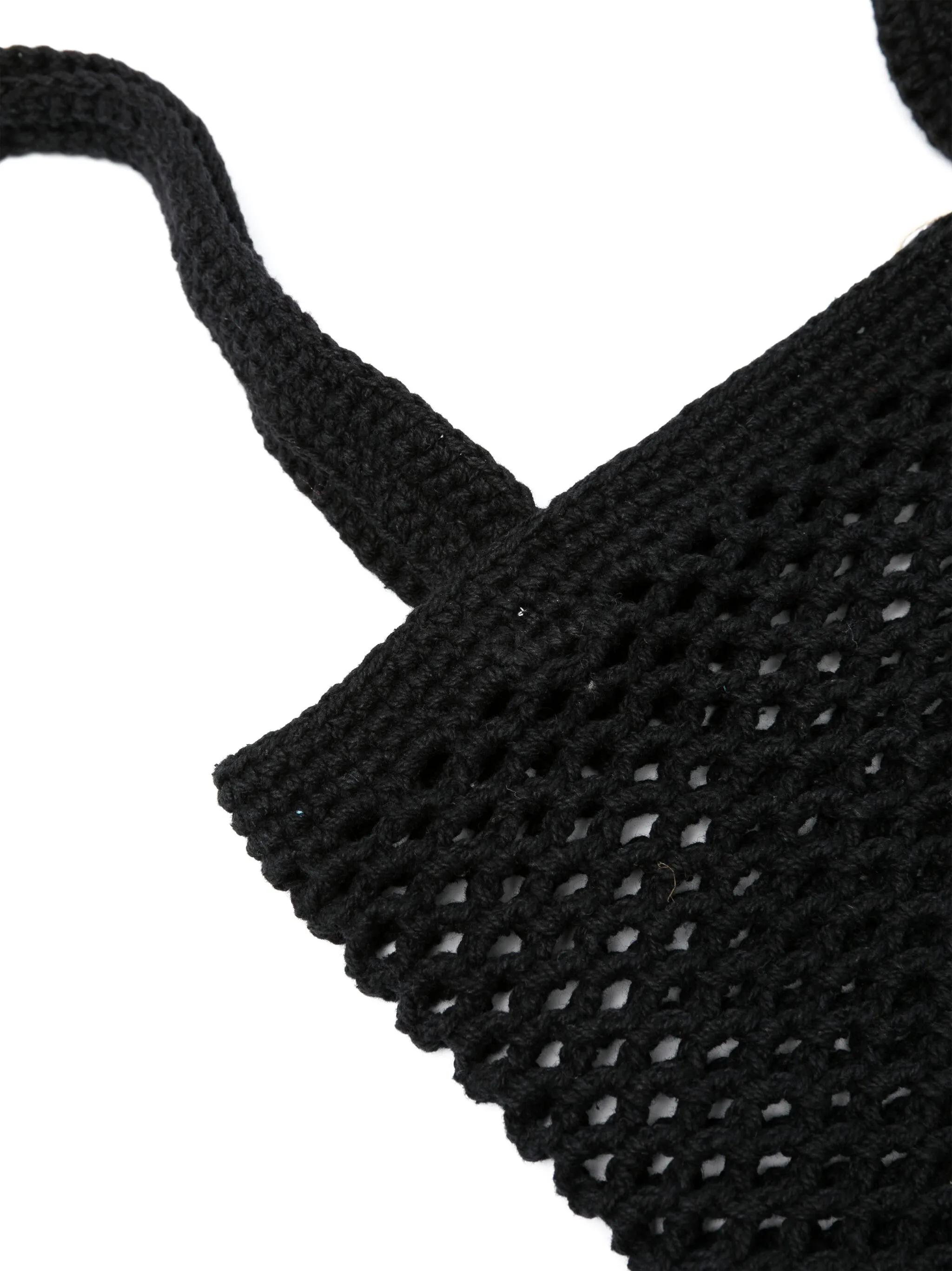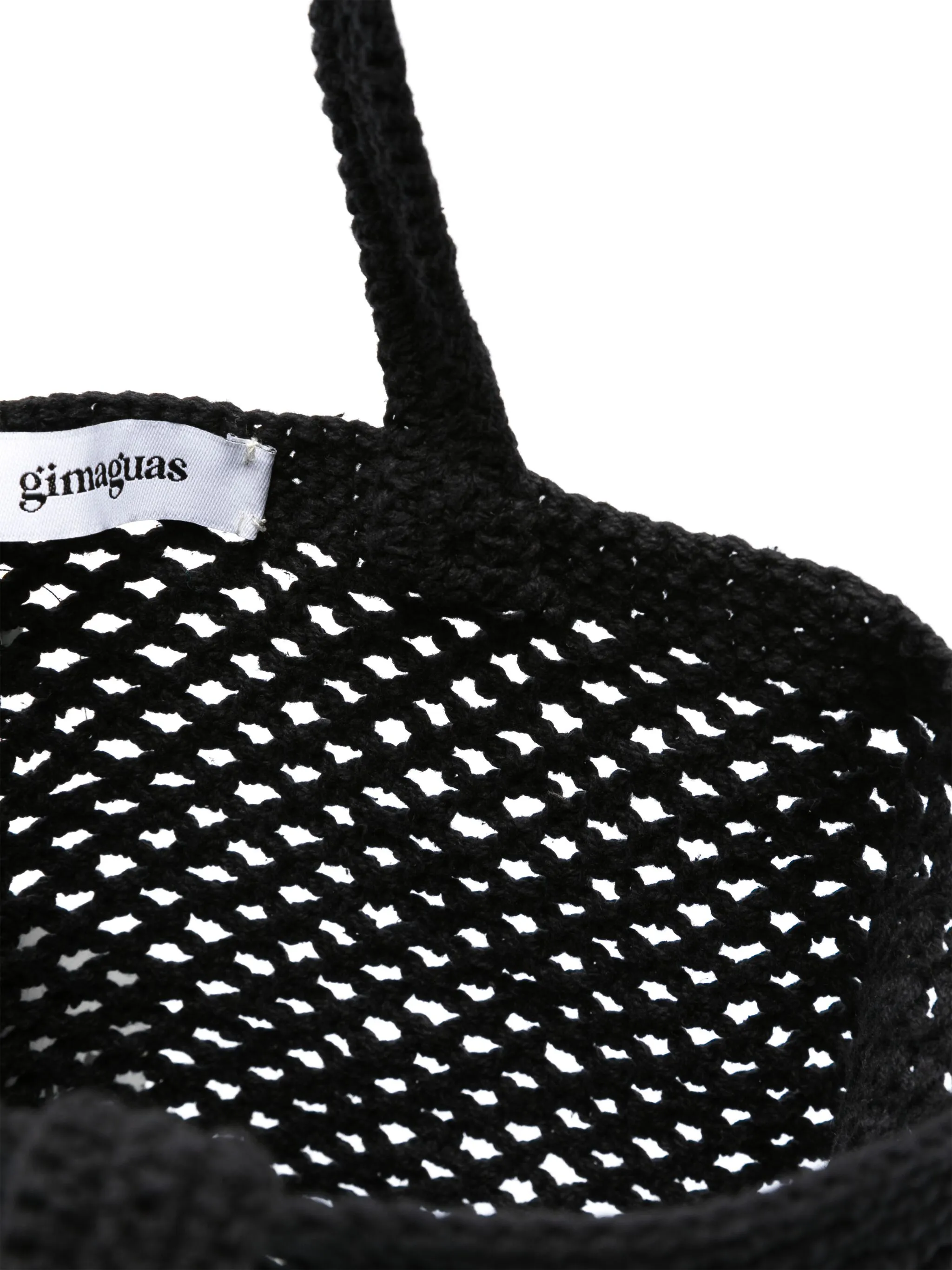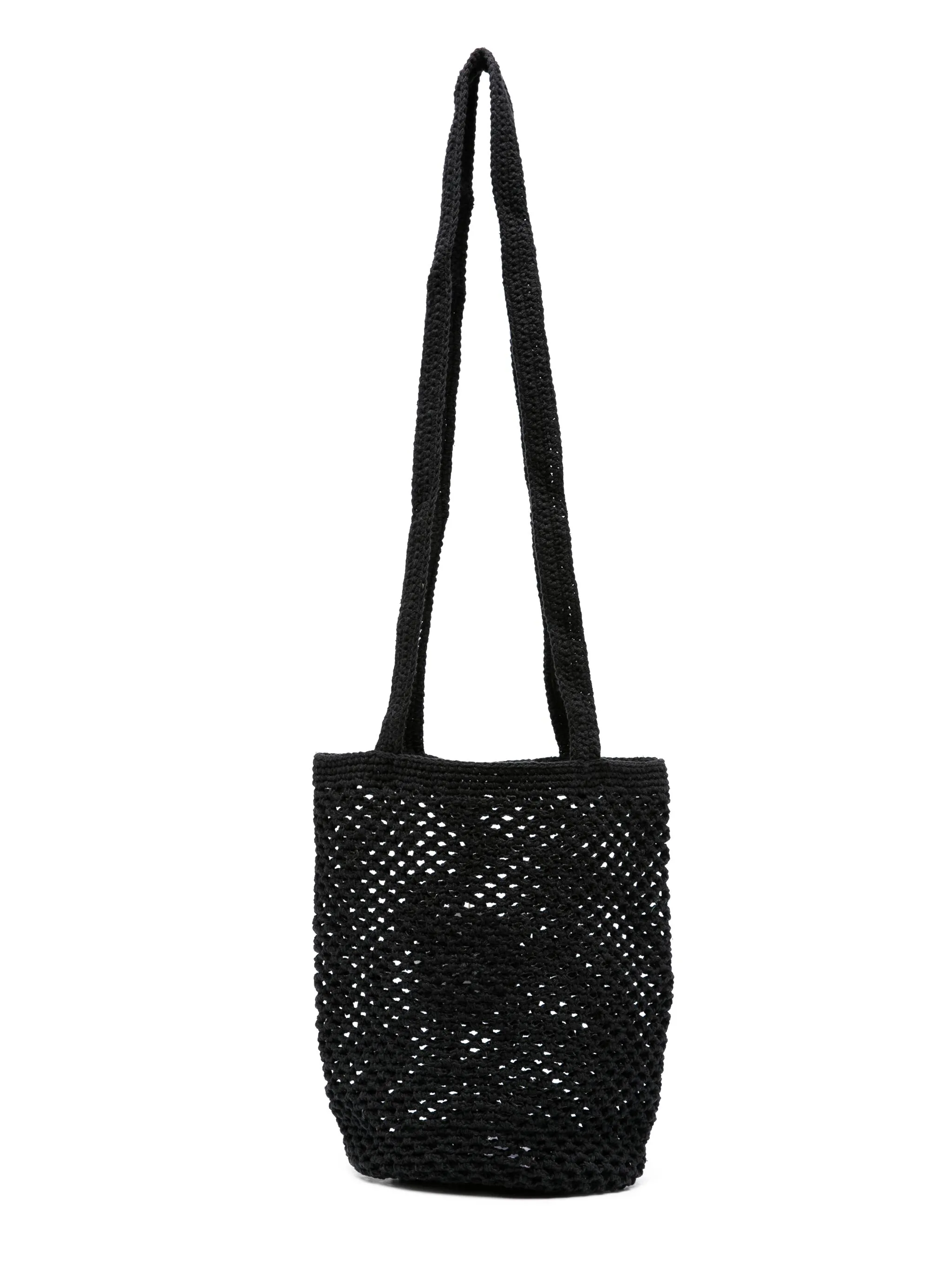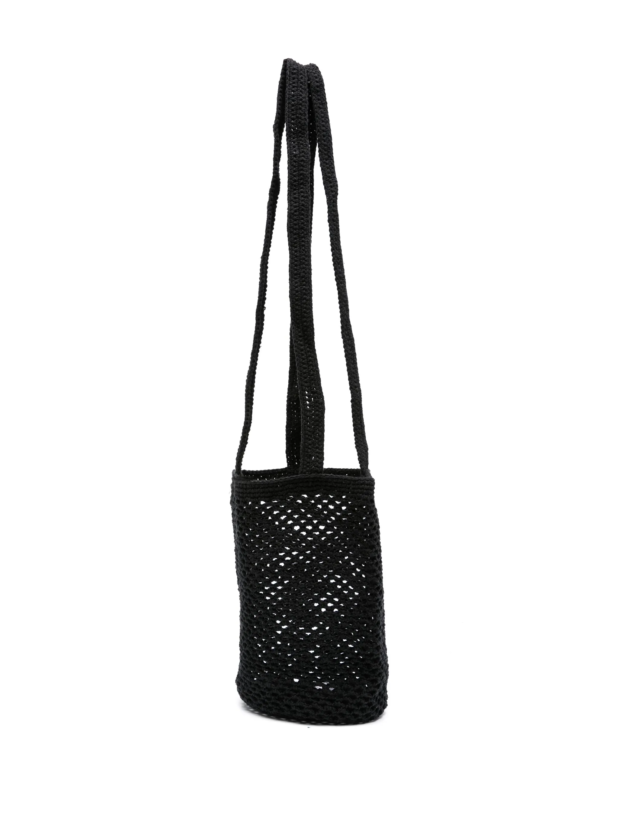 Черный, хлопок, крупная вязка, ажурная вязка, две длинные верхние ручки, нашивка с логотипом внутри, основное отделение и объемная модель.