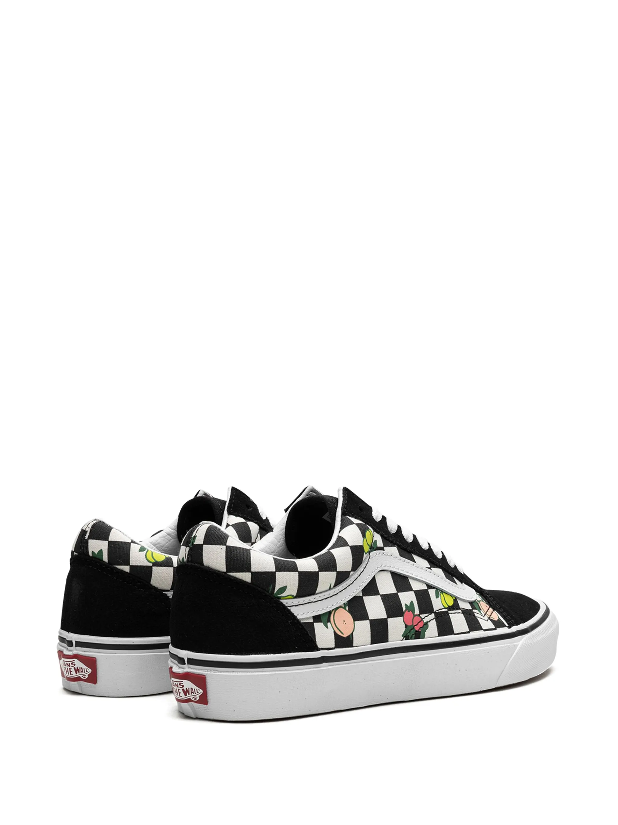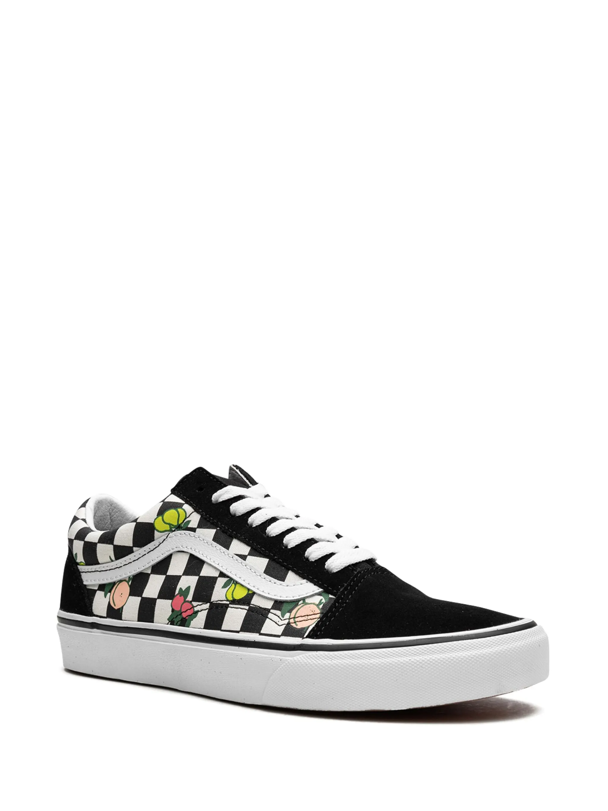 Черный, замша, парусина, принт с изображением фруктов, принт в шахматную клетку, полоска сбоку, закругленный носок, шнуровка спереди, стелька с логотипом и резиновая подошва.
