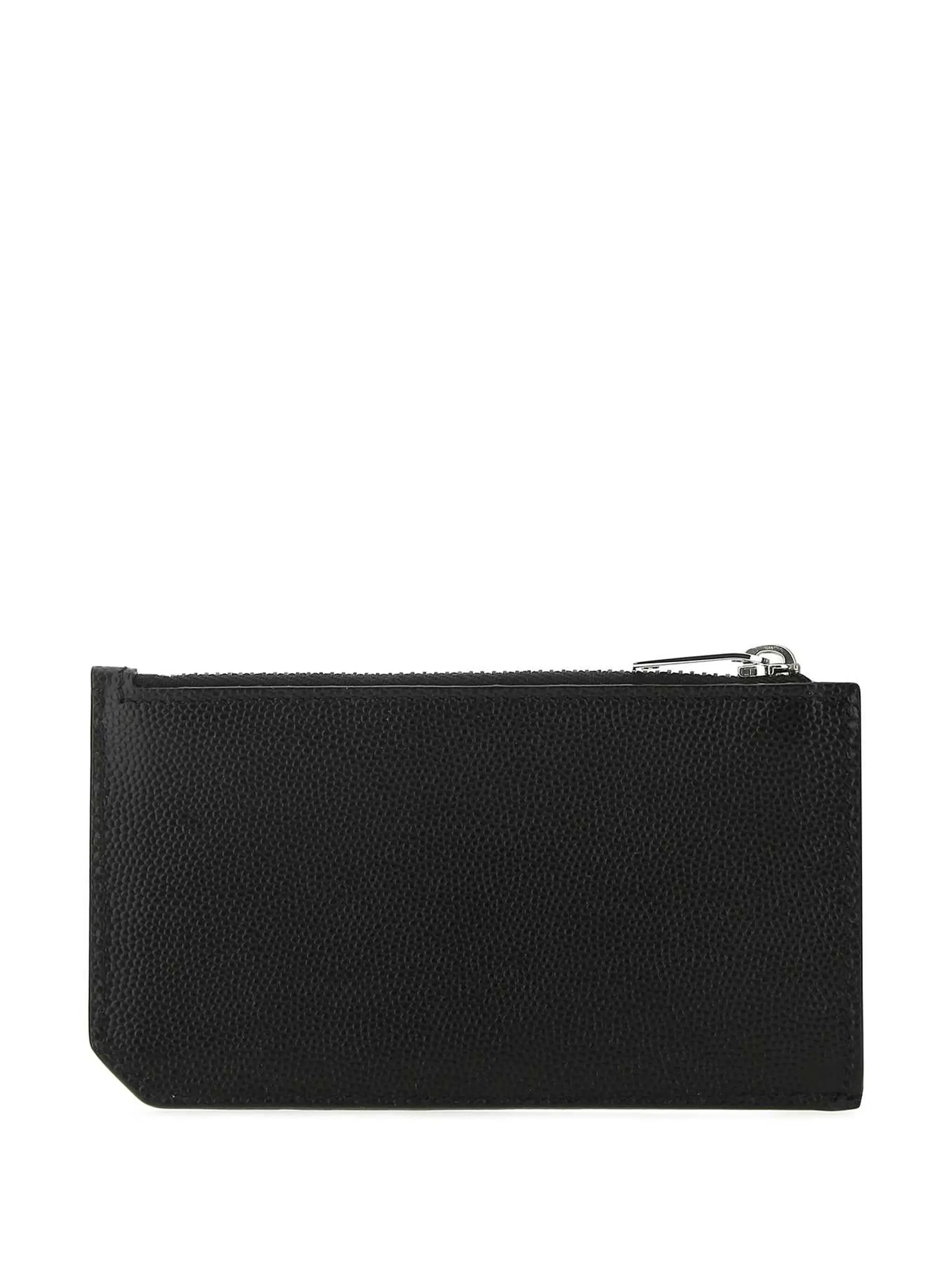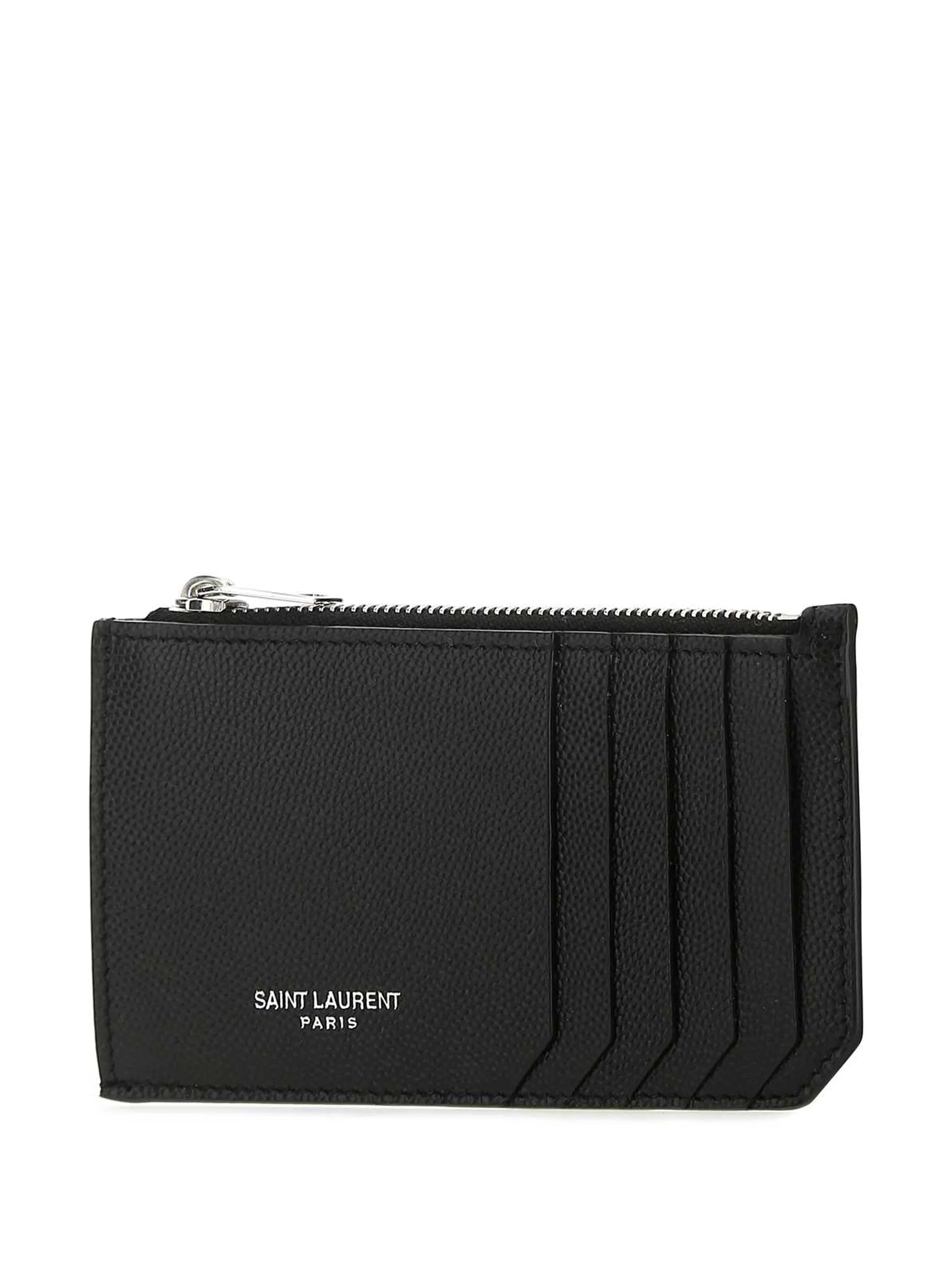 Черная кожаная визитница 'Classic Fragments' от Saint Laurent(Сен Лоран). Застежка на молнии сверху, тисненый логотип спереди, несколько отделений для карточек, внутренняя бляшка с логотипом.