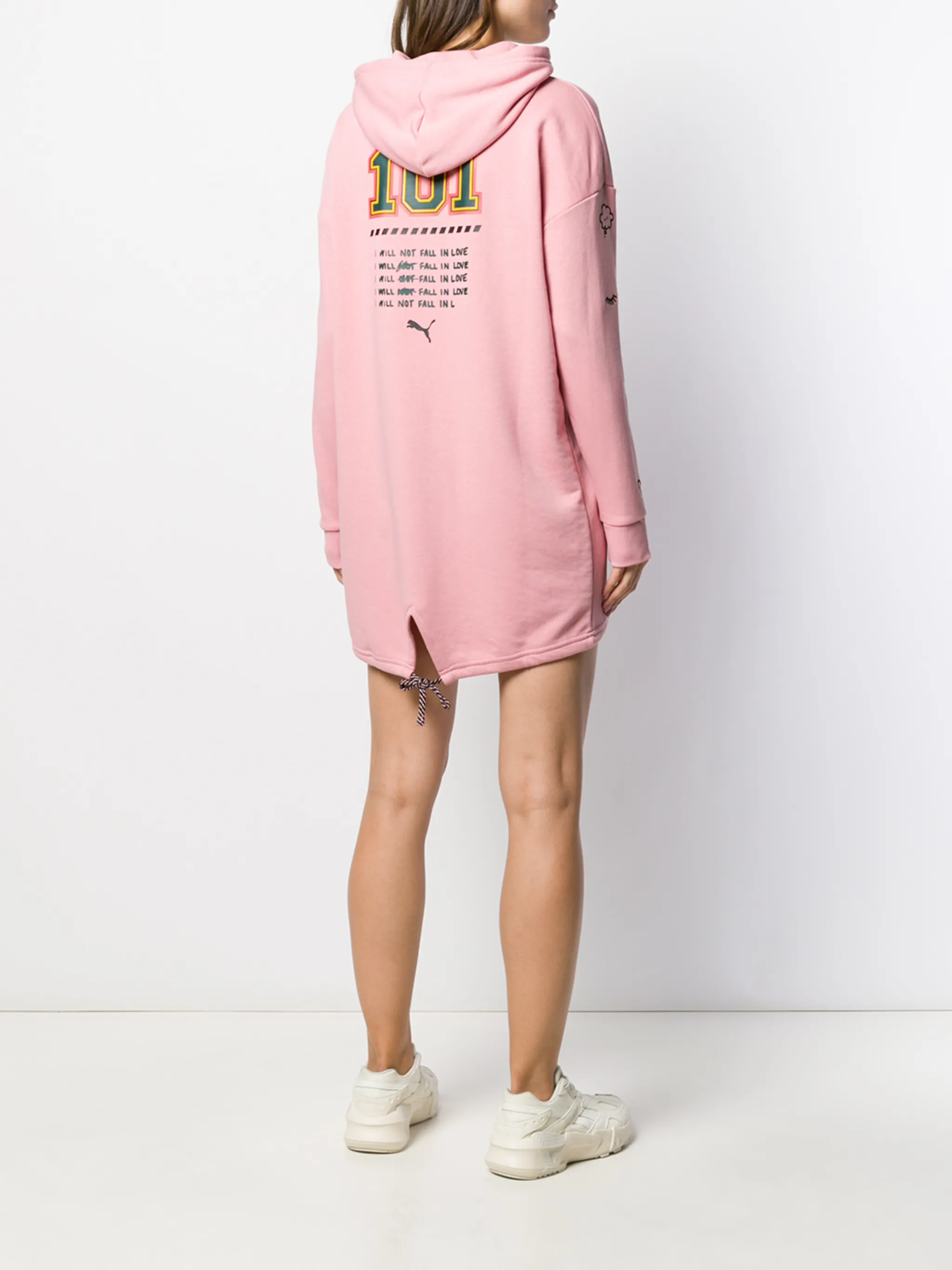 Платье-толстовка с капюшоном от Puma (Пума). Капюшон, затягивающийся на шнурок, приспущенные плечи, длинные рукава, принт с логотипом и прямой подол.