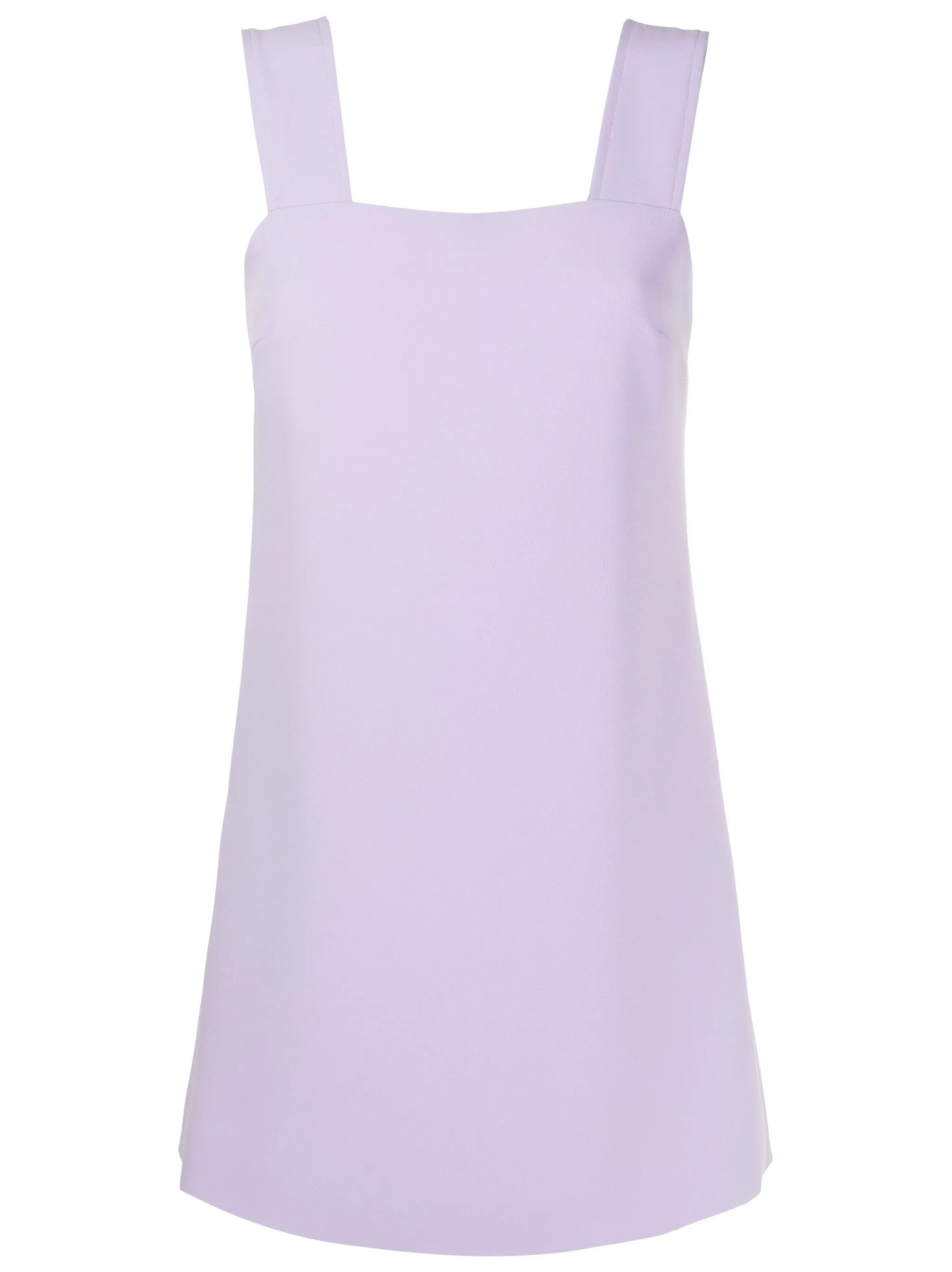 Лиловый, квадратный вырез, застежка на молнии сзади, широкие бретели, без рукавов, прямой подол и длина до бедер.