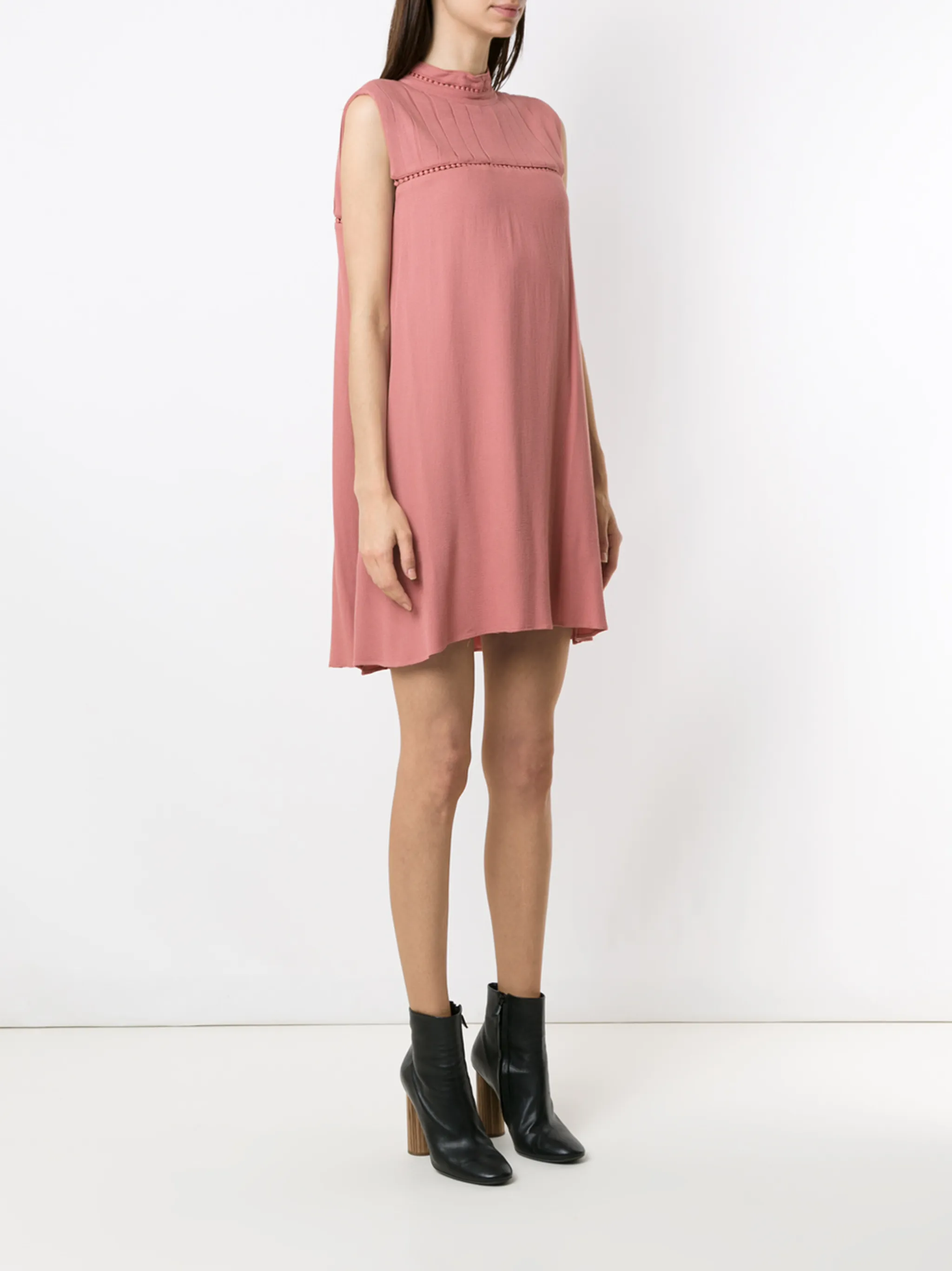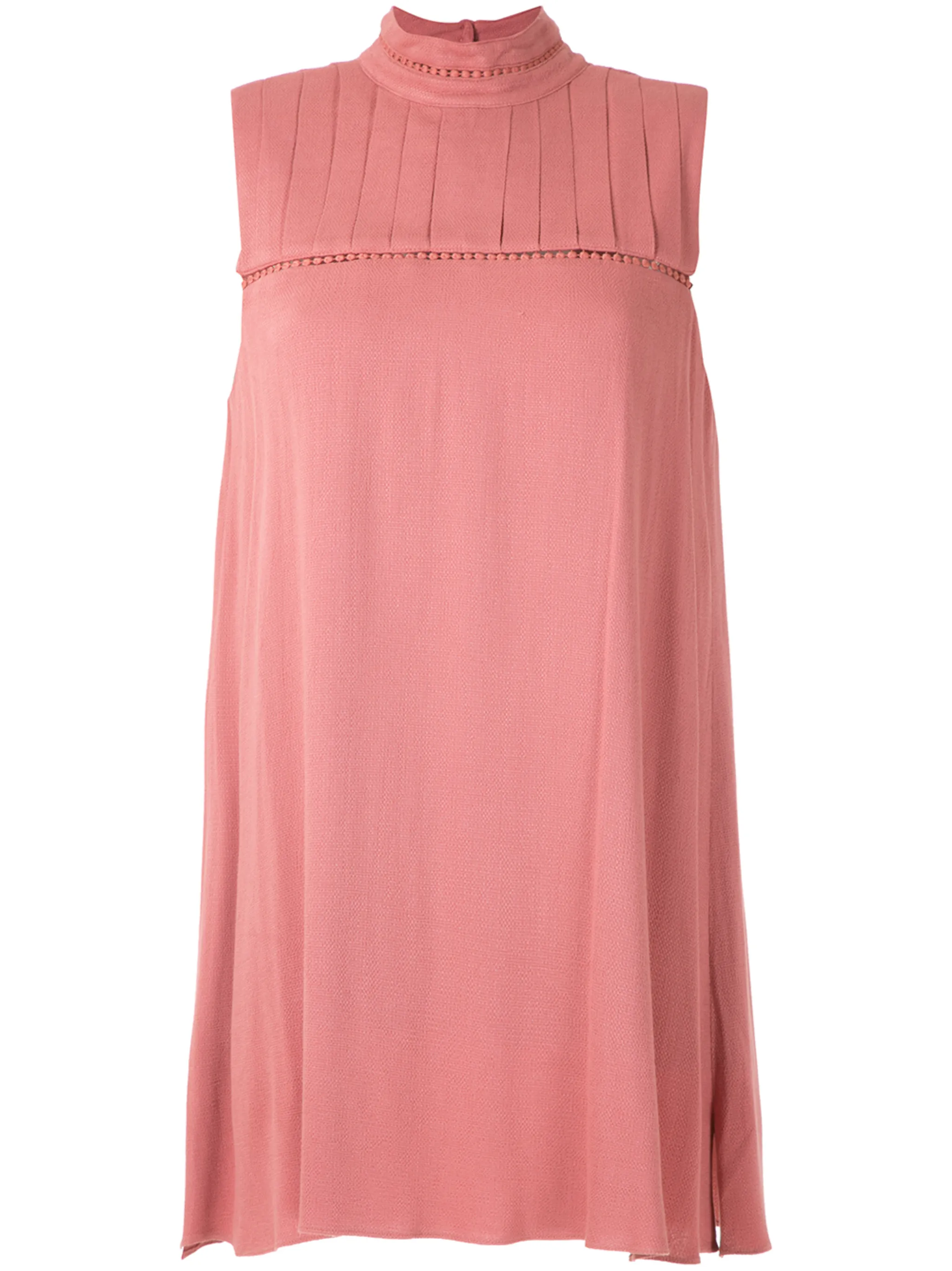 Расклешенный крой, плиссировка, воротник-стойка, застежка на крючок сзади и без рукавов.