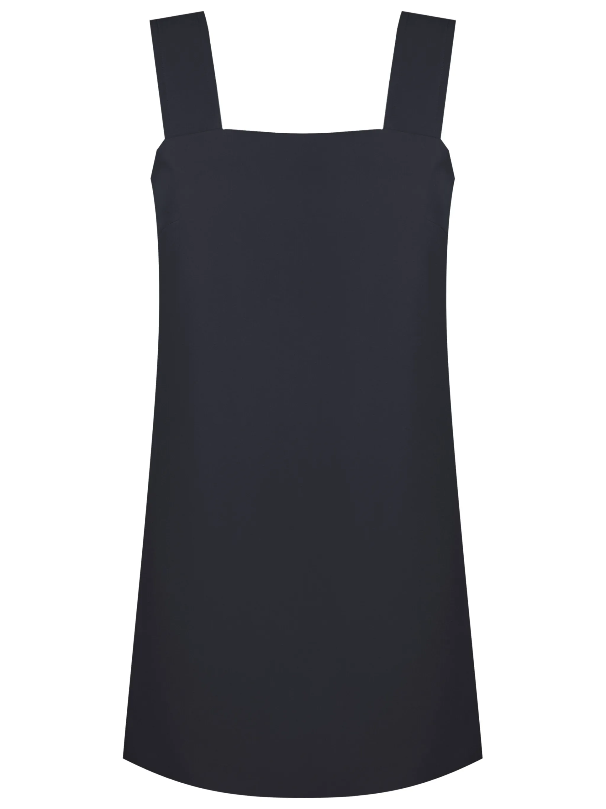 Темно-серый, квадратный вырез, застежка на молнии сзади, широкие бретели, без рукавов, прямой подол и длина до бедер.